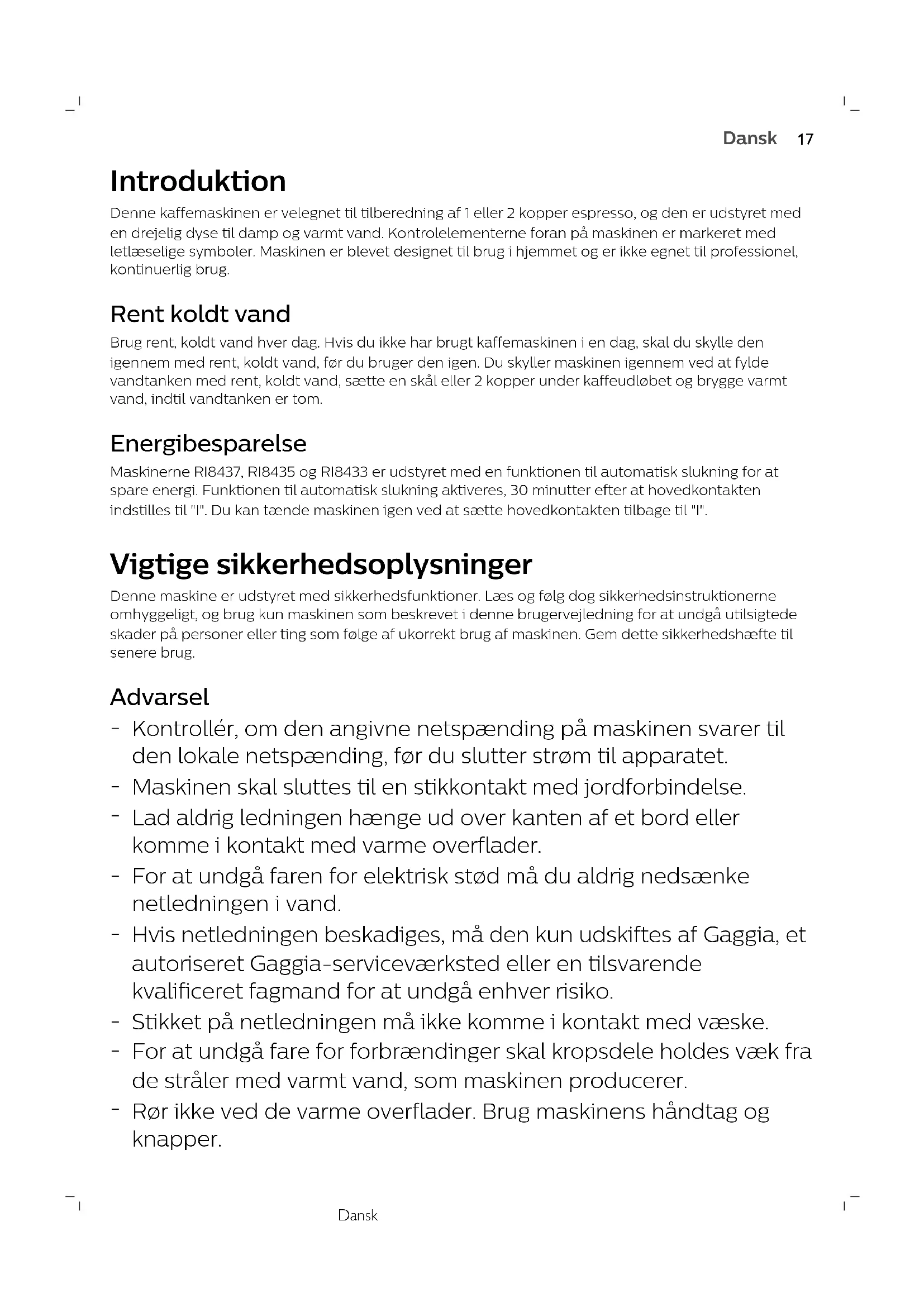 EnglishDansk Introduktion Denne kaffemaskinen er velegnet til tilberedning af 1 eller 2 kopper espresso, og den er udstyret meden drejelig dyse til damp og varmt vand. Kontrolelementerne foran på maskinen er markeret medletlæselige symboler. Maskinen er blevet designet til brug i hjemmet og er ikke egnet til professionel,kontinuerlig brug. Rent koldt vand Brug rent, koldt vand hver dag. Hvis du ikke har brugt kaffemaskinen i en dag, skal du skylle denigennem med rent, koldt vand, før du bruger den igen. Du skyller maskinen igennem ved at fyldevandtanken med rent, koldt vand, sætte en skål eller 2 kopper under kaffeudløbet og brygge varmtvand, indtil vandtanken er tom. Energibesparelse Maskinerne RI8437, RI8435 og RI8433 er udstyret med en funktionen til automatisk slukning for atspare energi. Funktionen til automatisk slukning aktiveres, 30 minutter efter at hovedkontaktenindstilles til "I". Du kan tænde maskinen igen ved at sætte hovedkontakten tilbage til "I". Vigtige sikkerhedsoplysninger Denne maskine er udstyret med sikkerhedsfunktioner. Læs og følg dog sikkerhedsinstruktionerneomhyggeligt, og brug kun maskinen som beskrevet i denne brugervejledning for at undgå utilsigtedeskader på personer eller ting som følge af ukorrekt brug af maskinen. Gem dette sikkerhedshæfte tilsenere brug. Advarsel
