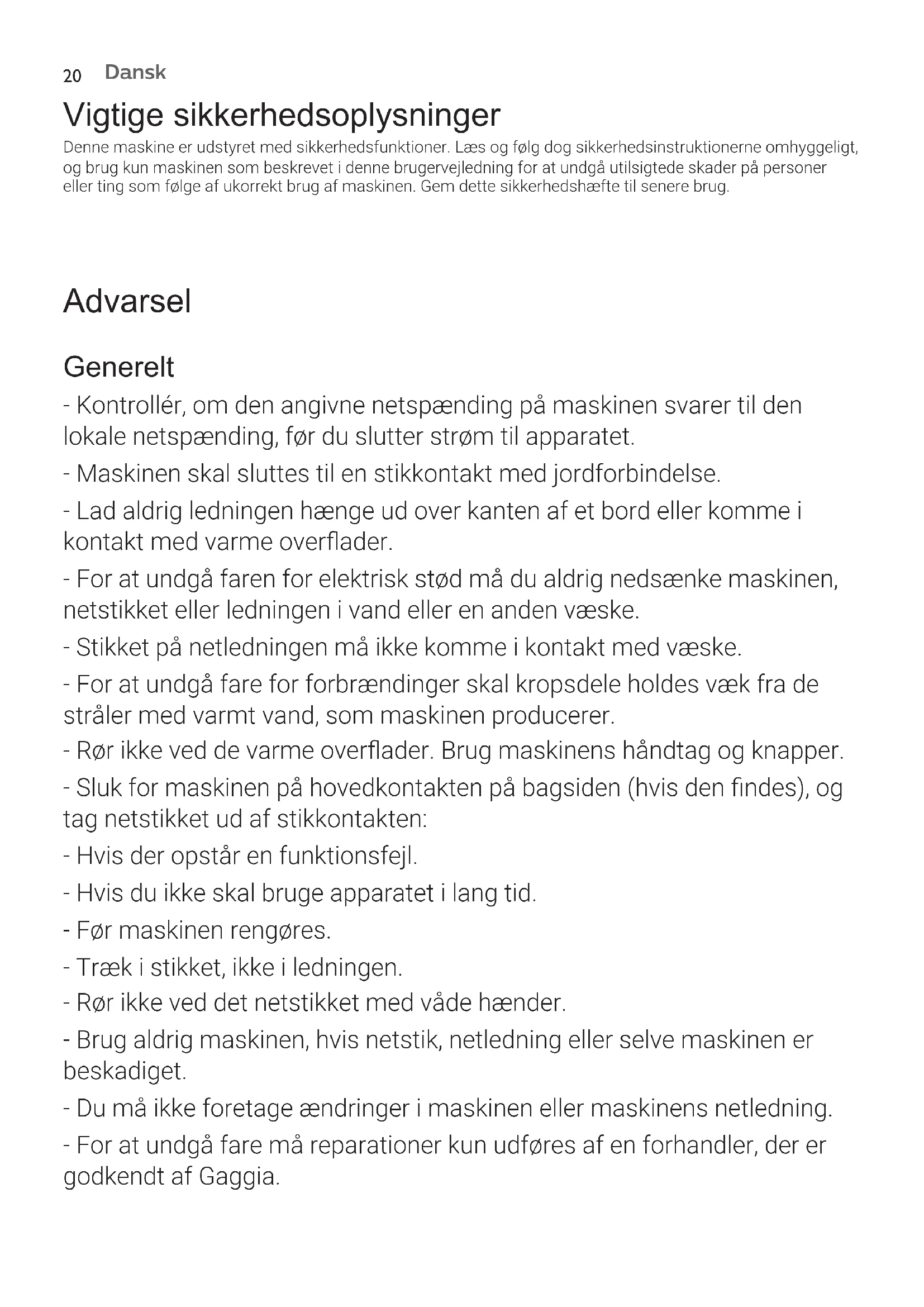 Vigtige sikkerhedsoplysninger Denne maskine er udstyret med sikkerhedsfunktioner. Læs og følg dog sikkerhedsinstruktionerne omhyggeligt, og brug kun maskinen som beskrevet i denne brugervejledning for at undgå utilsigtede skader på personer eller ting som følge af ukorrekt brug af maskinen. Gem dette sikkerhedshæfte til senere brug. Advarsel Generelt - Kontrollér, om den angivne netspænding på maskinen svarer til den lokale netspænding, før du slutter strøm til apparatet. - Maskinen skal sluttes til en stikkontakt med jordforbindelse. - Lad aldrig ledningen hænge ud over kanten af et bord eller komme i kontakt med varme overader. - For at undgå faren for elektrisk stød må du aldrig nedsænke maskinen, netstikket eller ledningen i vand eller en anden væske. - Stikket på netledningen må ikke komme i kontakt med væske. - For at undgå fare for forbrændinger skal kropsdele holdes væk fra de stråler med varmt vand, som maskinen producerer. - Rør ikke ved de varme overader. Brug maskinens håndtag og knapper. - Sluk for maskinen på hovedkontakten på bagsiden (hvis den ndes), og tag netstikket ud af stikkontakten: - Hvis der opstår en funktionsfejl. - Hvis du ikke skal bruge apparatet i lang tid. - Før maskinen rengøres. - Træk i stikket, ikke i ledningen. - Rør ikke ved det netstikket med våde hænder. - Brug aldrig maskinen, hvis netstik, netledning eller selve maskinen er beskadiget. - Du må ikke foretage ændringer i maskinen eller maskinens netledning. - For at undgå fare må reparationer kun udføres af en forhandler, der er godkendt af Gaggia.21 Dansk - Maskinen må ikke bruges af børn under 8 år. - Denne maskine kan bruges af børn fra 8 år og opefter og personer med reducerede fysiske, sensoriske eller mentale evner eller manglende erfaring og viden, hvis de er blevet instrueret i sikker brug af maskinen og forstår de medfølgende risici. - Rengøring og vedligeholdelse må ikke foretages af børn, medmindre de er over 8 år gamle og under opsyn. - Hold maskinen og ledningen uden for rækkevidde af børn under 8 år. - Apparatet skal holdes uden for børns rækkevidde for at sikre, at de ikke kan komme til at lege med maskinen. - Vær forsigtig, når du dispenserer varmt vand. Dispensering kan være efterfulgt af små stråler varmt vand. Vent, indstil dispenseringscyklussen er færdig, før du fjerner varmtvandsudløbet. Forsigtig Generelt - Denne maskine er kun beregnet til normal anvendelse i hjemmet. Den er ikke beregnet til brug i miljøer som f.eks. personalekøkkener i butikker, på kontorer, på gårde eller andre arbejdspladser. - Stil altid maskinen på et adt og stabilt underlag. Den skal altid være placeret opretstående, også under transport. - Stil ikke maskinen på en varmeplade eller direkte ved siden af en varm ovn, et varmeapparat eller lignende varmekilder. - Hæld kun malet kaffet i den trykmonterede lterholder. Hvis der hældes kaffebønner, pulverkaffe, ikke ristede kaffebønner, eller et andet stof i holderen, kan det medføre skade på maskinen. I sådanne tilfælde er reparation ikke omfattet af garantien. - Lad maskinen køle ned, før der indsættes eller fjernes dele. Varmeaderne kan indeholde restvarme efter brug.Dansk