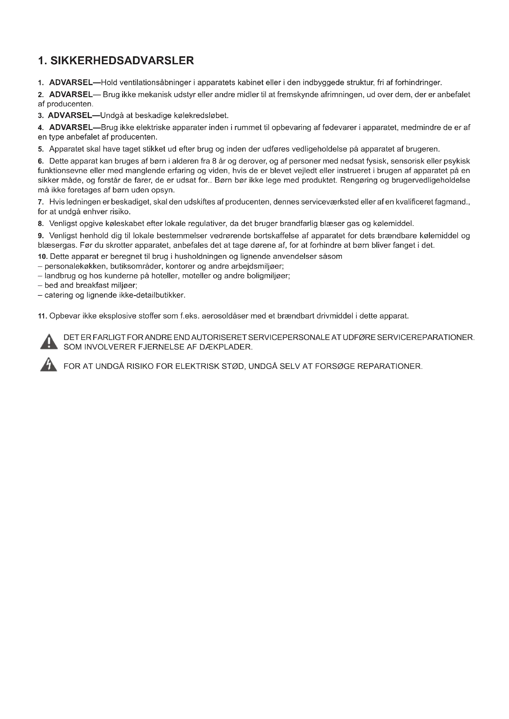 1. ADVARSEL—Hold ventilationsåbninger i apparatets kabinet eller i den indbyggede struktur, fri af forhindringer.