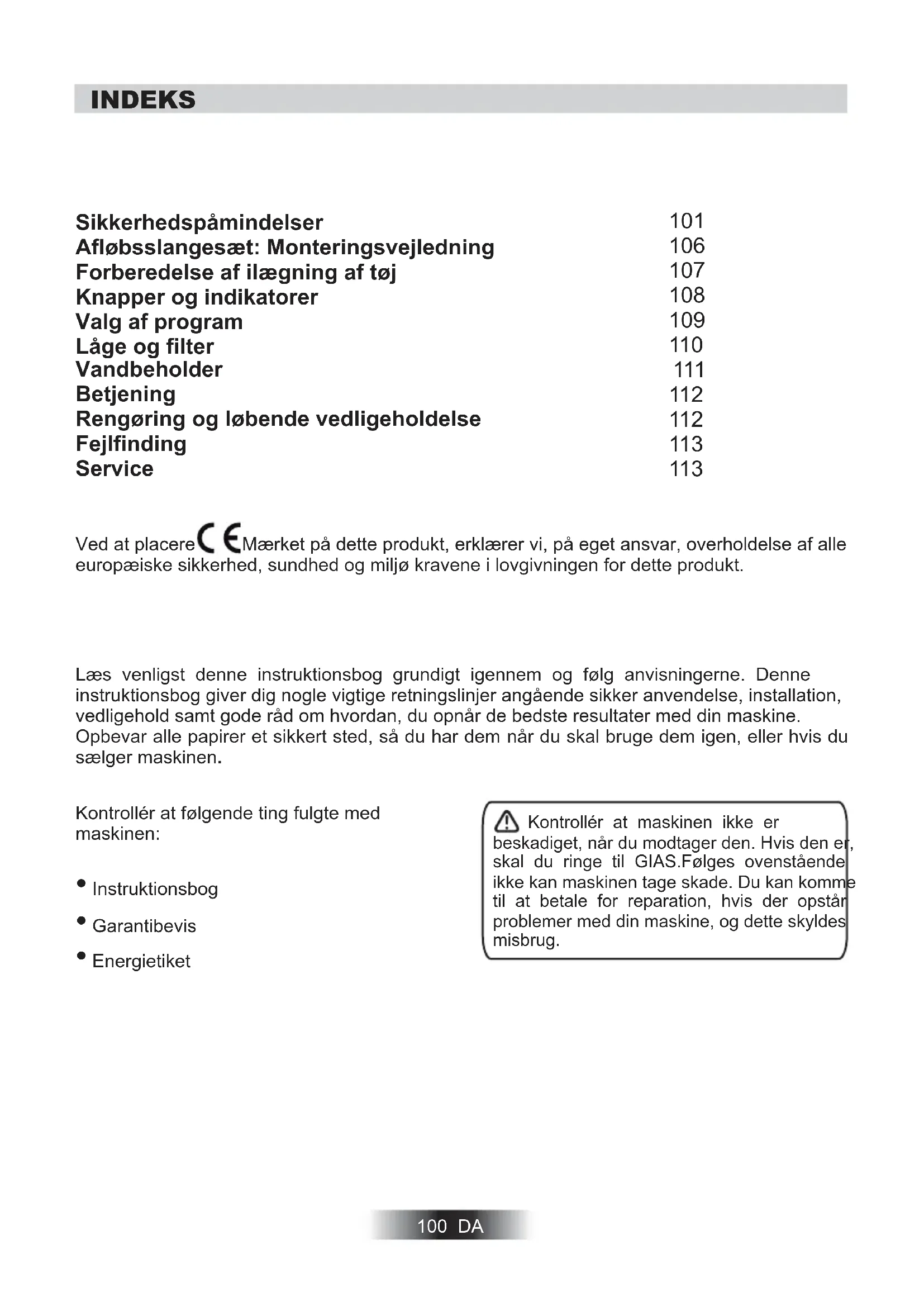 - Energietiket Læs venligst denne instruktionsbog grundigt igennem og følg anvisningerne. Denne instruktionsbog giver dig nogle vigtige retningslinjer angående sikker anvendelse, installation, vedligehold samt gode råd om hvordan, du opnår de bedste resultater med din maskine. Opbevar alle papirer et sikkert sted, så du har dem når du skal bruge dem igen, eller hvis du sælger maskinen. Kontrollér at maskinen ikke er beskadiget, når du modtager den. Hvis den er, skal du ringe til GIAS.Følges ovenstående ikke kan maskinen tage skade. Du kan komme til at betale for reparation, hvis der opstår problemer med din maskine, og dette skyldes misbrug. INDEKS Sikkerhedspåmindelser Afløbsslangesæt: Monteringsvejledning Forberedelse af ilægning af tøj Knapper og indikatorer Valg af program Låge og filter Vandbeholder Betjening Rengøring og løbende vedligeholdelse Fejlfinding Service Ved at placere Mærket på dette produkt, erklærer vi, på eget ansvar, overholdelse af alle europæiske sikkerhed, sundhed og miljø kravene i lovgivningen for dette produkt.