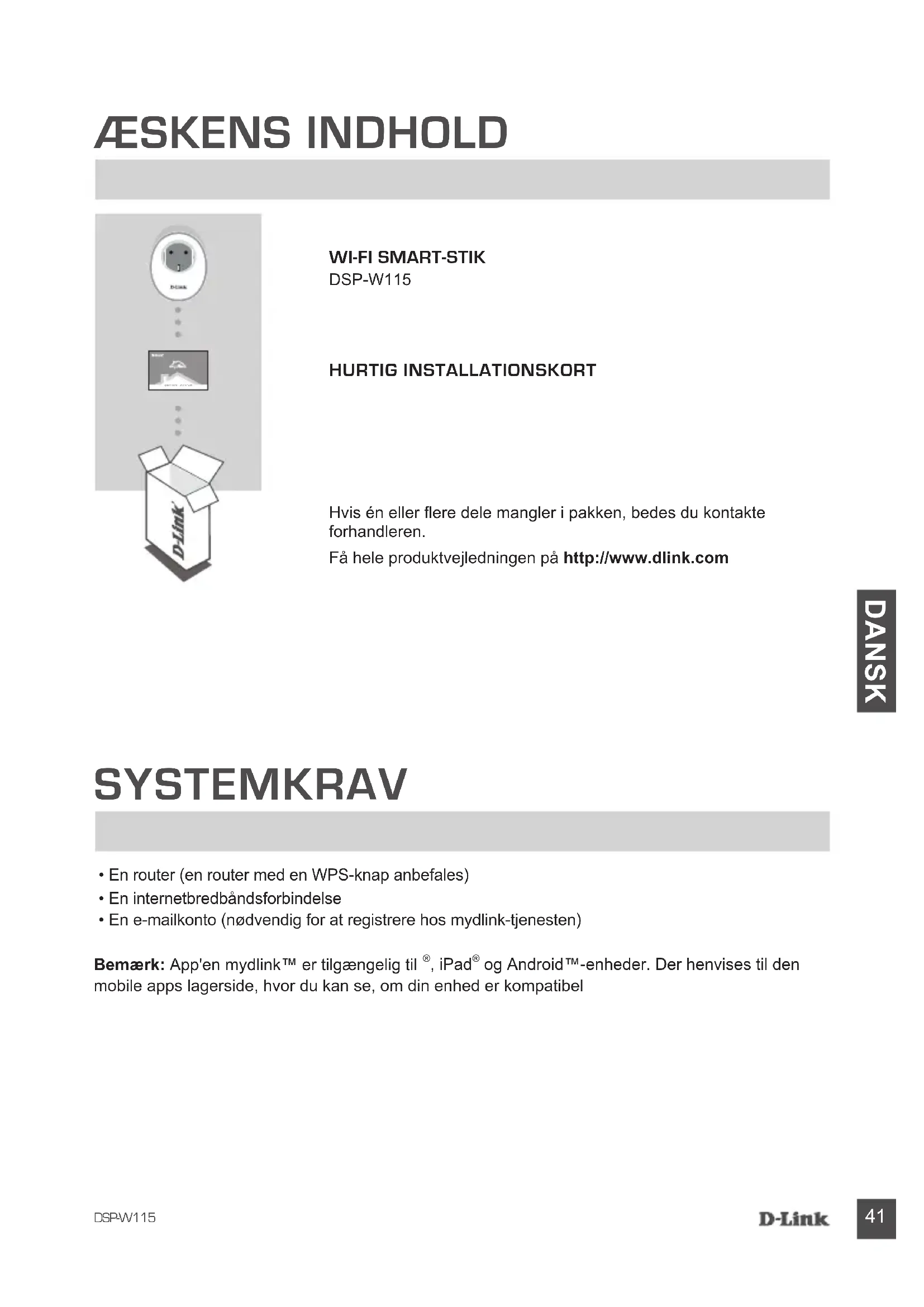og Android™-enheder. Der henvises til den mobile apps lagerside, hvor du kan se, om din enhed er kompatibel Hvis én eller ere dele mangler i pakken, bedes du kontakte forhandleren. Få hele produktvejledningen på http://www.dlink.com HURTIG INSTALLATIONSKORT SYSTEMKRAV WI-FI SMART-STIK DSP-W115