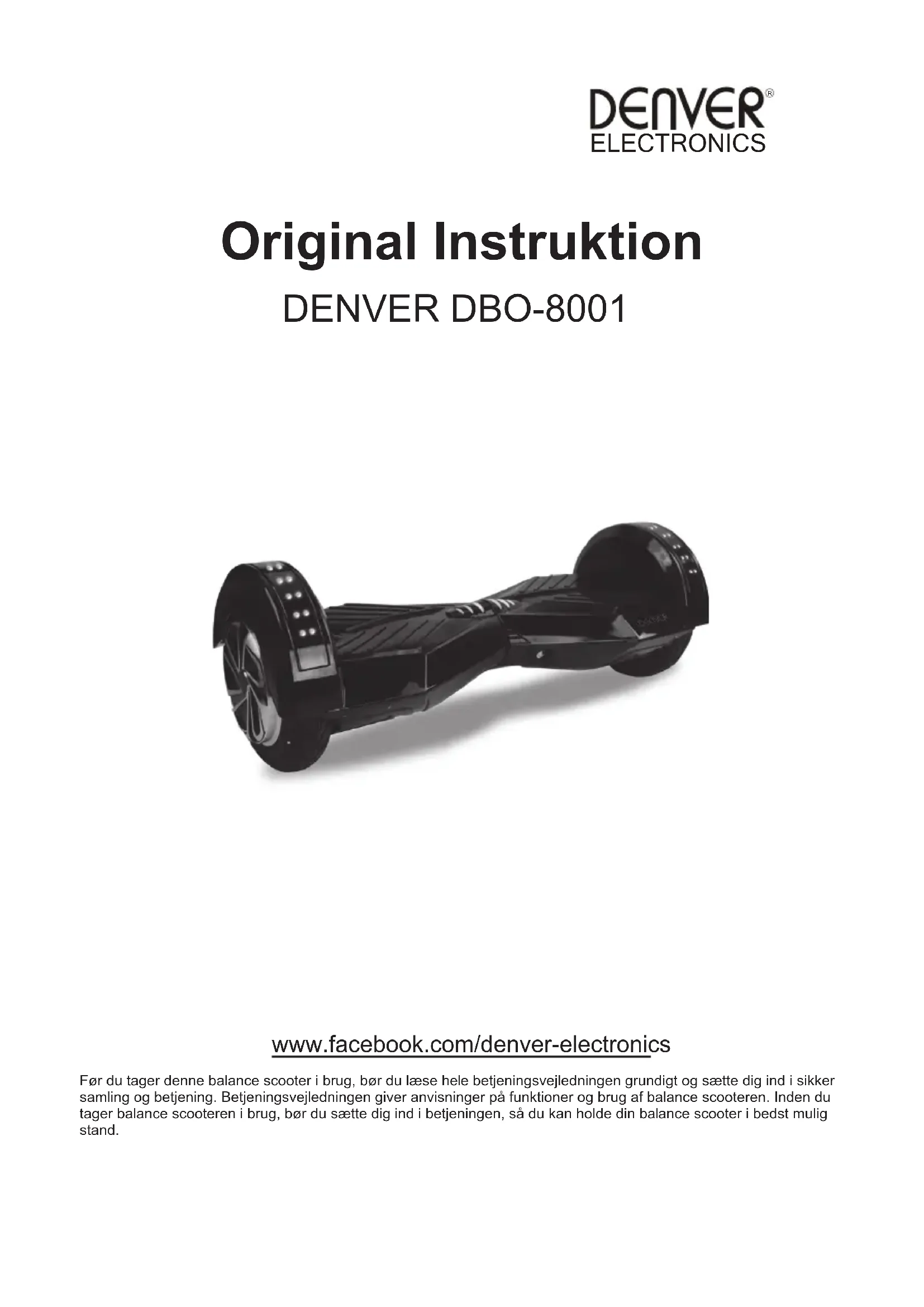 Dänemark Omega 5A, Soeften, DK-8382 Hinnerup,Original Instruktion DENVER DBO-8001 www.facebook.com/denver-electronics Før du tager denne balance scooter i brug, bør du læse hele betjeningsvejledningen grundigt og sætte dig ind i sikker samling og betjening. Betjeningsvejledningen giver anvisninger på funktioner og brug af balance scooteren. Inden du tager balance scooteren i brug, bør du sætte dig ind i betjeningen, så du kan holde din balance scooter i bedst mulig stand.
