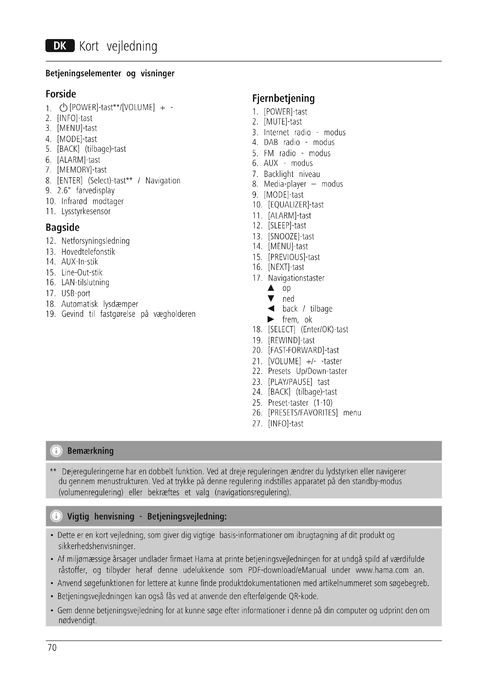 Bemærkning ** Dr ejereguleringerne har en dobbelt funktion. Ved at dreje reguleringen ændrer du lydstyrken eller navigerer du gennem menustrukturen. Ved at trykke på denne regulering indstilles apparatet på den standby-modus (volumenregulering) eller bekræftes et valg (navigationsregulering). Vigtig henvisning - Betjeningsvejledning: