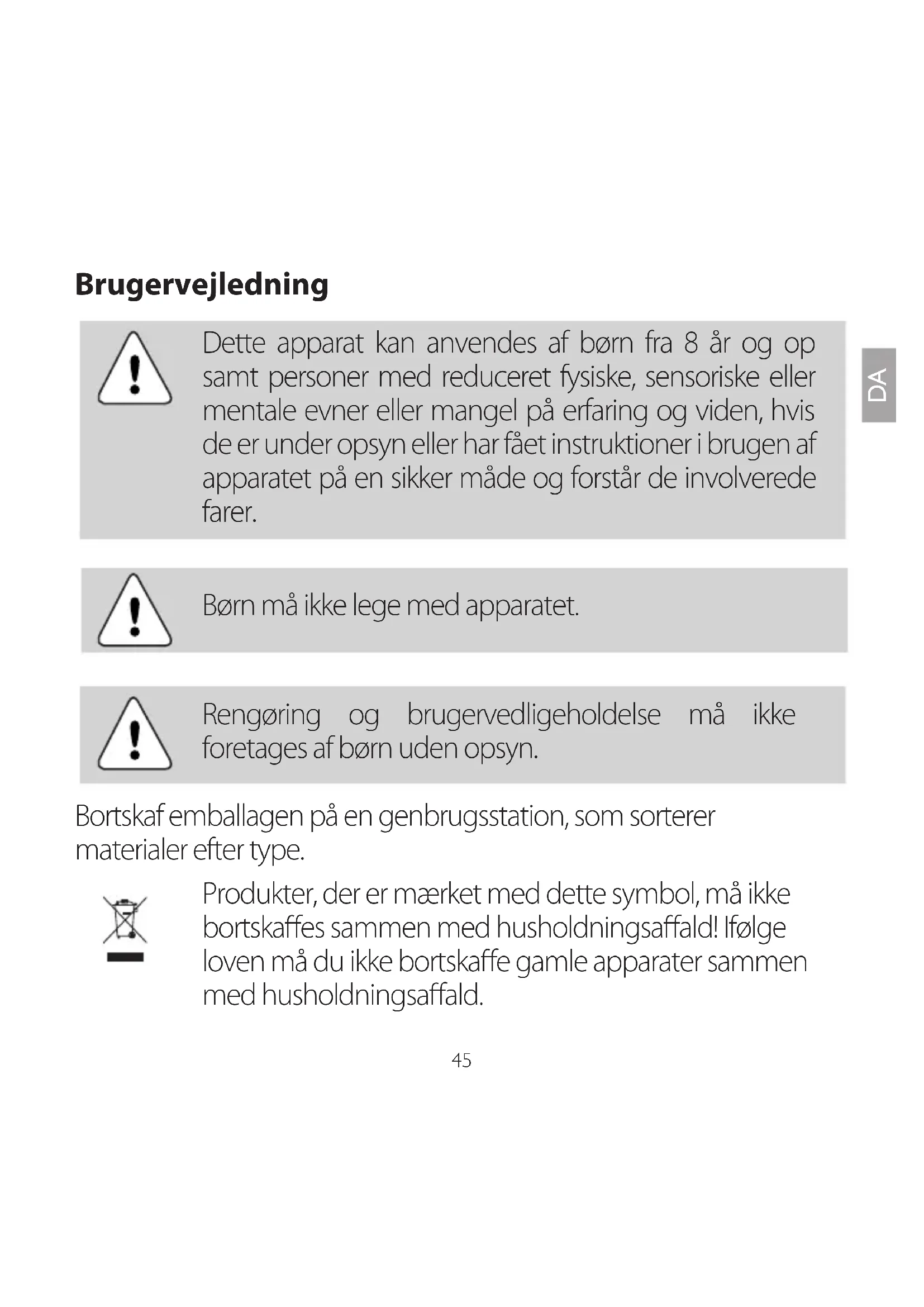 Dette apparat kan anvendes af børn fra 8 år og op samt personer med reduceret fysiske, sensoriske eller mentale evner eller mangel på erfaring og viden, hvis de er under opsyn eller har fået instruktioner i brugen af apparatet på en sikker måde og forstår de involverede farer.