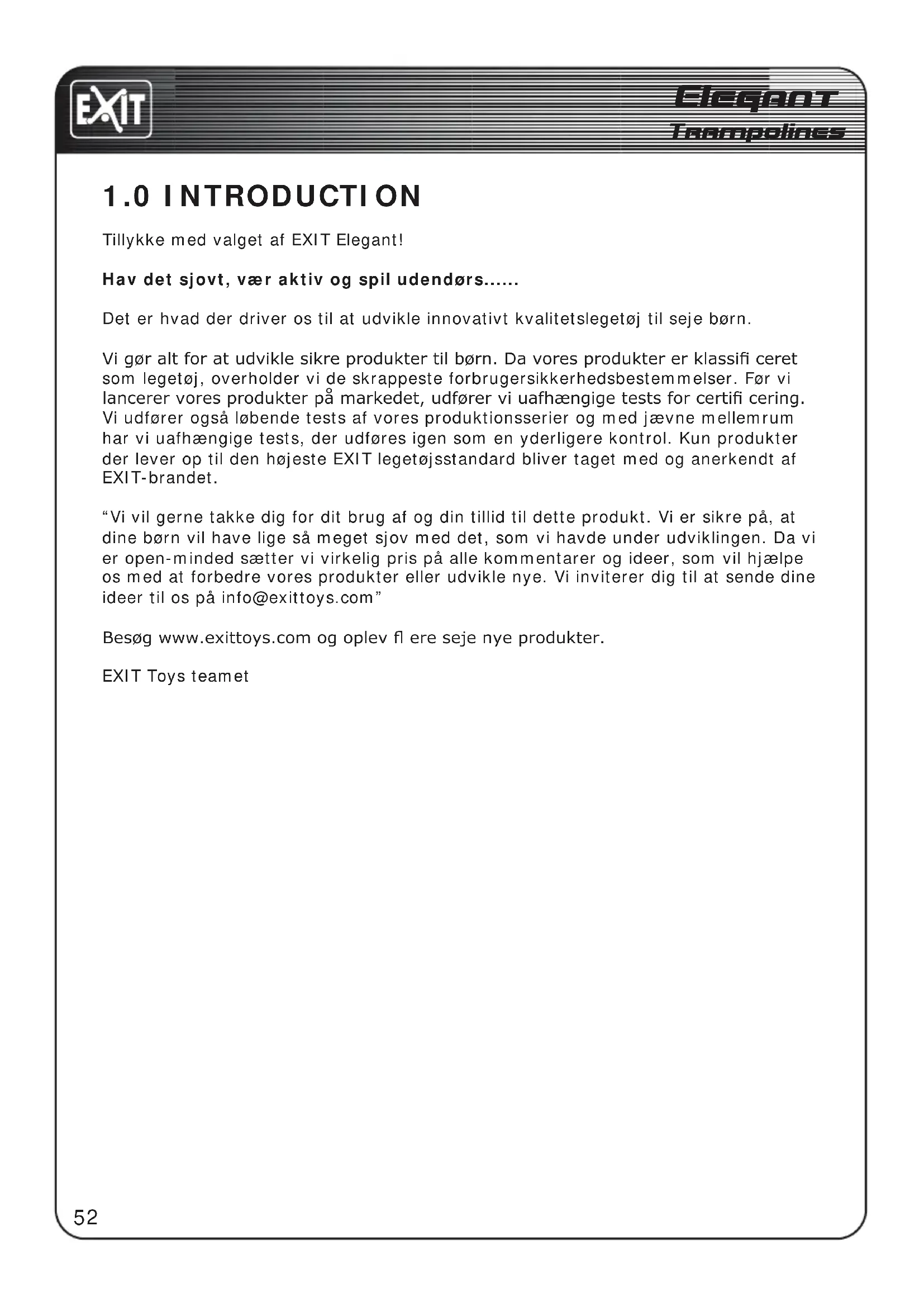 - Ejeren af EXIT Toys Trampoline er kun berettiget til garantien after at have vist den til en EXIT Toys forhandler. Den skal afl everes til en EXIT Toys forhandler sammen med den originale købsfaktura.