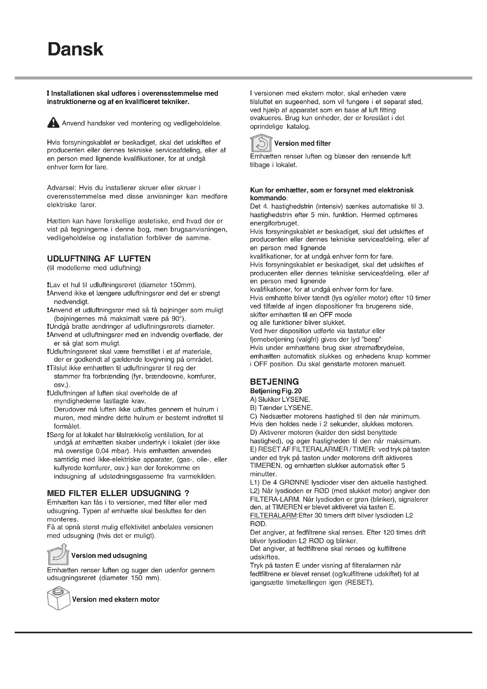 (til modellerne med udluftning) ! Lav et hul til udluftningsrøret (diameter 150mm). ! Anvend ikke et længere udluftningsrør end det er strengt nødvendigt. ! Anvend et udluftningsrør med så få bøjninger som muligt (bøjningernes må maksimalt være på 90°). ! Undgå bratte ændringer af udluftningsrørets diameter. ! Anvend et udluftningsrør med en indvendig overflade, der er så glat som muligt. ! Udluftningsrøret skal være fremstillet i et af materiale, der er godkendt af gældende lovgivning på området. ! Tilslut ikke emhætten til udluftningsrør til røg der stammer fra forbrænding (fyr, brændeovne, komfurer, osv.). ! Udluftningen af luften skal overholde de af myndighederne fastlagte krav. Derudover må luften ikke udluftes gennem et hulrum i muren, med mindre dette hulrum er bestemt indrettet til formålet. ! Sørg for at lokalet har tilstrækkelig ventilation, for at undgå at emhætten skaber undertryk i lokalet (der ikke må overstige 0,04 mbar). Hvis emhætten anvendes samtidig med ikke-elektriske apparater, (gas-, olie-, eller kulfyrede komfurer, osv.) kan der forekomme en indsugning af udstødningsgasserne fra varmekilden. MED FILTER ELLER UDSUGNING ? Emhætten kan fås i to versioner, med filter eller med udsugning. Typen af emhætte skal besluttes før den monteres. Få at opnå størst mulig effektivitet anbefales versionen med udsugning (hvis det er muligt). Version med udsugning Emhætten renser luften og suger den udenfor gennem udsugningsrøret (diameter 150 mm). Version med ekstern motor I versionen med ekstern motor, skal enheden være tilsluttet en sugeenhed, som vil fungere i et separat sted, ved hjælp af apparatet som en base af luft fitting evakueres. Brug kun enheder, der er foreslået i det oprindelige katalog. Version med filter Emhætten renser luften og blæser den rensende luft tilbage i lokalet. Kun for emhætter, som er forsynet med elektronisk kommando: Det 4. hastighedstrin (intensiv) sænkes automatiske til 3. hastighedstrin efter 5 min. funktion. Hermed optimeres energiforbruget. Hvis forsyningskablet er beskadiget, skal det udskiftes ef producenten eller dennes tekniske serviceafdeling, eller af en person med lignende kvalifikationer, for at undgå enhver form for fare. Hvis forsyningskablet er beskadiget, skal det udskiftes ef producenten eller dennes tekniske serviceafdeling, eller af en person med lignende kvalifikationer, for at undgå enhver form for fare. Hvis emhætte bliver tændt (lys og/eller motor) efter 10 timer ved tilfælde af ingen dispositioner fra brugerens side, skifter emhætten til en OFF mode og alle funktioner bliver slukket. Ved hver disposition udførte via tastatur eller fjernebetjening (valgfri) gives der lyd ”beep” Hvis under emhættens brug sker strømafbrydelse, emhætten automatisk slukkes og enhedens knap kommer i OFF position. Du skal genstarte motoren manuelt. BETJENING Betjening Fig. 20 A) Slukker LYSENE. B) Tænder LYSENE. C) Nedsætter motorens hastighed til den når minimum. Hvis den holdes nede i 2 sekunder, slukkes motoren. D) Aktiverer motoren (kalder den sidst benyttede hastighed), og øger hastigheden til den når maksimum. E) RESET AF FILTERALARMER / TIMER: ved tryk på tasten under ed tryk på tasten under motorens drift aktiveres TIMEREN, og emhætten slukker automatisk efter 5 minutter. L1) De 4 GRØNNE lysdioder viser den aktuelle hastighed. L2) Når lysdioden er RØD (med slukket motor) angiver den FILTERA-LARM. Når lysdioden er grøn (blinker), signalerer den, at TIMEREN er blevet aktiveret via tasten E. FILTERALARM:Efter 30 timers drift bliver lysdioden L2 RØD. Det angiver, at fedfiltrene skal renses. Efter 120 times drift bliver lysdioden L2 RØD og blinker. Det angiver, at fedtfiltrene skal renses og kulfiltrene udskiftes. Tryk på tasten E under visning af filteralarmen når fedtfiltrene er blevet renset (og/kulfiltrene udskiftet) fot at igangsætte timetællingen igen (RESET).Betjening Fig. 21 Tast A: lyskontakt. Tast B: ON/OFF-afbryderkontakt til motoren ved I hastighed. Tast C: afbryderkontakt til II hastighed. Tast D: afbryderkontakt til III hastighed. Betjening Fig. 22 P1: Kort tryk àtænder/slukker lysene, led-lyset P1tændes/slukkes. P2: Tryk med slukket motor: motoren starter pålaveste hastighed. Tryk med tændt motor i 1^: motorenslukkes Tryk med motor tændt på hastighed¹ fra 1^indstiller motoren på 1^. Hastigheden vises med dettændte led- lys. P3: Tryk med slukket motor: starter motoren på2^ hastighed.Tryk med tændt motor på hastighed¹ fra2^, indstiller motoren i 2^. Hastigheden vises med dettændte led-lys. P4: Tryk med slukket motor: starter motoren på3^ hastighed. Tryk med tændt motor på hastighed¹ fra3^, indstiller motoren i 3^. Hastigheden vises med dettændte led-lys. P5: Tryk med s lukket motor: starter motoren på4^ hastighed. Tryk med tændt motor på hastighed¹ fra4^, indstiller motoren i 4^. Hastigheden vises med dettændte led-lys. P6: Aktiverer/deaktiverer funktionen timer 5’ somvises med P6 tændt. P7: Reset filtre: når filteralarmen er aktiv (30 eller120 timer) nulstilles tælleren og det tilhørende led- lysslukkes.Hvis Timer 5’ funktionen er aktiv med motoren slukket,starter motoren i 1^. Buzzer: Ved hvert tryk på kommandotasten udsendes et “bip”. Visning af filteralarmer: Efter at motoren har kørt 30 arbejdstimer tænderled-lyset P7 i 30 minutter hver gang motoren slukkes.àalarm fedtfilterEfter at motoren har kørt 120 arbejdstimer blinkerled-lyset P7 i 30 minutter hver gang motoren slukkes.àalarm kulfilterAlarmen gensættes ved at trykke på P7 mens alarmenvises. Betjening Fig. 23-24 Knap TC1 (Lys)Tænd/sluk hovedlys ON/OFFNår hovedlys er tændt, BL1 skifter farver og tænder. Hvis knappen bliver presset og hold på lys ved siderne tænder/slukker (valgfri). Knap TC2 (Motor – V1)ON/OFF motor – starter motor ved den første hastighed. Knap TC3 (Motor – V2)Starter motor ved den anden hastighed Knap TC4 (Motor - V