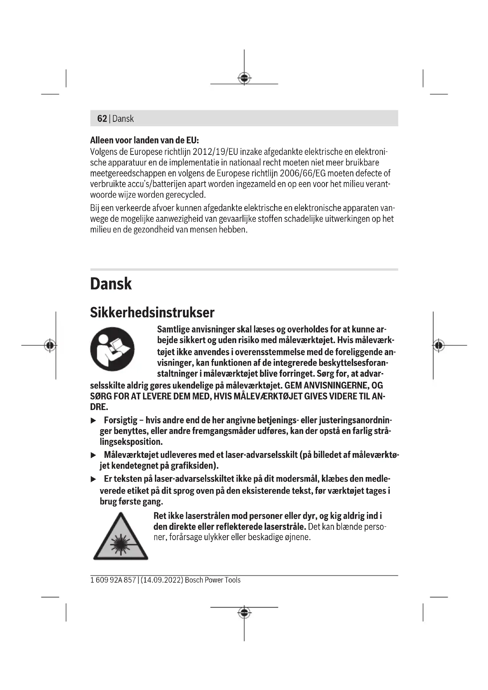 ved 20–25°C C) De angivne værdier forudsætter normale til gunstige omgivelsesbetingelser (f.eks. ingen vibra- tion, ingen tåge, ingen røg, ingen direkte sollys). Efter kraftige temperatursvingninger kan der fo- rekommer nøjagtighedsafvigelser. D) Der forekommer kun en ikke-ledende tilsmudsning, idet der dog lejlighedsvis må forventes en midlertidig ledeevne forårsaget af tildugning. Serienummeret (6) på typeskiltet bruges til entydig identifikation af måleværktøjet. Montering Isætning/skift af batterier Det anbefales at bruge alkaliske manganbatterier til måleværktøjet. Låget til batterirummet(9) åbnes ved at trykke på låsen(8) og tage låget til batterirum- met af. Isæt batterierne. Sørg i den forbindelse for, at polerne vender rigtigt som vist på indersiden af batterirum- met. Hvis batterierne bliver svage, lyser batteriadvarslen(4) rødt. Udskift altid alle batterier samtidig. Brug kun batterier fra en og samme producent og med samme kapacitet. u Tag batterierne ud af måleværktøjet, hvis det ikke skal bruges i længere tid. Bat- terierne kan korrodere og aflade sig selv, hvis de bliver siddende i længere tid. Bosch Power Tools 1 609 92A 857 | (14.09.2022)66 | Dansk Brug Ibrugtagning u Beskyt måleværktøjet mod fugt og direkte sollys. u Udsæt ikke måleværktøjet for ekstreme temperaturer eller temperatursvingnin- ger. Lad det f.eks. ikke ligge i længere tid i bilen. Ved større temperatursvingninger skal måleværktøjets temperatur tilpasse sig, før det tages i brug. Ved ekstreme tem- peraturer eller temperatursvingninger kan måleværktøjets præcision påvirkes. u Undgå, at måleværktøjet udsættes for kraftige stød eller tabes. Hvis måleværktø- jet bliver beskadiget, kan det resultere i unøjagtige målinger. Hvis det alligevel udsæt- tes for et kraftigt stød eller tabes, skal laserlinjen efterfølgende kontrolleres ved at sammenligne den med en kendt vandret eller lodret referencelinje. u Sluk måleværktøjet, når du transporterer det. Ved slukning låses pendulenheden, som ellers kan beskadiges ved kraftige bevægelser. Tænd/sluk For at tænde måleværktøjet skal du skubbe tænd/sluk-knappen (2) til positionen On. Måleværktøjet sender straks efter tænding laserstråler ud af udgangsåbningerne (1). u Ret ikke laserstrålen mod personer eller dyr og ret ikke blikket ind i laserstrålen, heller ikke fra stor afstand. Hvis du vil slukke måleværktøjet, skal du skubbe tænd/sluk-knappen (2) til positionen Off. Ved stop låses pendulenheden. u Lad ikke det tændte måleværktøj være uden opsyn, og sluk måleværktøjet efter brug. Andre personer kan blive blændet af laserstrålen. Driftstilstande Måleværktøjet er udstyret med tre driftstilstande, som du altid kan skifte imellem: Driftstype Krydslinjedrift med automatisk nivellering (se billedeA): Måleværktøjet vi- ser en vandret og en lodret laserlinje. Krydslinje- og lodpunktsdrift med automatisk nivellering (se billedeB): Måleværktøjet viser en vandret og to lodrette laserlinjer samt et lodpunkt nedad. De to lodrette laserlinjer forløber i en ret vinkel i forhold til hinanden. Krydslinjedrift med hældningsfunktion (se billedeC): Måleværktøjet viser en vandret og en lodret laserlinje. Efter aktivering befinder måleværktøjet sig i krydslinjedrift med nivelleringsautomatik. 1 609 92A 857 | (14.09.2022) Bosch Power ToolsDansk | 67 For at skifte driftsmåde skal du trykke et antal gange på tasten for laserdriftsform (3), til den ønskede driftsmåde vises ved, at den pågældende visning for laser-driftsmåde(5) lyser. Nivelleringsautomatik Arbejde med nivelleringsautomatik Stil måleværktøjet på et vandret, fast underlag, eller fastgør det på stativet (11). Vælg en funktion med nivelleringsautomatik. Nivelleringsautomatikken udligner automatisk ujævnheder i selvnivelleringsområdet på ±4°. Nivelleringen er afsluttet, så snart laserlinjerne ikke længere bevæger sig. Hvis automatisk nivellering ikke er mulig, f.eks. fordi måleværktøjets ståflade afviger me- re end 4° fra vandret, slukkes laseren. Opstil i så fald måleværktøjet vandret, og vent på selvnivelleringen. Ved rystelser eller positionsændringer under driften nivelleres måleværktøjet igen auto- matisk. Kontrollér efter nivelleringen laserstrålernes position i forhold til referencepunk- terne for at undgå fejl ved en forskydning af måleværktøjet. Arbejde med hældningsfunktion Vælg driftstypen "Krydslinjedrift med hældningsfunktion". Ved arbejde med hældningsfunktionen er nivelleringsautomatikken slået fra. Du kan hol- de måleværktøjet frit i hånden eller stille det på et hældende underlag. Laserstrålerne ni- velleres ikke mere og forløber ikke mere nødvendigvis lodret i forhold til hinanden. Arbejdsvejledning u Brug altid kun laserpunktets/laserlinjens midte til markering. Laserpunktets stør- relse og laserlinjens bredde ændres i takt med afstanden. Arbejde med stativ (tilbehør) Et stativ udgør et stabilt, højdejusterbart måleunderlag. Sæt måleværktøjet med 1/4"- stativholderen (10) på stativets (11) gevind eller på et normalt fotostativs gevind. Skru måleværktøjet fast igen med stativets låseskrue. Juster stativet groft, før du tænder måleværktøjet. Laserbriller (tilbehør) Laserbrillerne filtrerer det omgivende lys fra. Derved fremstår laserens lys lysere for øjet. u Brug ikke laserbrillerne (tilbehør) som beskyttelsesbriller. Med laserbrillerne kan man lettere få øje på laserstrålen, men de beskytter ikke mod laserstråling. Bosch Power Tools 1 609 92A 857 | (14.09.2022)68 | Dansk u Brug ikke laserbrillerne (tilbehør) som solbriller eller i trafikken. Laserbrillerne beskytter ikke 100% mod ultraviolette(UV) stråler og reducerer ens evne til at regi- strere og iagttage farver. Arbejdseksempler (se billeder D–F) Eksempler på anvendelsesmuligheder for måleværktøjet finder du på illustrationssider- ne. Vedligeholdelse og se