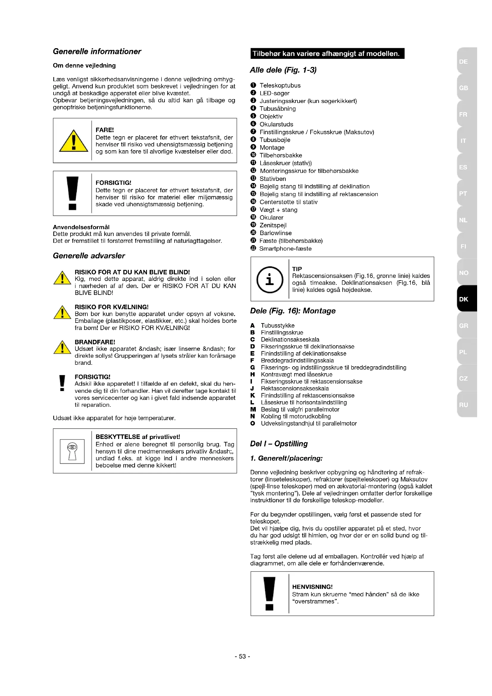 Denne vejledning beskriver opbygning og håndtering af refrak- torer (linseteleskoper), refraktorer (spejlteleskoper) og Maksutov (spejl-linse teleskoper) med en ækvatorial-montering (også kaldet ”tysk montering”). Dele af vejledningen omfatter derfor forskellige instruktioner til de forskellige teleskop-modeller. Før du begynder opstillingen, vælg først et passende sted for teleskopet. Det vil hjælpe dig, hvis du opstiller apparatet på et sted, hvor du har god udsigt til himlen, og hvor der er en solid bund og til- strækkelig med plads. Tag først alle delene ud af emballagen. Kontrollér ved hjælp af diagrammet, om alle dele er forhåndenværende. HENVISNING! Stram kun skruerne “med hånden” så de ikke “overstrammes”.- 54 -