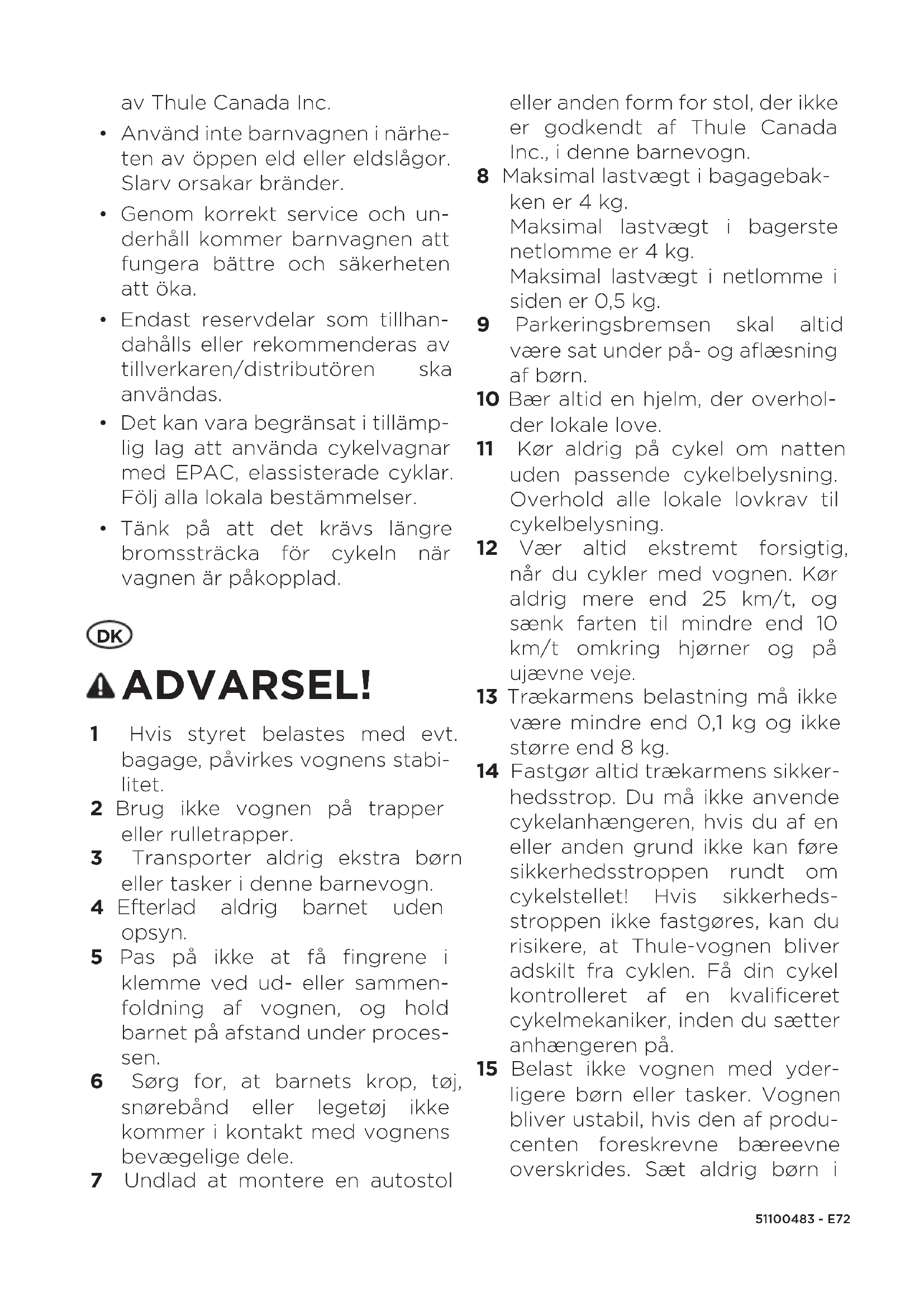 ADVARSEL! 1 Hvis styret belastes med evt. bagage, påvirkes vognens stabi- litet. 2 Brug ikke vognen på trapper eller rulletrapper. 3 Transporter aldrig ekstra børn eller tasker i denne barnevogn. 4 Efterlad aldrig barnet uden opsyn. 5 Pas på ikke at få fingrene i klemme ved ud- eller sammen- foldning af vognen, og hold barnet på afstand under proces- sen. 6 Sørg for, at barnets krop, tøj, snørebånd eller legetøj ikke kommer i kontakt med vognens bevægelige dele. 7 Undlad at montere en autostol eller anden form for stol, der ikke er godkendt af Thule Canada Inc., i denne barnevogn. 8 Maksimal lastvægt i bagagebak- ken er 4 kg. Maksimal lastvægt i bagerste netlomme er 4kg. Maksimal lastvægt i netlomme i siden er 0,5kg. 9 Parkeringsbremsen skal altid være sat under på- og aflæsning af børn. 10 Bær altid en hjelm, der overhol- der lokale love. 11 Kør aldrig på cykel om natten uden passende cykelbelysning. Overhold alle lokale lovkrav til cykelbelysning. 12 Vær altid ekstremt forsigtig, når du cykler med vognen. Kør aldrig mere end 25 km/t, og sænk farten til mindre end 10 km/t omkring hjørner og på ujævne veje. 13 Trækarmens belastning må ikke være mindre end 0,1 kg og ikke større end 8 kg. 14 Fastgør altid trækarmens sikker- hedsstrop. Du må ikke anvende cykelanhængeren, hvis du af en eller anden grund ikke kan føre sikkerhedsstroppen rundt om cykelstellet! Hvis sikkerheds- stroppen ikke fastgøres, kan du risikere, at Thule-vognen bliver adskilt fra cyklen. Få din cykel kontrolleret af en kvalificeret cykelmekaniker, inden du sætter anhængeren på. 15 Belast ikke vognen med yder- ligere børn eller tasker. Vognen bliver ustabil, hvis den af produ- centen foreskrevne bæreevne overskrides. Sæt aldrig børn i51100483 - E 73 vognen, som vejer mere end vægtgrænserne. 16 Sørg for, at alle låseenhederne er låst fast inden anvendelse. 17 Før hver tur skal du sikre, at begge hjul er låst forsvarligt fast i vognakslen. 18 Denne cykelanhænger er ikke egnet til børn under 6 måneder, medmindre der anvendes god- kendt Thule-babytilbehør. a. Børn skal være mindst 6 måneder gamle, og de skal kunne sidde op uden hjælp. b. Barnet skal være gammelt nok til at bære cykelhjelm og sidde opret uden opsyn under cykling. Rådfør dig hos en sundhedsplejerske, hvis barnet er mindre end et år gammelt. 19 Brug altid sikkerhedsselen, så barnet ikke falder eller glider ud og kommer til skade. 20 Når vognen bruges til kun ét barn, placeres barnet i højre side af vognen. 21 Brugeren af vognen skal være opmærksom på farer, såsom vindkøling og varmeudmat- telse, hvis børnene i vognen i en længere periode udsættes for lave temperaturer eller høje temperaturer uden tilstrækkelig ventilation eller væsketilførsel og er mindre aktive. 22 Når vognen anvendes som cykelanhænger, bør overtræk- ket lukkes for at holde skidt og snavs ude. 23 Vognens bagside skal være for- synet med en synlig refleks, der overholder lokale bestemmelser, når den trækkes bag en cykel. 24 Før hver tur skal du kontrollere, at den påkoblede vogn ikke generer cyklens nedbremsning, pedaler eller styreevne. 25 Kørsel med cykelanhænger ændrer din cykels stabilitet, bremsekrav og køreegenskaber. 26 Når du drejer til højre, må vinklen mellem den trækkende cykel og Thule-vognen ikke overstige 45 grader. 27 Når du drejer til venstre, må vinklen aldrig overstige 90 gra- der. 28 Anvend altid et sikkerhedsflag. 29 Hurtigspænderens greb skal spændes helt på hurtigspæn- deren, således at mindst to gevind kan ses efter enden af hurtigspænderens greb, for at sikre, at cyklens baghjul ikke løsner sig. Du skal altid sikre dig, at hurtigspænderen er korrekt fastgjort. En ukorrekt tilspændt hurtigspænder kan medføre uheld, hvor baghjulet går løs. 30 Møtrikken på bagakslen skal spændes med mindst 5 hele omgange for at sikre den pas- sende fastspændingskraft. Du må gerne kassere den originale spændeskive på nogle af aks- lerne, så der er plads til ezHitch. Spørg din cykelforhandler for at være helt sikker. Afhængigt af navtype skal den eksiste- rende momentspændeskive til navet blive siddende på stellet. Følg monteringsanvisningerne for navet og producentens momentspecifikationer, når du spænder møtrikken til akslen.51100483 - E74