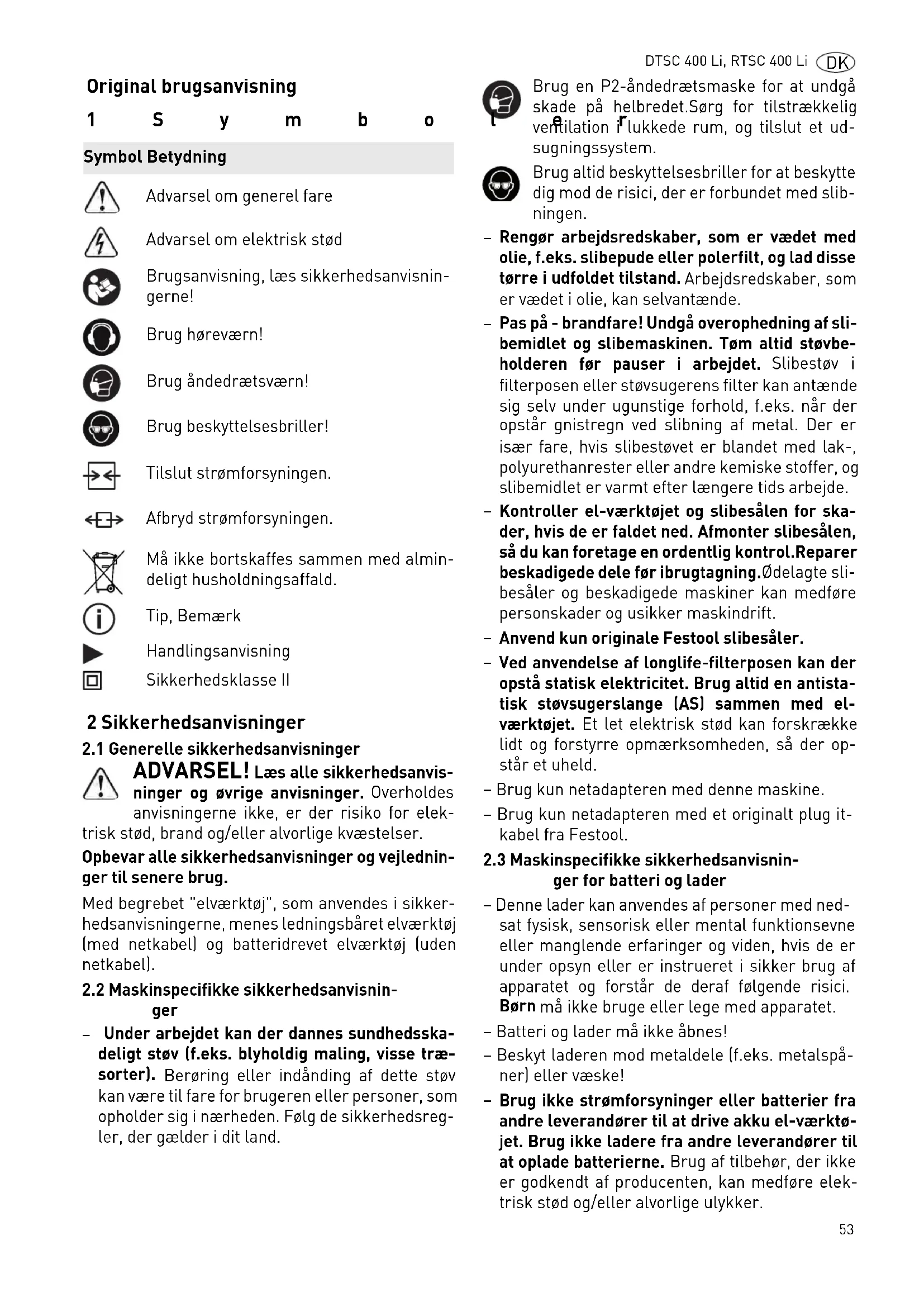 Hold kontakterne på el-værktøjet, batterilade- ren og batteriet rene. Følg anvisningerne, der følger med batteriet, ved vedligeholdelse, pleje, bortskaffelse og transport af batteriet! 10 Tilbehør Anvend udelukkende originale slibesåler fra Festo- ol. Anvendelsen af ringere slibesåler kan medføre betydelig ubalance, så arbejdets kvalitet forringes, og maskinen slides mere. Bestillingsnumrene for tilbehør og værktøj kan du finde i dit Festool-katalog eller på internettet under „www.festool.dk“. 11 Miljø Elværktøj må ikke bortskaffes med almindeligt husholdningsaffald! Apparater, tilbehør og embal- lage skal bortskaffes miljømæssigt korrekt på en kommunal genbrugsstation. Gældende nationale forskrifter skal overholdes. Kun EU: Ifølge Rådets direktiv om affald af elektrisk og elektronisk udstyr og gennemførelse til national ret skal gammelt elværktøj indsamles separat og afleveres til miljøvenlig genvinding. Informationer om REACh: www.festool.com/reach Informationer om databeskyttelse El-værktøjet indeholder en chip, der automatisk gemmer maskin- og driftsdata (RFID). De gemte data indeholder ingen direkte personoplysninger. Dataene kan udlæses kontaktløst med specielle apparater og anvendes udelukkende af Festool til fejldiagnose, reparationer og garantiafvikling samt til kvalitetsforbedring og videreudvikling af el- værktøjet. Dataene anvendes ikke til andre formål uden kundens udtrykkelige tilladelse. ADVARSEL Risiko for kvæstelser, elektrisk stød