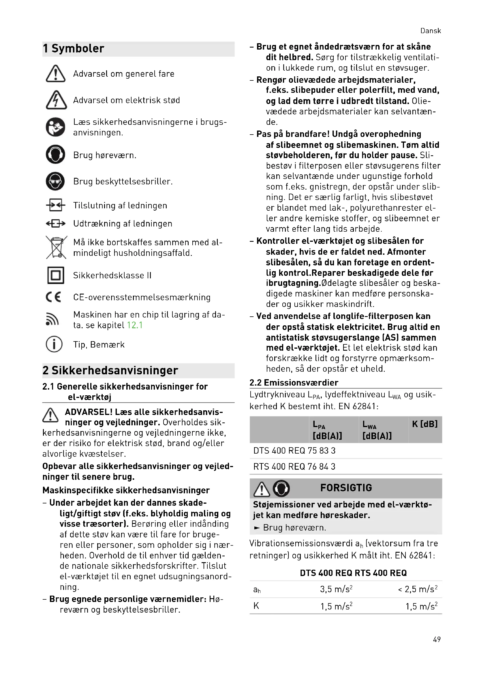 el-værktøj ADVARSEL! Læs alle sikkerhedsanvis ninger og vejledninger. Overholdes sik kerhedsanvisningerne og vejledningerne ikke, er der risiko for elektrisk stød, brand og/eller alvorlige kvæstelser. Opbevar alle sikkerhedsanvisninger og vejled ninger til senere brug. Maskinspecifikke sikkerhedsanvisninger – Under arbejdet kan der dannes skade ligt/giftigt støv (f.eks. blyholdig maling og visse træsorter). Berøring eller indånding af dette støv kan være til fare for bruge ren eller personer, som opholder sig i nær heden. Overhold de til enhver tid gælden de nationale sikkerhedsforskrifter. Tilslut el-værktøjet til en egnet udsugningsanord ning. – Brug egnede personlige værnemidler: Hø reværn og beskyttelsesbriller. – Brug et egnet åndedrætsværn for at skåne dit helbred. Sørg for tilstrækkelig ventilati on i lukkede rum, og tilslut en støvsuger. – Rengør olievædede arbejdsmaterialer, f.eks. slibepuder eller polerfilt, med vand, og lad dem tørre i udbredt tilstand. Olie vædede arbejdsmaterialer kan selvantæn de. – Pas på brandfare! Undgå overophedning af slibeemnet og slibemaskinen. Tøm altid støvbeholderen, før du holder pause. Sli bestøv i filterposen eller støvsugerens filter kan selvantænde under ugunstige forhold som f.eks. gnistregn, der opstår under slib ning. Det er særlig farligt, hvis slibestøvet er blandet med lak-, polyurethanrester el ler andre kemiske stoffer, og slibeemnet er varmt efter lang tids arbejde. – Kontroller el-værktøjet og slibesålen for skader, hvis de er faldet ned. Afmonter slibesålen, så du kan foretage en ordent lig kontrol.Reparer beskadigede dele før ibrugtagning.Ødelagte slibesåler og beska digede maskiner kan medføre personska der og usikker maskindrift. – Ved anvendelse af longlife-filterposen kan der opstå statisk elektricitet. Brug altid en antistatisk støvsugerslange (AS) sammen med el-værktøjet. Et let elektrisk stød kan forskrække lidt og forstyrre opmærksom heden, så der opstår et uheld.