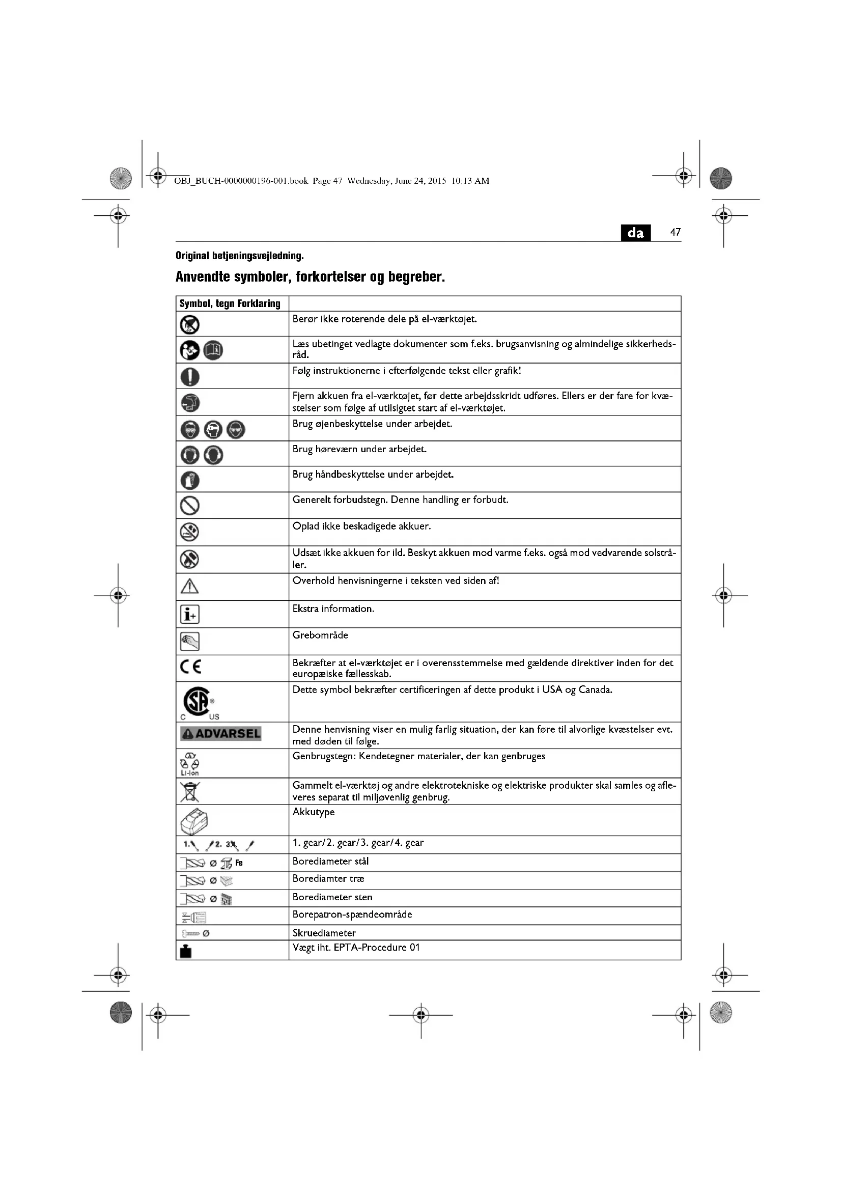 Original betjeningsvejledning. Anvendte symboler, forkortelser og begreber. Symbol, tegn Forklaring Berør ikke roterende dele på el-værktøjet. Læs ubetinget vedlagte dokumenter som f.eks. brugsanvisning og almindelige sikkerheds- råd. Følg instruktionerne i efterfølgende tekst eller grafik! Fjern akkuen fra el-værktøjet, før dette arbejdsskridt udføres. Ellers er der fare for kvæ- stelser som følge af utilsigtet start af el-værktøjet. Brug øjenbeskyttelse under arbejdet. Brug høreværn under arbejdet. Brug håndbeskyttelse under arbejdet. Generelt forbudstegn. Denne handling er forbudt. Oplad ikke beskadigede akkuer. Udsæt ikke akkuen for ild. Beskyt akkuen mod varme f.eks. også mod vedvarende solstrå- ler. Overhold henvisningerne i teksten ved siden af! Ekstra information. Grebområde Bekræfter at el-værktøjet er i overensstemmelse med gældende direktiver inden for det europæiske fællesskab. Dette symbol bekræfter certificeringen af dette produkt i USA og Canada. Denne henvisning viser en mulig farlig situation, der kan føre til alvorlige kvæstelser evt. med døden til følge. Genbrugstegn: Kendetegner materialer, der kan genbruges Gammelt el-værktøj og andre elektrotekniske og elektriske produkter skal samles og afle- veres separat til miljøvenlig genbrug. Akkutype