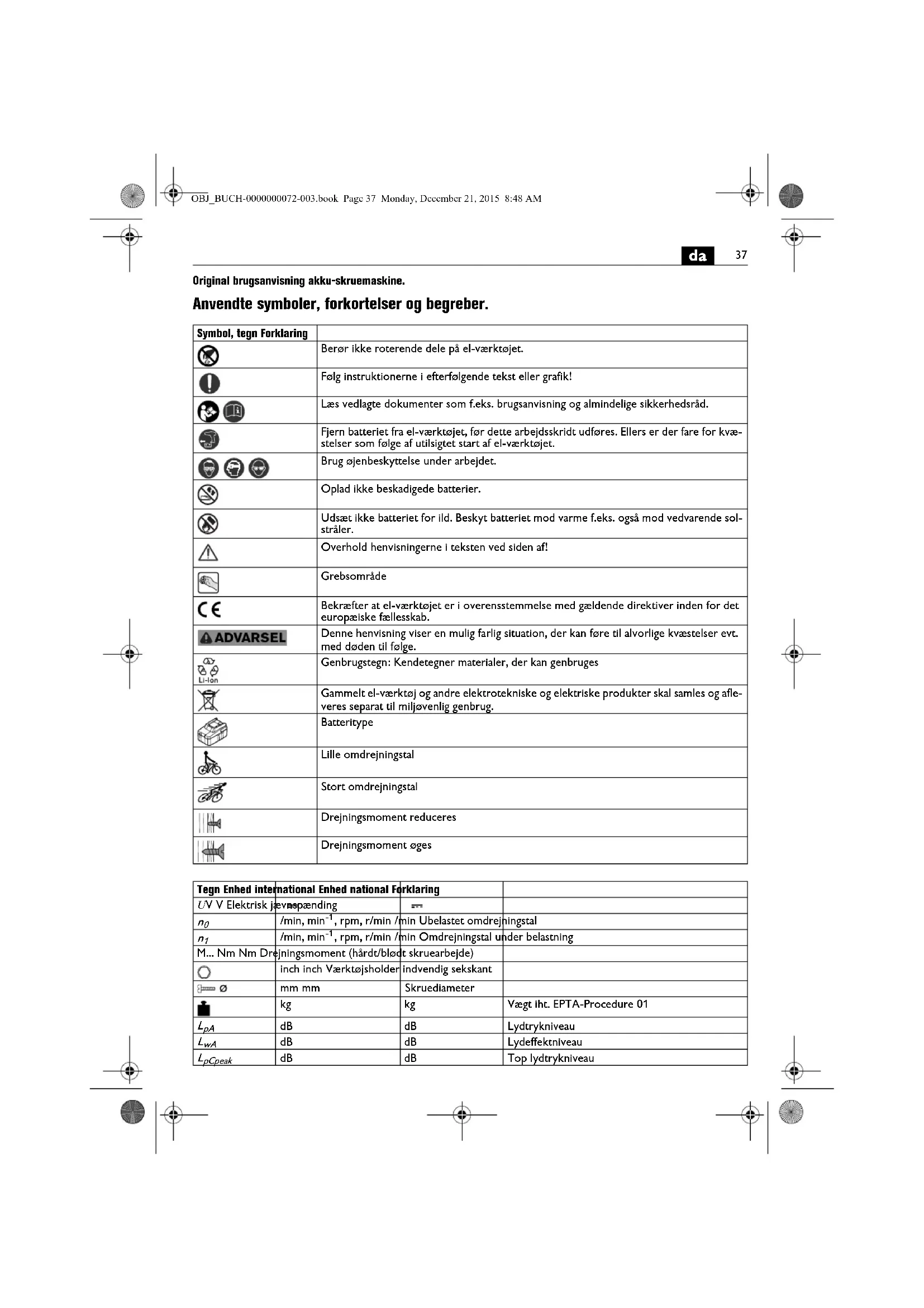 Original brugsanvisning akku-skruemaskine. Anvendte symboler, forkortelser og begreber. Symbol, tegn Forklaring Berør ikke roterende dele på el-værktøjet. Følg instruktionerne i efterfølgende tekst eller grafik! Læs vedlagte dokumenter som f.eks. brugsanvisning og almindelige sikkerhedsråd. Fjern batteriet fra el-værktøjet, før dette arbejdsskridt udføres. Ellers er der fare for kvæ- stelser som følge af utilsigtet start af el-værktøjet. Brug øjenbeskyttelse under arbejdet. Oplad ikke beskadigede batterier. Udsæt ikke batteriet for ild. Beskyt batteriet mod varme f.eks. også mod vedvarende sol- stråler. Overhold henvisningerne i teksten ved siden af! Grebsområde Bekræfter at el-værktøjet er i overensstemmelse med gældende direktiver inden for det europæiske fællesskab. Denne henvisning viser en mulig farlig situation, der kan føre til alvorlige kvæstelser evt. med døden til følge. Genbrugstegn: Kendetegner materialer, der kan genbruges Gammelt el-værktøj og andre elektrotekniske og elektriske produkter skal samles og afle- veres separat til miljøvenlig genbrug. Batteritype Lille omdrejningstal Stort omdrejningstal Drejningsmoment reduceres Drejningsmoment øges Tegn Enhed international Enhed national Forklaring U V V Elektrisk jævnspænding