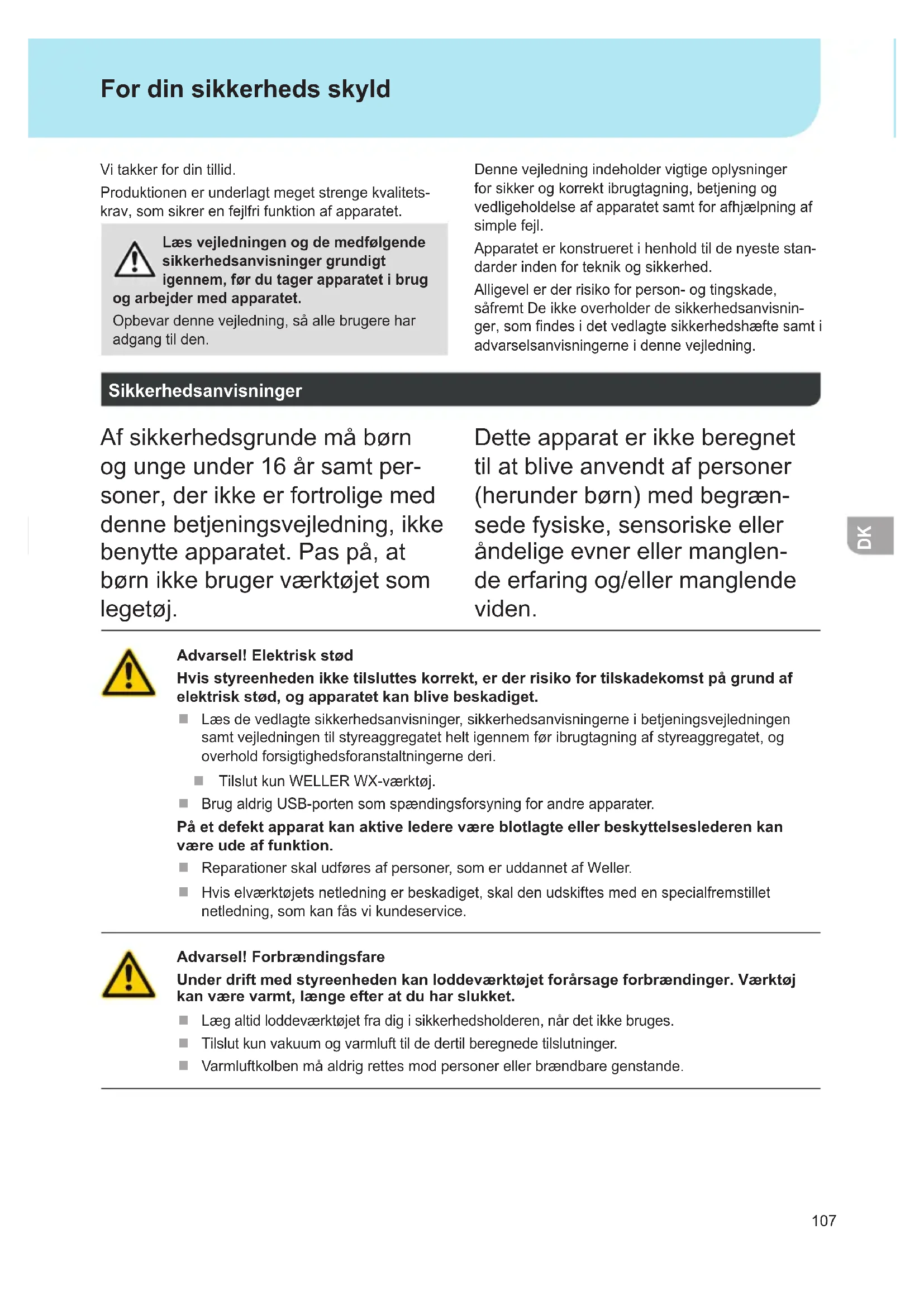 Vi takker for din tillid. Produktionen er underlagt meget strenge kvalitets- krav, som sikrer en fejlfri funktion af apparatet. Læs vejledningen og de medfølgende sikkerhedsanvisninger grundigt igennem, før du tager apparatet i brug og arbejder med apparatet. Opbevar denne vejledning, så alle brugere har adgang til den. Denne vejledning indeholder vigtige oplysninger for sikker og korrekt ibrugtagning, betjening og vedligeholdelse af apparatet samt for afhjælpning af simple fejl. Apparatet er konstrueret i henhold til de nyeste stan- darder inden for teknik og sikkerhed. Alligevel er der risiko for person- og tingskade, såfremt De ikke overholder de sikkerhedsanvisnin- ger, som ndes i det vedlagte sikkerhedshæfte samt i advarselsanvisningerne i denne vejledning. Sikkerhedsanvisninger Af sikkerhedsgrunde må børn og unge under 16 år samt per- soner, der ikke er fortrolige med denne betjeningsvejledning, ikke benytte apparatet. Pas på, at børn ikke bruger værktøjet som legetøj. Dette apparat er ikke beregnet til at blive anvendt af personer (herunder børn) med begræn- sede fysiske, sensoriske eller åndelige evner eller manglen- de erfaring og/eller manglende viden. Advarsel! Elektrisk stød Hvis styreenheden ikke tilsluttes korrekt, er der risiko for tilskadekomst på grund af elektrisk stød, og apparatet kan blive beskadiget. Læs de vedlagte sikkerhedsanvisninger, sikkerhedsanvisningerne i betjeningsvejledningen samt vejledningen til styreaggregatet helt igennem før ibrugtagning af styreaggregatet, og overhold forsigtighedsforanstaltningerne deri. Tilslut kun WELLER WX-værktøj. Brug aldrig USB-porten som spændingsforsyning for andre apparater. På et defekt apparat kan aktive ledere være blotlagte eller beskyttelseslederen kan være ude af funktion. Reparationer skal udføres af personer, som er uddannet af Weller. Hvis elværktøjets netledning er beskadiget, skal den udskiftes med en specialfremstillet netledning, som kan fås vi kundeservice. Advarsel! Forbrændingsfare Under drift med styreenheden kan loddeværktøjet forårsage forbrændinger. Værktøj kan være varmt, længe efter at du har slukket. Læg altid loddeværktøjet fra dig i sikkerhedsholderen, når det ikke bruges. Tilslut kun vakuum og varmluft til de dertil beregnede tilslutninger. Varmluftkolben må aldrig rettes mod personer eller brændbare genstande. For din sikkerheds skyld108