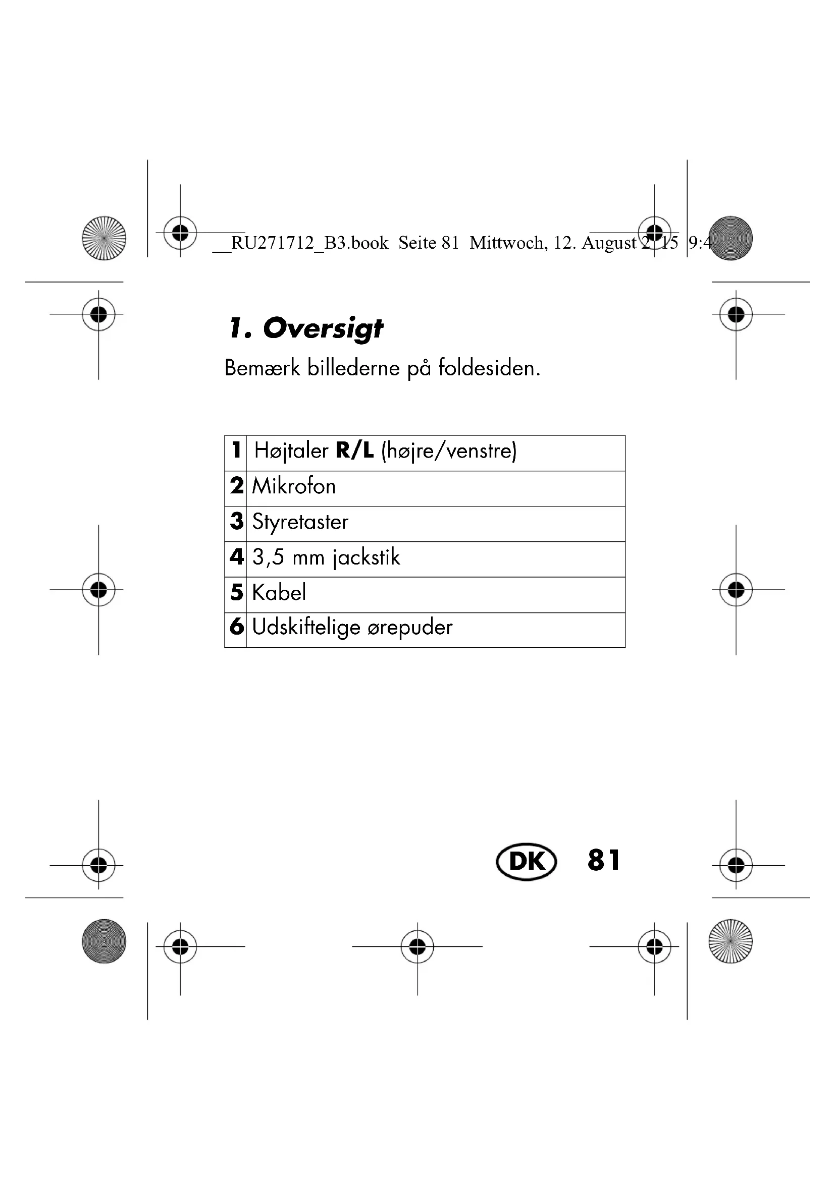 _RU271712_B3.book Seite 90 Mittwoch, 12. August 2015 9:4 © For at undgå risici, må du ikke foretage nogen ændringer på apparatet. Lad altid kun reparationer gennemføres af et autoriseret værksted eller i servicecentret. 4. Leveringsomfang 1 Hovedtelefon 3 Par ørepuder 6: lille, mellemstor, stor (leveres med mellemstor) 1 Betjeningsvejledning Ved en ufuldstændig levering, bedes du henvende dig til producentens ansvarlige servicecenter (se "HOYER Handel GmbH's garanti" på side 99). Bemærk billederne på foldesiden. 90 DK