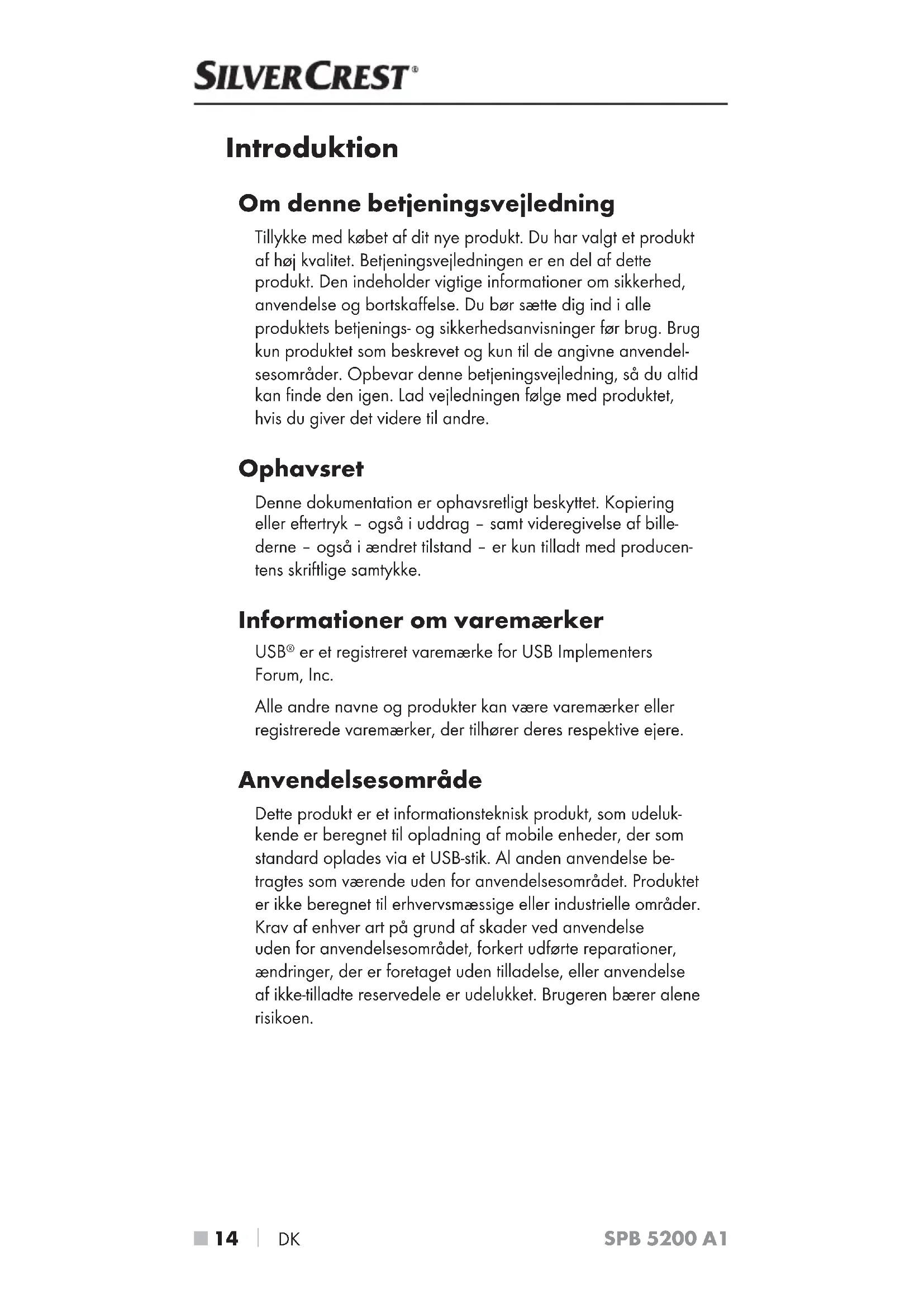 DK SPB 5200 A1 Introduktion Om denne betjeningsvejledning Tillykke med købet af dit nye produkt. Du har valgt et produkt af høj kvalitet. Betjeningsvejledningen er en del af dette produkt. Den indeholder vigtige informationer om sikkerhed, anvendelse og bortskaffelse. Du bør sætte dig ind i alle produktets betjenings- og sikkerhedsanvisninger før brug. Brug kun produktet som beskrevet og kun til de angivne anvendel- sesområder. Opbevar denne betjeningsvejledning, så du altid kan finde den igen. Lad vejledningen følge med produktet, hvis du giver det videre til andre. Ophavsret Denne dokumentation er ophavsretligt beskyttet. Kopiering eller eftertryk – også i uddrag – samt videregivelse af bille- derne – også i ændret tilstand – er kun tilladt med producen- tens skriftlige samtykke. Informationer om varemærker USB