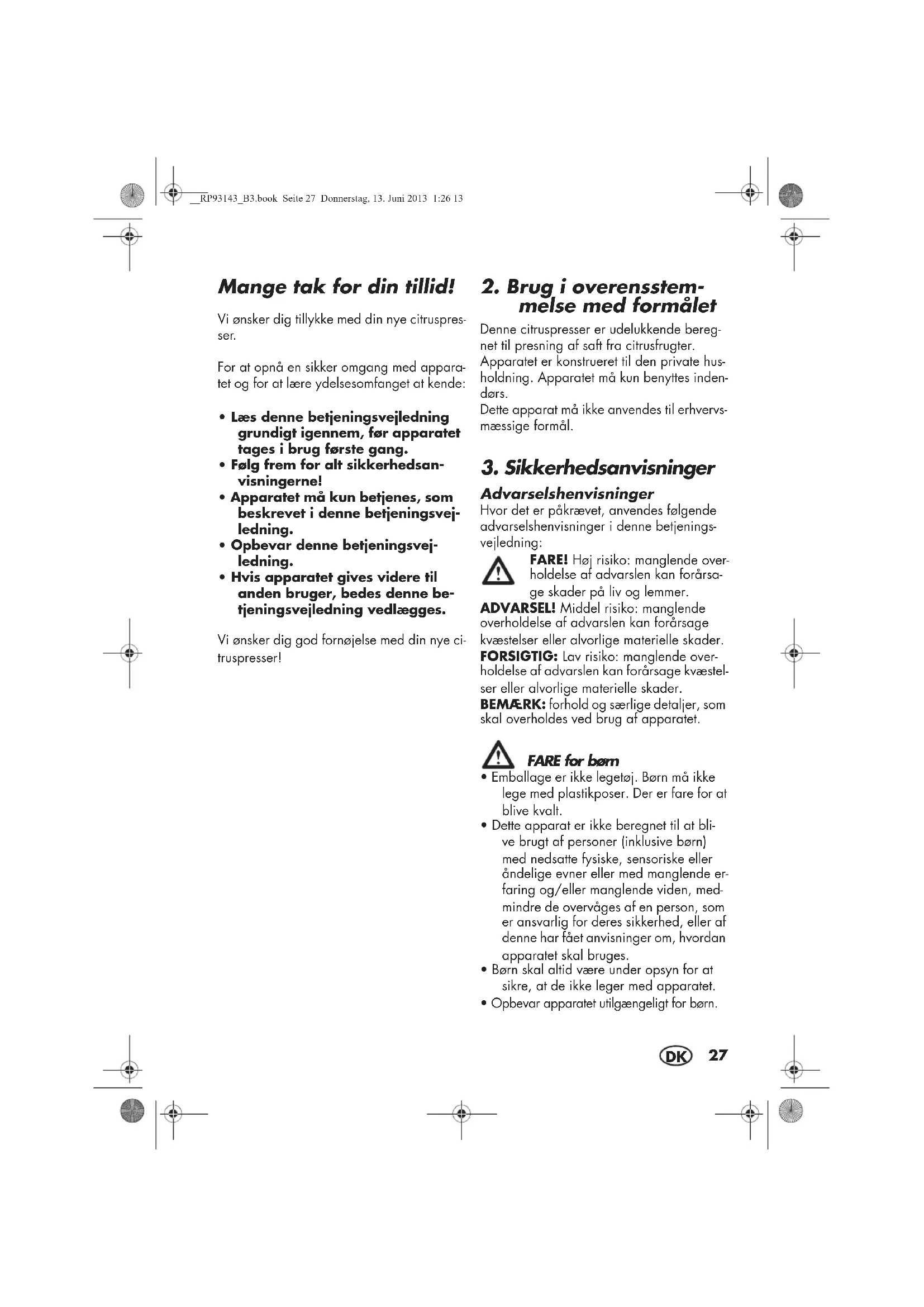 melse med formålet Denne citruspresser er udelukkende bereg- net til presning af saft fra citrusfrugter. Apparatet er konstrueret til den private hus- holdning. Apparatet må kun benyttes inden- dørs. Dette apparat må ikke anvendes til erhvervs- mæssige formål.