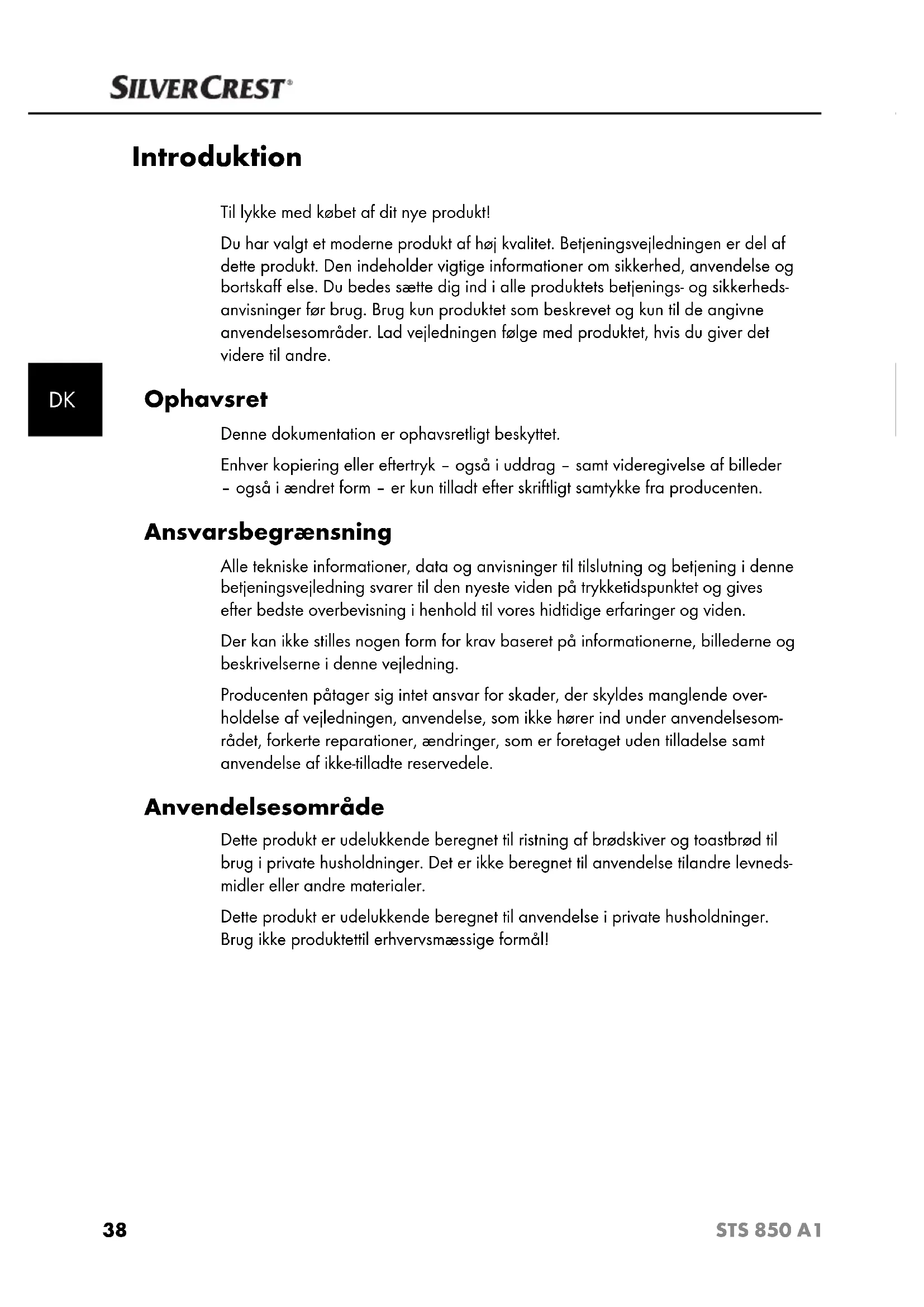 Introduktion Til lykke med købet af dit nye produkt! Du har valgt et moderne produkt af høj kvalitet. Betjeningsvejledningen er del af dette produkt. Den indeholder vigtige informationer om sikkerhed, anvendelse og bortskaff else. Du bedes sætte dig ind i alle produktets betjenings- og sikkerheds- anvisninger før brug. Brug kun produktet som beskrevet og kun til de angivne anvendelsesområder. Lad vejledningen følge med produktet, hvis du giver det videre til andre. Ophavsret Denne dokumentation er ophavsretligt beskyttet. Enhver kopiering eller eftertryk – også i uddrag – samt videregivelse af billeder – også i ændret form – er kun tilladt efter skriftligt samtykke fra producenten. Ansvarsbegrænsning Alle tekniske informationer, data og anvisninger til tilslutning og betjening i denne betjeningsvejledning svarer til den nyeste viden på trykketidspunktet og gives efter bedste overbevisning i henhold til vores hidtidige erfaringer og viden. Der kan ikke stilles nogen form for krav baseret på informationerne, billederne og beskrivelserne i denne vejledning. Producenten påtager sig intet ansvar for skader, der skyldes manglende over- holdelse af vejledningen, anvendelse, som ikke hører ind under anvendelsesom- rådet, forkerte reparationer, ændringer, som er foretaget uden tilladelse samt anvendelse af ikke-tilladte reservedele. Anvendelsesområde Dette produkt er udelukkende beregnet til ristning af brødskiver og toastbrød til brug i private husholdninger. Det er ikke beregnet til anvendelse tilandre levneds- midler eller andre materialer. Dette produkt er udelukkende beregnet til anvendelse i private husholdninger. Brug ikke produktettil erhvervsmæssige formål!39 STS 850 A1