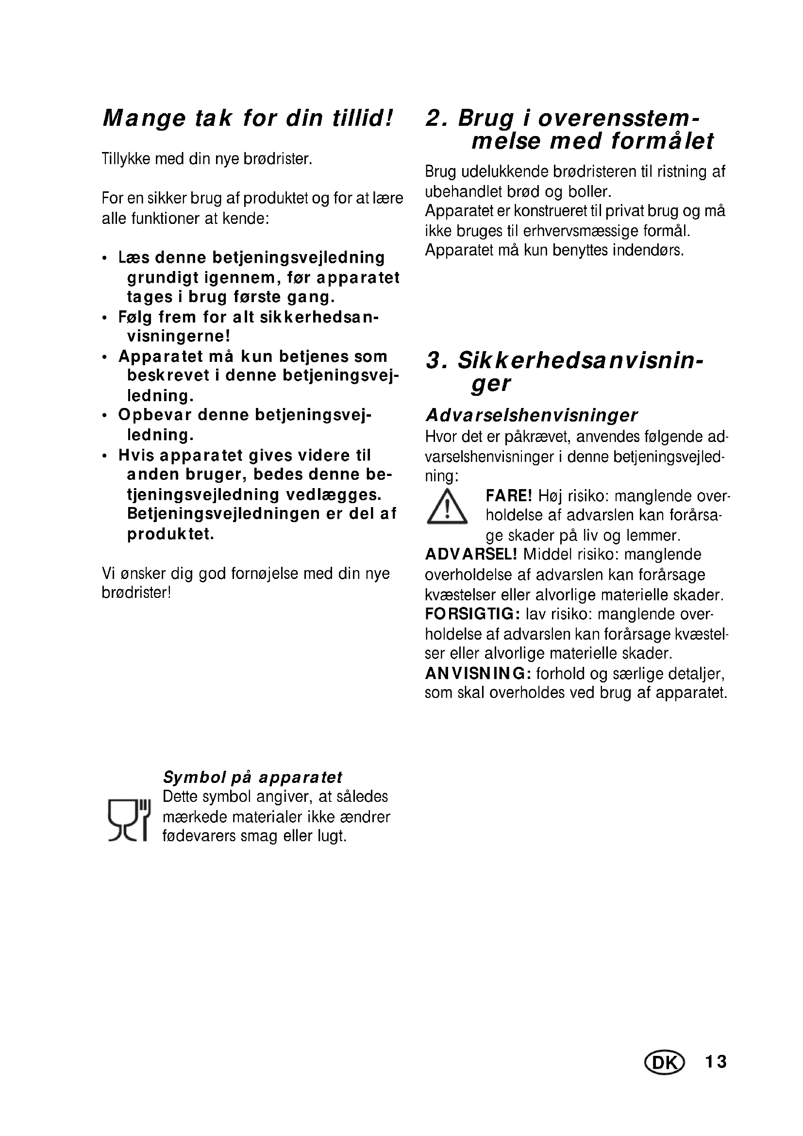 - Hvis apparatet gives videre til anden bruger, bedes denne be- tjeningsvejledning vedlægges. Betjeningsvejledningen er del af produktet. Vi ønsker dig god fornøjelse med din nye brødrister! Symbol på apparatet Dette symbol angiver, at således mærkede materialer ikke ændrer fødevarers smag eller lugt.