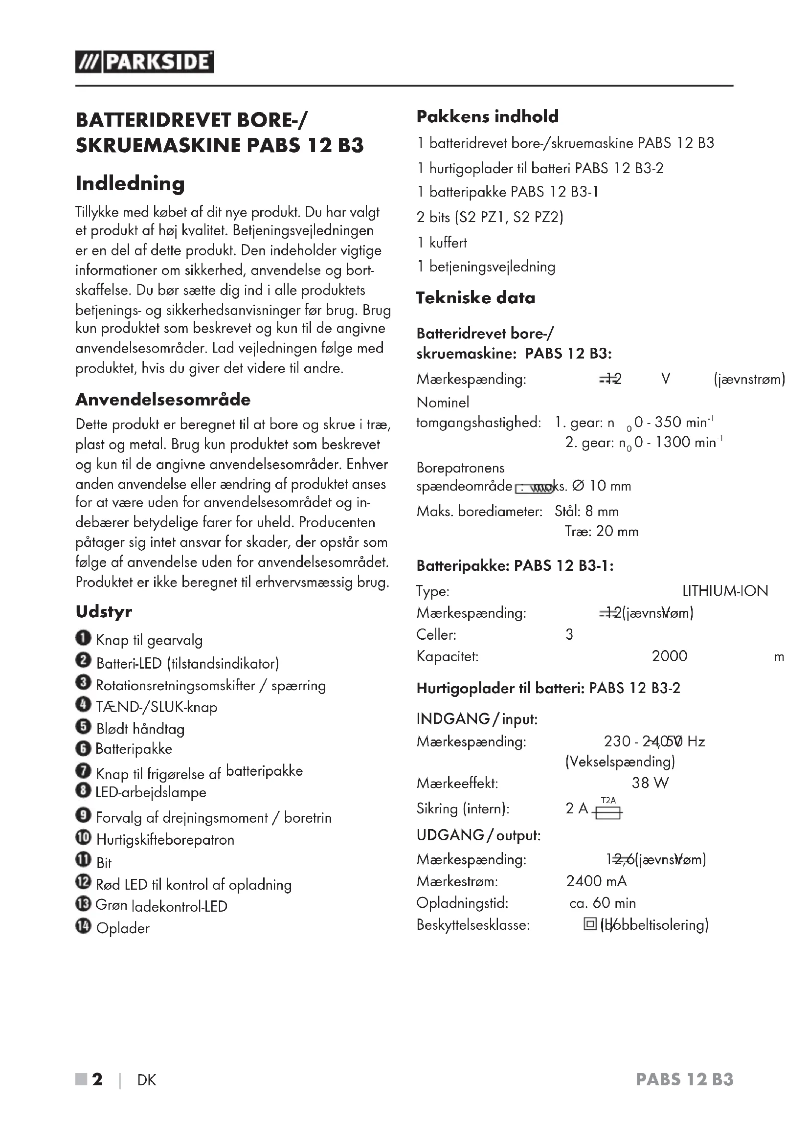 Indledning Tillykke med købet af dit nye produkt. Du har valgt et produkt af høj kvalitet. Betjeningsvejledningen er en del af dette produkt. Den indeholder vigtige informationer om sikkerhed, anvendelse og bort- skaffelse. Du bør sætte dig ind i alle produktets betjenings- og sikkerhedsanvisninger før brug. Brug kun produktet som beskrevet og kun til de angivne anvendelsesområder. Lad vejledningen følge med produktet, hvis du giver det videre til andre. Anvendelsesområde Dette produkt er beregnet til at bore og skrue i træ, plast og metal. Brug kun produktet som beskrevet og kun til de angivne anvendelsesområder. Enhver anden anvendelse eller ændring af produktet anses for at være uden for anvendelsesområdet og in- debærer betydelige farer for uheld. Producenten påtager sig intet ansvar for skader, der opstår som følge af anvendelse uden for anvendelsesområdet. Produktet er ikke beregnet til erhvervsmæssig brug. Udstyr Knap til gearvalg Batteri-LED (tilstandsindikator) Rotationsretningsomskifter / spærring TÆND-/SLUK-knap Blødt håndtag Batteripakke Knap til frigørelse af batteripakke LED-arbejdslampe Forvalg af drejningsmoment / boretrin Hurtigskifteborepatron Bit Rød LED til kontrol af opladning Grøn ladekontrol-LED Oplader Pakkens indhold 1 batteridrevet bore-/skruemaskine PABS 12 B3 1 hurtigoplader til batteri PABS 12 B3-2 1 batteripakke PABS 12 B3-1 2 bits (S2 PZ1, S2 PZ2) 1 kuffert 1 betjeningsvejledning Tekniske data Batteridrevet bore-/ skruemaskine: PABS 12 B3: Mærkespænding: 12 V (jævnstrøm) Nominel tomgangshastighed: 1. gear: n