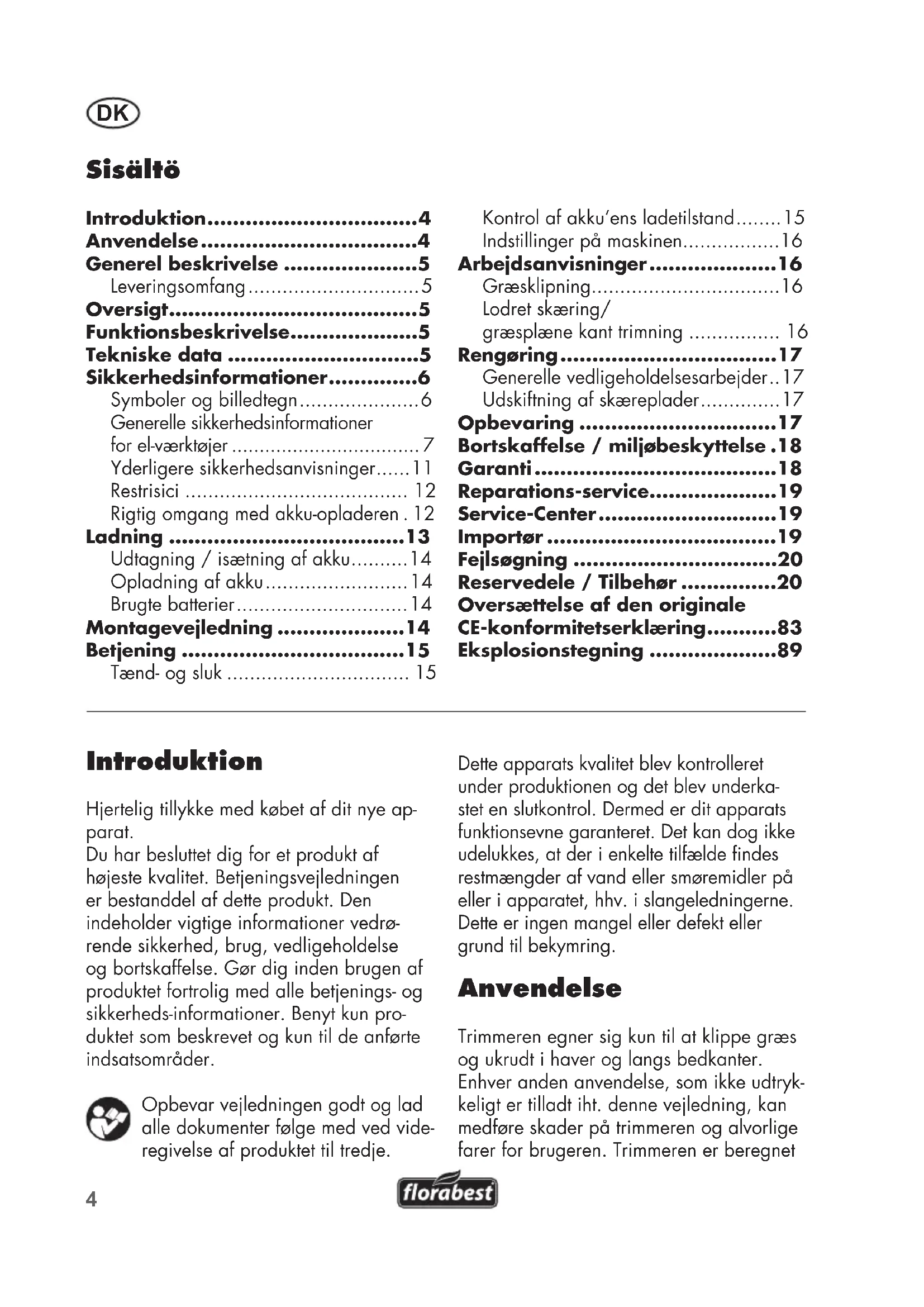 - Introduktion Hjertelig tillykke med købet af dit nye ap- parat. Du har besluttet dig for et produkt af højeste kvalitet. Betjeningsvejledningen er bestanddel af dette produkt. Den indeholder vigtige informationer vedrø- rende sikkerhed, brug, vedligeholdelse og bortskaffelse. Gør dig inden brugen af produktet fortrolig med alle betjenings- og sikkerheds-informationer. Benyt kun pro- duktet som beskrevet og kun til de anførte indsatsområder. Opbevar vejledningen godt og lad alle dokumenter følge med ved vide- regivelse af produktet til tredje. Oversættelse af den originale CE-konformitetserklæring p. 83