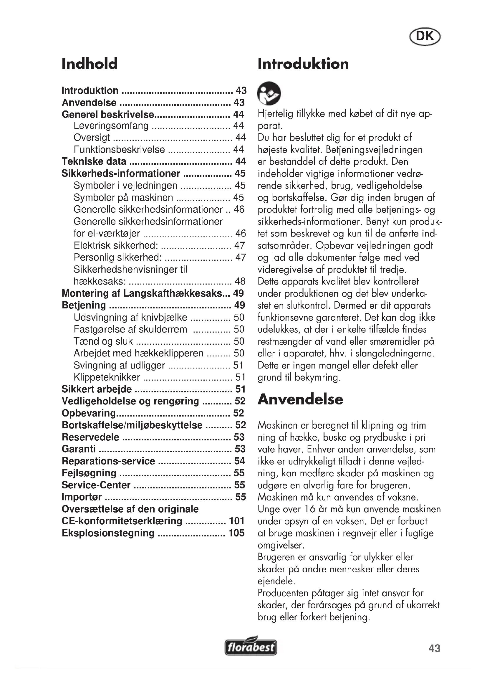 - Introduktion Hjertelig tillykke med købet af dit nye ap- parat. Du har besluttet dig for et produkt af højeste kvalitet. Betjeningsvejledningen er bestanddel af dette produkt. Den indeholder vigtige informationer vedrø- rende sikkerhed, brug, vedligeholdelse og bortskaffelse. Gør dig inden brugen af produktet fortrolig med alle betjenings- og sikkerheds-informationer. Benyt kun produk- tet som beskrevet og kun til de anførte ind- satsområder. Opbevar vejledningen godt og lad alle dokumenter følge med ved videregivelse af produktet til tredje. Dette apparats kvalitet blev kontrolleret under produktionen og det blev underka- stet en slutkontrol. Dermed er dit apparats funktionsevne garanteret. Det kan dog ikke udelukkes, at der i enkelte tilfælde ndes restmængder af vand eller smøremidler på eller i apparatet, hhv. i slangeledningerne. Dette er ingen mangel eller defekt eller grund til bekymring. Anvendelse Maskinen er beregnet til klipning og trim- ning af hække, buske og prydbuske i pri- vate haver. Enhver anden anvendelse, som ikke er udtrykkeligt tilladt i denne vejled- ning, kan medføre skader på maskinen og udgøre en alvorlig fare for brugeren. Maskinen må kun anvendes af voksne. Unge over 16 år må kun anvende maskinen under opsyn af en voksen. Det er forbudt at bruge maskinen i regnvejr eller i fugtige omgivelser. Brugeren er ansvarlig for ulykker eller skader på andre mennesker eller deres ejendele. Producenten påtager sig intet ansvar for skader, der forårsages på grund af ukorrekt brug eller forkert betjening. Indhold Introduktion p. 43