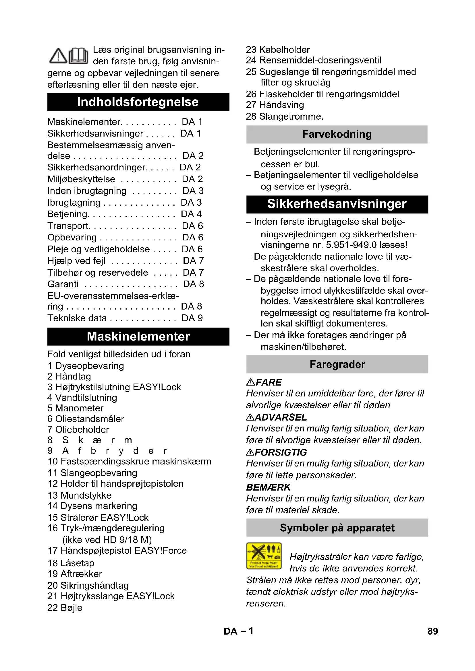 dB(A) 91 88 Produtos de consumo Quantidade de óleo l 0,5 0,75 Tipo de óleo SAE 90 Hypoid Medidas e pesos Comprimento mm 554 Largura mm 509 Altura mm 1000 Peso sem acessórios (MX) kg 48,6 42,1 (49) 47 (55) 48 (50) 88 PT– 1 Læs original brugsanvisning in- den første brug, følg anvisnin- gerne og opbevar vejledningen til senere efterlæsning eller til den næste ejer. Fold venligst billedsiden ud i foran 1 Dyseopbevaring 2 Håndtag 3 Højtrykstilslutning EASY!Lock 4 Vandtilslutning 5 Manometer 6 Oliestandsmåler 7 Oliebeholder 8Skærm 9Afbryder 10 Fastspændingsskrue maskinskærm 11 Slangeopbevaring 12 Holder til håndsprøjtepistolen 13 Mundstykke 14 Dysens markering 15 Strålerør EASY!Lock 16 Tryk-/mængderegulering (ikke ved HD 9/18 M) 17 Håndspøjtepistol EASY!Force 18 Låsetap 19 Aftrækker 20 Sikringshåndtag 21 Højtryksslange EASY!Lock 22 Bøjle 23 Kabelholder 24 Rensemiddel-doseringsventil 25 Sugeslange til rengøringsmiddel med filter og skruelåg 26 Flaskeholder til rengøringsmiddel 27 Håndsving 28 Slangetromme. – Betjeningselementer til rengøringspro- cessen er bul. – Betjeningselementer til vedligeholdelse og service er lysegrå. – Inden første ibrugtagelse skal betje- ningsvejledningen og sikkerhedshen- visningerne nr. 5.951-949.0 læses! – De pågældende nationale love til væ- skestrålere skal overholdes. – De pågældende nationale love til fore- byggelse imod ulykkestilfælde skal over- holdes. Væskestrålere skal kontrolleres regelmæssigt og resultaterne fra kontrol- len skal skiftligt dokumenteres. – Der må ikke foretages ændringer på maskinen/tilbehøret. FARE Henviser til en umiddelbar fare, der fører til alvorlige kvæstelser eller til døden 몇 ADVARSEL Henviser til en mulig farlig situation, der kan føre til alvorlige kvæstelser eller til døden. 몇 FORSIGTIG Henviser til en mulig farlig situation, der kan føre til lette personskader. BEMÆRK Henviser til en mulig farlig situation, der kan føre til materiel skade. Højtryksstråler kan være farlige, hvis de ikke anvendes korrekt. Strålen må ikke rettes mod personer, dyr, tændt elektrisk udstyr eller mod højtryks- renseren. Indholdsfortegnelse Maskinelementer. . . . . . . . . . . DA 1 Sikkerhedsanvisninger . . . . . . DA 1 Bestemmelsesmæssig anven- delse . . . . . . . . . . . . . . . . . . . . DA 2 Sikkerhedsanordninger. . . . . . DA 2 Miljøbeskyttelse . . . . . . . . . . . DA 2 Inden ibrugtagning . . . . . . . . . DA 3 Ibrugtagning . . . . . . . . . . . . . . DA 3 Betjening. . . . . . . . . . . . . . . . . DA 4 Transport. . . . . . . . . . . . . . . . . DA 6 Opbevaring . . . . . . . . . . . . . . . DA 6 Pleje og vedligeholdelse . . . . . DA 6 Hjælp ved fejl . . . . . . . . . . . . . DA 7 Tilbehør og reservedele . . . . . DA 7 Garanti . . . . . . . . . . . . . . . . . . DA 8 EU-overensstemmelses-erklæ- ring . . . . . . . . . . . . . . . . . . . . . DA 8 Tekniske data . . . . . . . . . . . . . DA 9 Maskinelementer Farvekodning Sikkerhedsanvisninger Faregrader Symboler på apparatet 89DA– 2 Ifølge de gældende love, må ma- skinen aldrig anvendes på drikke- vandsnettet uden en systemsepa- rator. Der skal anvendes en veleg- net systemseparator fra Kärcher eller en al- ternativ systemseparator ifølge EN 12729 type BA. Vand, som strømmer igennem en system- separator, kan ikke drikkes. 몇 FORSIGTIG Tilslut aldrig en systemadskiller direkte til maskinen, men til drikkevandsforsyningen. Denne højtryksrenser må kun anvendes – til rengøring med lavtryksstråle og rengø- ringsmiddel (f.eks. rengøring af maskiner, biler, bygningsværker og værktøj), – til rengøring med højtryksstråle uden rengøringsmiddel (f.eks. rengøring af facader, terrasser, haveredskaber). Til hårdnakket tilsmudsning anbefaler vi snavsfræseren som ekstra tilbehør. Ved HD...Plus er snavsfræseren inkluderet i leveringen. Krav til vandets kvalitet: BEMÆRK Der må kun bruges rent vand som højtryks- medium. Tilsmudsninger fører til for tidligt slid eller aflejringer. Hvis der anvendes recyclingvand, må føl- gende grænseværdier ikke overskrides. Sikkerhedsanordningerne tjener brugerens beskyttelse og må ikke sættes ud af drift el- ler ignoreres i deres funktion. Ved reducering af vandmængden med tryk-/mængdereguleringen åbnes over- strømningsventilen og en del af vandet fly- der tilbage til pumpesugesiden. Hvis håndsprøjtepistolens aftrækker slip- pes, frakobles højtrykspumpen af en tryk- kontakt, og højtryksstrålen stopper. Hvis af- trækkeren trækkes, kobler trykkontakten pumpen til igen. Sikkerhedsventilen åbner, når det tilladte driftsovertryk kommer ned under det tilladte niveau; vandet strømmer tilbage til pumpe- sugesiden. Overstrømsventil, trykafbryder og sikker- hedsventil er indstillet og plomberet fra fa- brikken. Indstilling foretages udelukkende fra kun- deservice. Bestemmelsesmæssig anvendelse ph-værdi 6,5...9,5 elektrisk ledningsevne* Ledningsev- ne ferskvand +1200 µS/cm afskedelige stoffer ** < 0,5 mg/l stoffer som kan filtres ud *** < 50 mg/l Kulbrinter < 20 mg/l Klorid < 300 mg/l Sulfat < 240 mg/l Calcium < 200 mg/l Total hårdhed < 28 °dH < 50 °TH < 500 ppm (mg CaCO
