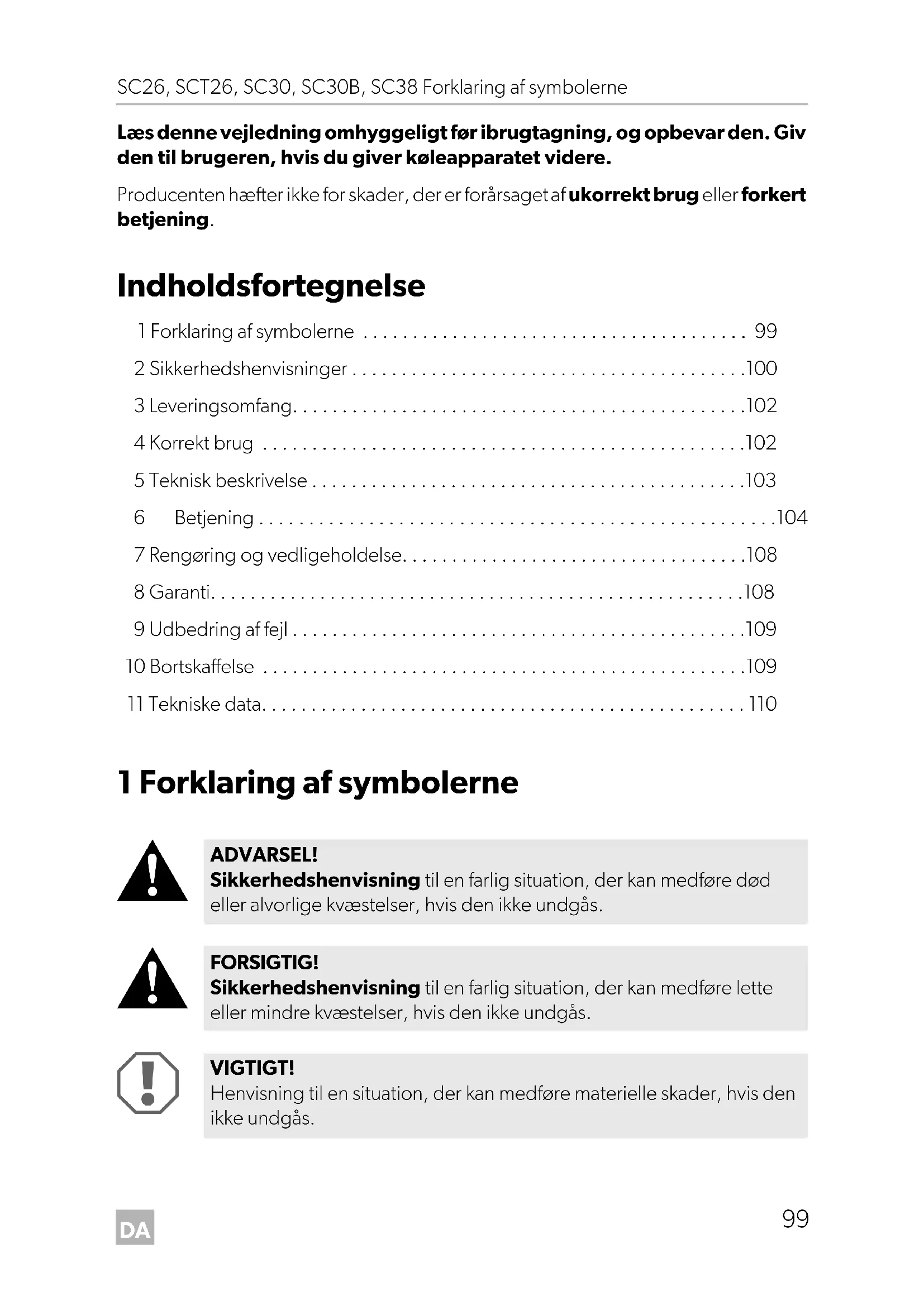 ADVARSEL! Sikkerhedshenvisning til en farlig situation, der kan medføre død eller alvorlige kvæstelser, hvis den ikke undgås. FORSIGTIG! Sikkerhedshenvisning til en farlig situation, der kan medføre lette eller mindre kvæstelser, hvis den ikke undgås. VIGTIGT! Henvisning til en situation, der kan medføre materielle skader, hvis den ikke undgås. SC26-SCT26-SC30-SC38_OPM_EMEA16.book Seite 99 Mittwoch, 19. Juni 2019 8:51 20DA Sikkerhedshenvisninger SC26, SCT26, SC30, SC30B, SC38
