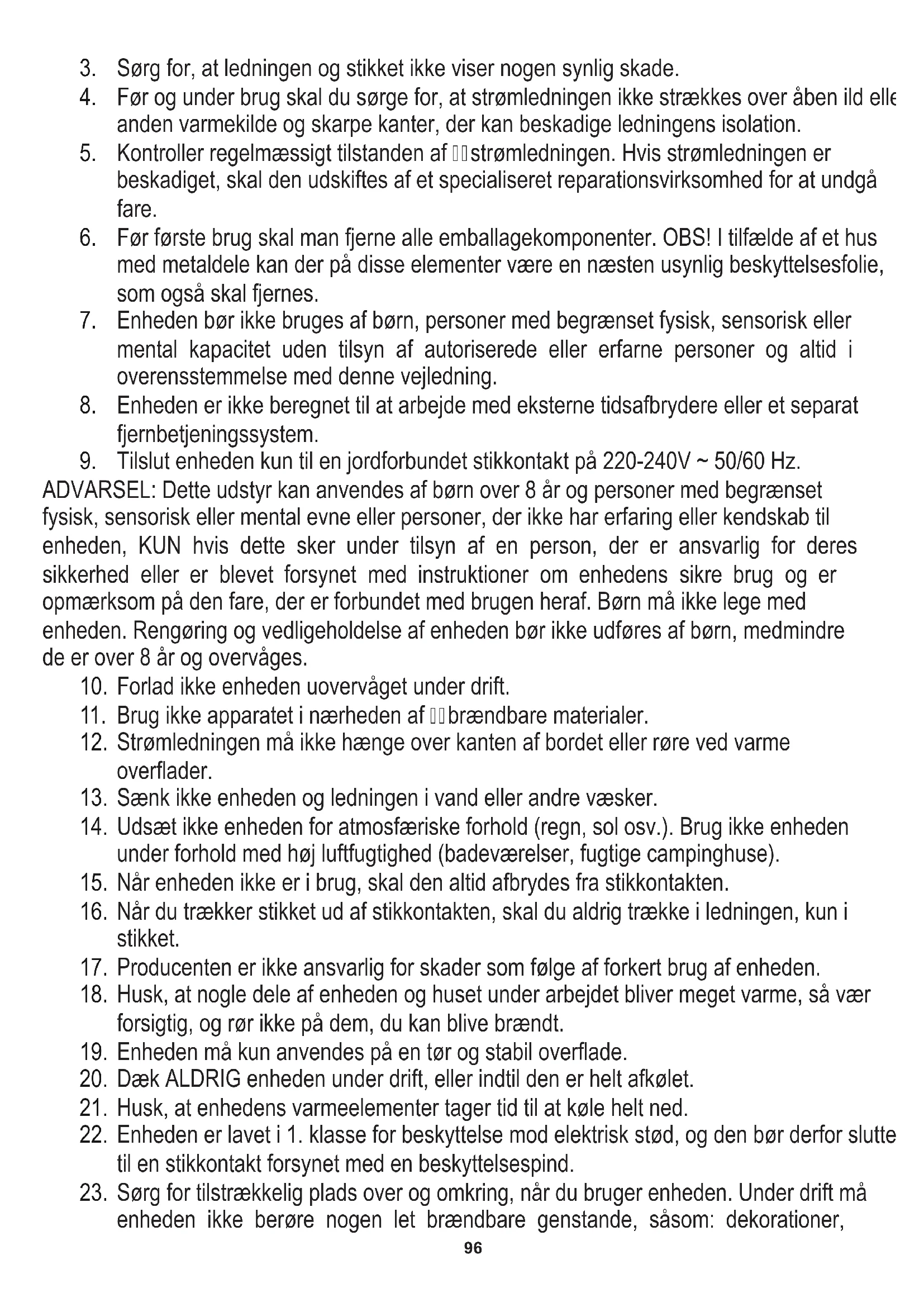 ADVARSEL: Dette udstyr kan anvendes af børn over 8 år og personer med begrænset fysisk, sensorisk eller mental evne eller personer, der ikke har erfaring eller kendskab til enheden, KUN hvis dette sker under tilsyn af en person, der er ansvarlig for deres sikkerhed eller er blevet forsynet med instruktioner om enhedens sikre brug og er opmærksom på den fare, der er forbundet med brugen heraf. Børn må ikke lege med enheden. Rengøring og vedligeholdelse af enheden bør ikke udføres af børn, medmindre de er over 8 år og overvåges.