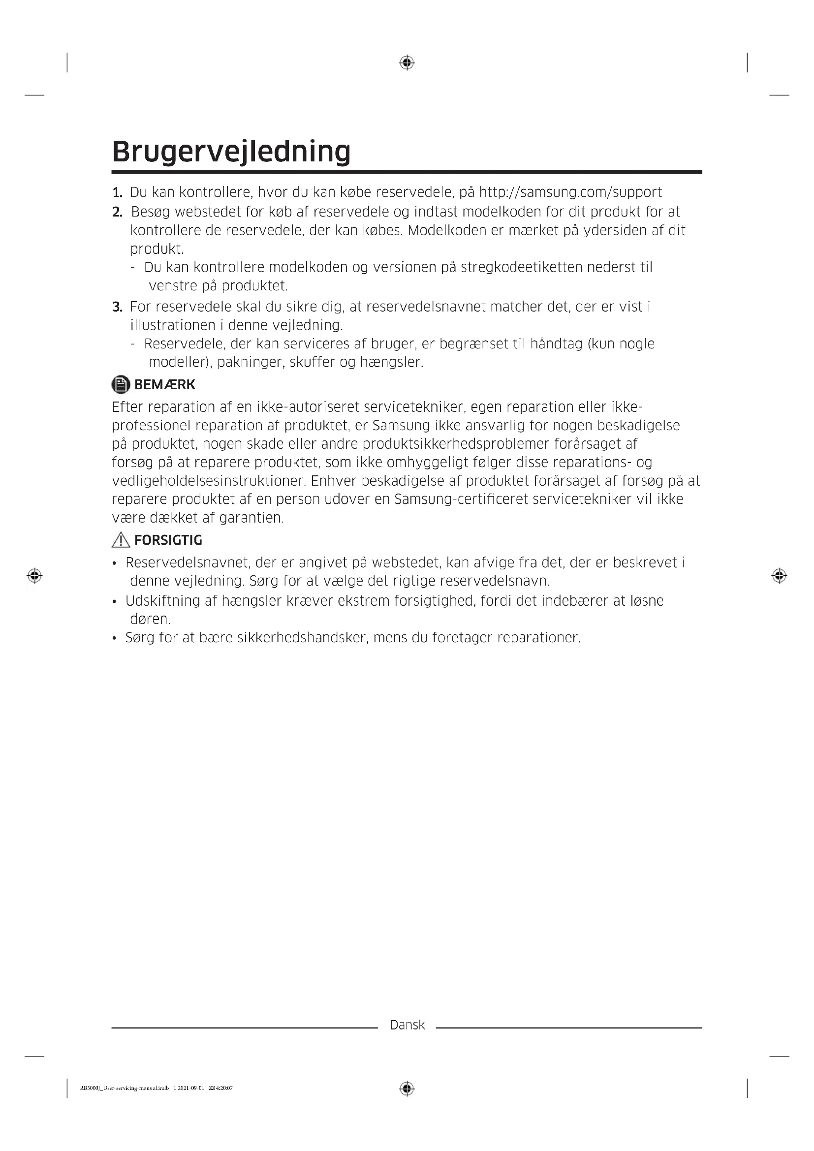 illustrationen i denne vejledning. - Reservedele, der kan serviceres af bruger, er begrænset til håndtag (kun nogle modeller), pakninger, skuffer og hængsler. BEMÆRK Efter reparation af en ikke-autoriseret servicetekniker, egen reparation eller ikke- professionel reparation af produktet, er Samsung ikke ansvarlig for nogen beskadigelse på produktet, nogen skade eller andre produktsikkerhedsproblemer forårsaget af forsøg på at reparere produktet, som ikke omhyggeligt følger disse reparations- og vedligeholdelsesinstruktioner. Enhver beskadigelse af produktet forårsaget af forsøg på at reparere produktet af en person udover en Samsung-certiceret servicetekniker vil ikke være dækket af garantien. FORSIGTIG