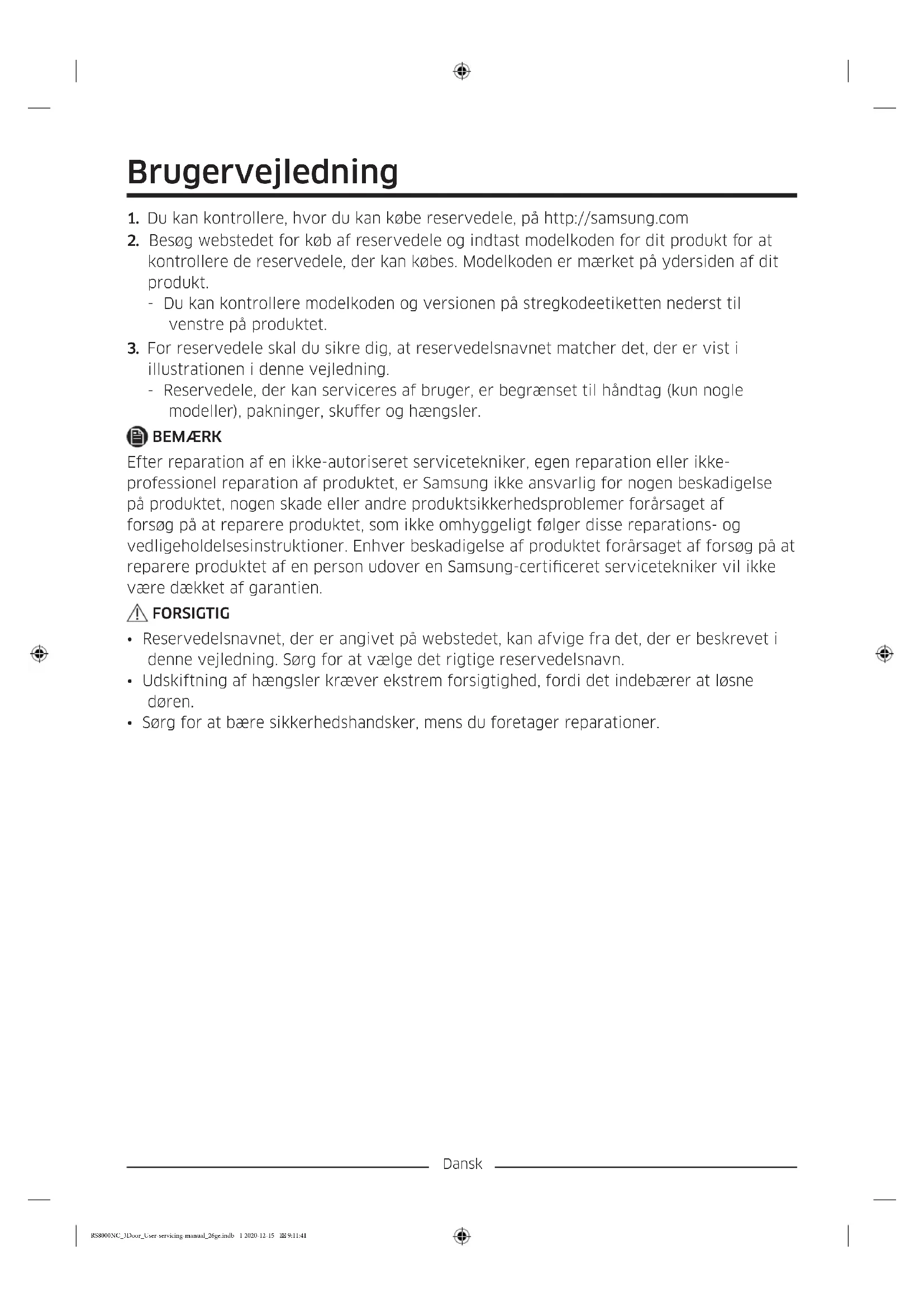 - Sørg for at bære sikkerhedshandsker, mens du foretager reparationer. RS8000NC_3Door_User-servicing-manual_26ge.indb 1 2020-12-15 9:11:41Dansk Det faktiske billede og køleskabets medfølgende dele afviger muligvis afhængigt af model og land.