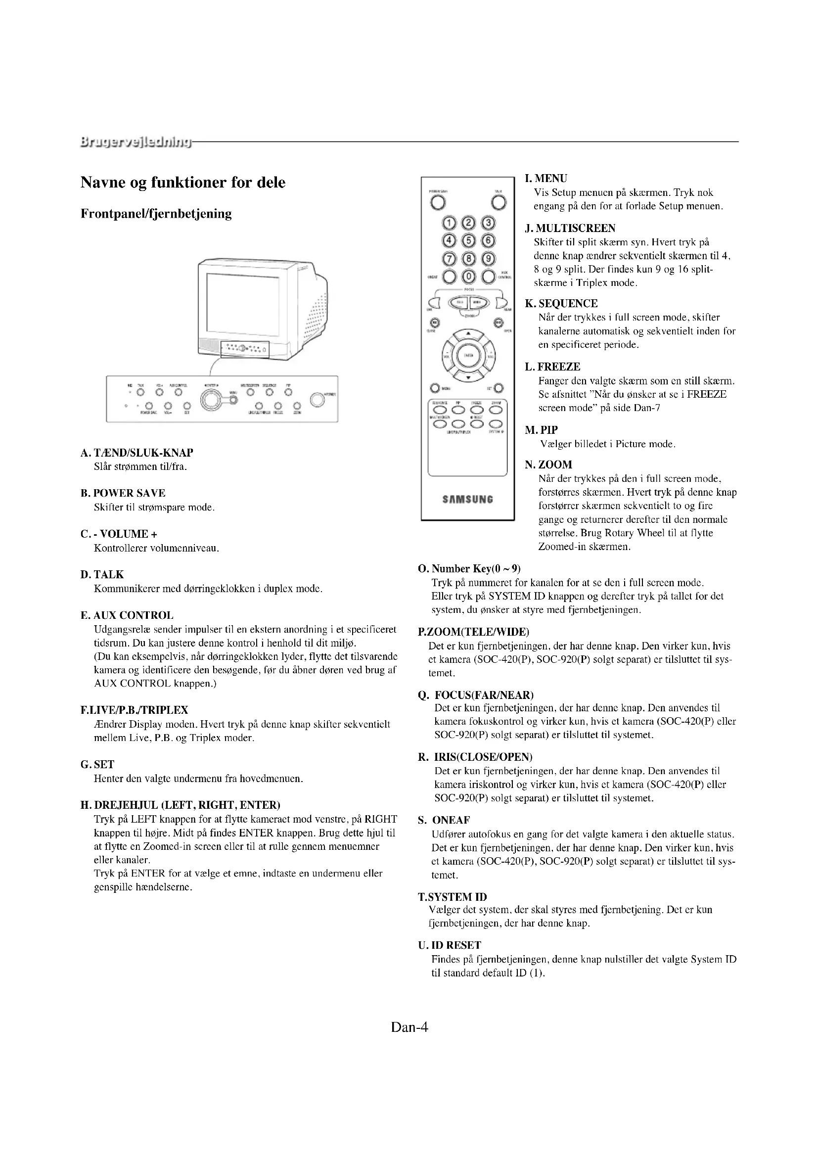 Vis Setup menuen på skærmen. Tryk nok engang på den for at forlade Setup menuen. J. MULTISCREEN Skifter til split skærm syn. Hvert tryk på denne knap ændrer sekventielt skærmen til 4, 8 og 9 split. Der findes kun 9 og 16 split- skærme i Triplex mode. K. SEQUENCE Når der trykkes i full screen mode, skifter kanalerne automatisk og sekventielt inden for en specificeret periode. L. FREEZE Fanger den valgte skærm som en still skærm. Se afsnittet ”Når du ønsker at se i FREEZE screen mode” på side Dan-7 M. PIP Vælger billedet i Picture mode. N. ZOOM Når der trykkes på den i full screen mode, forstørres skærmen. Hvert tryk på denne knap forstørrer skærmen sekventielt to og fire gange og returnerer derefter til den normale størrelse. Brug Rotary Wheel til at flytte Zoomed-in skærmen. O. Number Key(0 ~ 9) Tryk på nummeret for kanalen for at se den i full screen mode. Eller tryk på SYSTEM ID knappen og derefter tryk på tallet for det system, du ønsker at styre med fjernbetjeningen. P. ZOOM(TELE/WIDE) Det er kun fjernbetjeningen, der har denne knap. Den virker kun, hvis et kamera (SOC-420(P), SOC-920(P) solgt separat) er tilsluttet til sys- temet. Q. FOCUS(FAR/NEAR) Det er kun fjernbetjeningen, der har denne knap. Den anvendes til kamera fokuskontrol og virker kun, hvis et kamera (SOC-420(P) eller SOC-920(P) solgt separat) er tilsluttet til systemet. R. IRIS(CLOSE/OPEN) Det er kun fjernbetjeningen, der har denne knap. Den anvendes til kamera iriskontrol og virker kun, hvis et kamera (SOC-420(P) eller SOC-920(P) solgt separat) er tilsluttet til systemet. S. ONEAF Udfører autofokus en gang for det valgte kamera i den aktuelle status. Det er kun fjernbetjeningen, der har denne knap. Den virker kun, hvis et kamera (SOC-420(P), SOC-920(P) solgt separat) er tilsluttet til sys- temet.