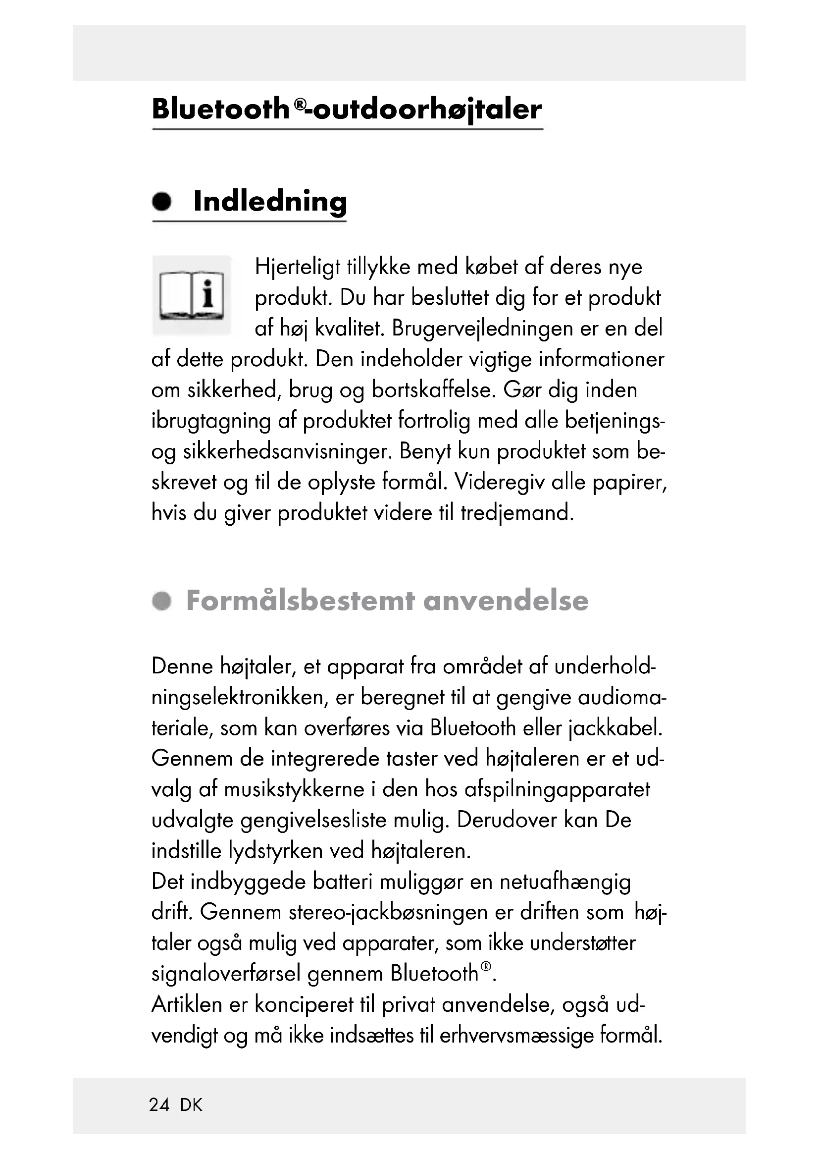 -outdoorhøjtaler Indledning Hjerteligt tillykke med købet af deres nye produkt. Du har besluttet dig for et produkt af høj kvalitet. Brugervejledningen er en del af dette produkt. Den indeholder vigtige informationer om sikkerhed, brug og bortskaffelse. Gør dig inden ibrugtagning af produktet fortrolig med alle betjenings- og sikkerhedsanvisninger. Benyt kun produktet som be- skrevet og til de oplyste formål. Videregiv alle papirer, hvis du giver produktet videre til tredjemand. Formålsbestemt anvendelse Denne højtaler, et apparat fra området af underhold- ningselektronikken, er beregnet til at gengive audioma- teriale, som kan overføres via Bluetooth eller jackkabel. Gennem de integrerede taster ved højtaleren er et ud- valg af musikstykkerne i den hos afspilningapparatet udvalgte gengivelsesliste mulig. Derudover kan De indstille lydstyrken ved højtaleren. Det indbyggede batteri muliggør en netuafhængig drift. Gennem stereo-jackbøsningen er driften som høj- taler også mulig ved apparater, som ikke understø tter signaloverførsel gennem Bluetooth