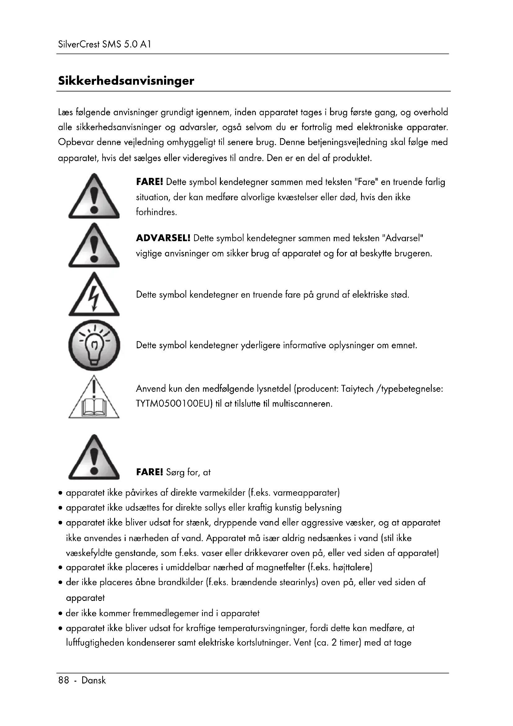 FARE! Lysnetdel Tilslut kun lysnetdelen til en dertil egnet og altid let tilgængelig stikkontakt. Rør aldrig ved lysnetdelen med våde hænder. Der er risiko for elektrisk stød. Træk lysnetdelens stik ud af stikkontakten i følgende tilfælde: Hvis der er opstået en farlig situation. Hvis der kommer usædvanlige lyde eller røg fra lysnetdelen. Før stormvejr og/eller et uvejr med fare for lynnedslag. Lysnetdelen er beskadiget. Hvis lysnetdelen har været udsat for regn, væske eller høj fugtighed. Hvis du ønsker at rengøre den. Lysnetdelen bruger også strøm i standby. For at afbryde strømforsyningen fuldstændigt, skal lysnetdelen trækkes ud af stikkontakten. Følg altid disse anvisninger for at undgå livsfare og brandfare! Desuden må lysnetdelen aldrig tildækkes. I modsat fald, er der risiko for brand. Forsøg aldrig at åbne lysnetdelens hus. Livsfare på grund af elektrisk stød.SilverCrest SMS 5.0 A1