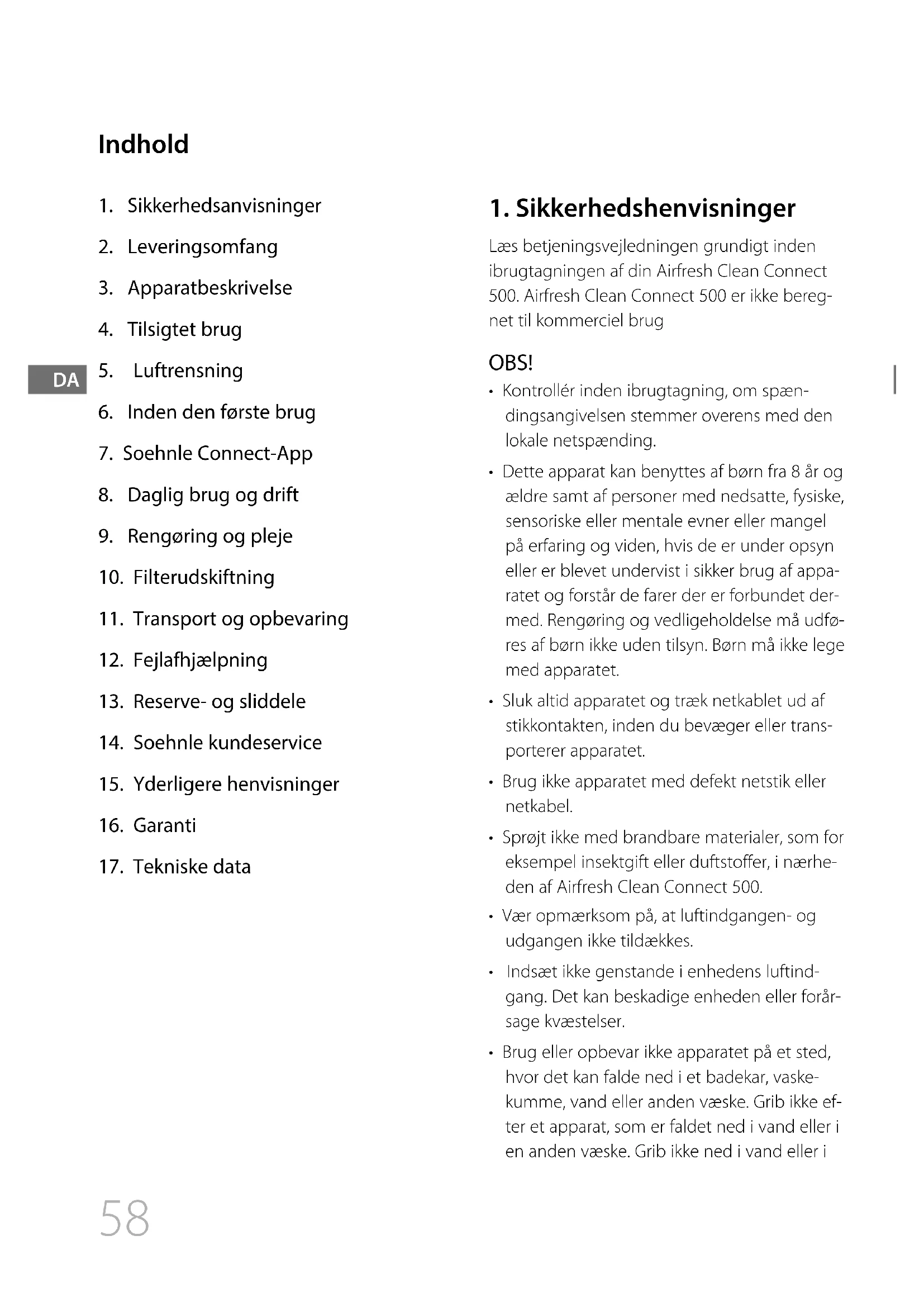 - Brug ikke Airfresh Clean Connect 500 i nærhe- den af varmeovne, åbne pejse eller gasdrevne anordninger.