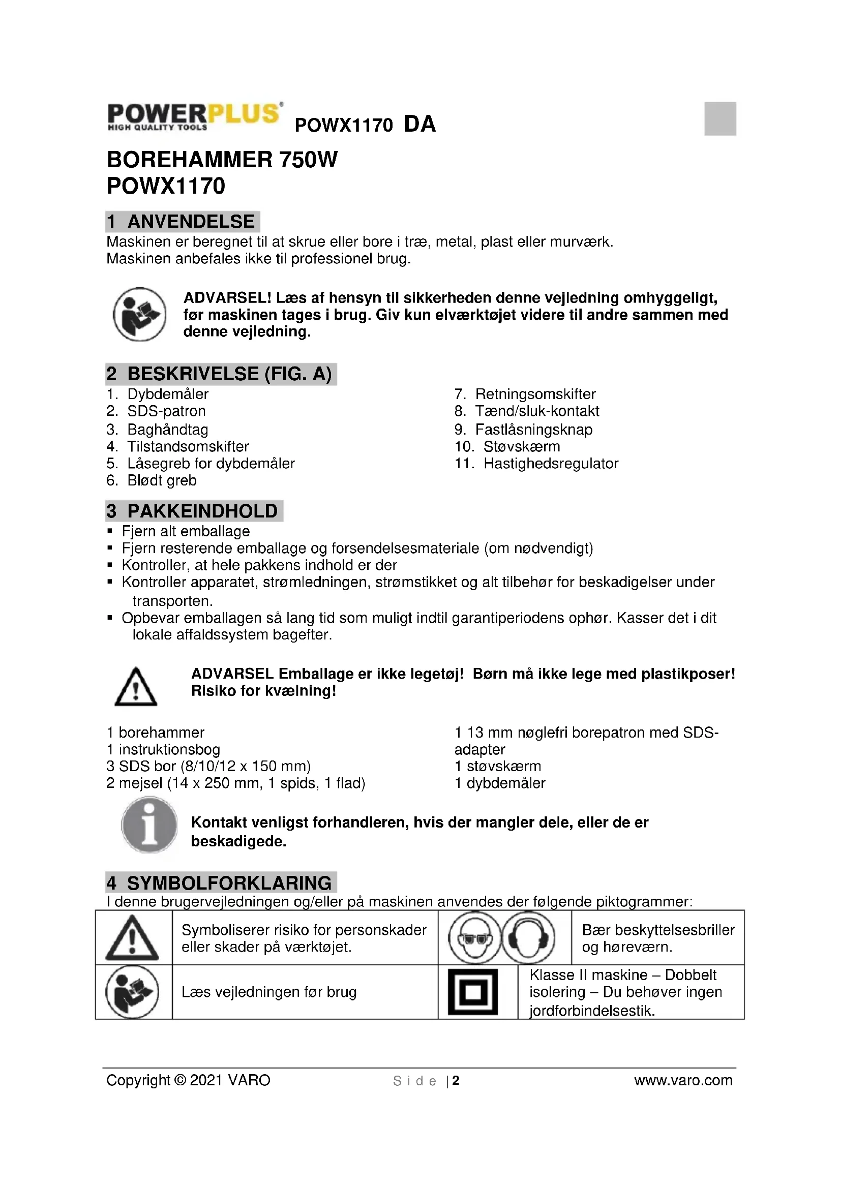 Retningsomskiteren (7) bestemmer værktøjets rotationsretning. Vælg fremadrettet rotation ved at slippe tænd/sluk-kontakten og skubbe retningsomskifteren til den højre (R) side af værktøjet. Vælg baglæns rotationsretning ved at skubbe omskifteren til den venstre (L) side af værktøjet. Når der skiftes rotationsretning, skal det sikres, at tænd/sluk-kontakten slippes samt at motoren ikke kører. 9 TEKNISKE DATA Model POWX1170 Spænding 230-240 V~ 50 Hz Indgangsstrøm 750 Watt Hastighed uden belastning 0-1050 min-1 Påvirkning 0-4900 min-1 Skafttype SDS Maks. Borekapacitet Cement 26 mm Stål 13 mm Træ 40 mm Nettovægt 4,9 kg Isoleringsklasse / II 10 STØJ Støjemissionsværdier er målt i overensstemmelse med gældende standarder. (K=3) Lydtryksniveau LpA 91 dB(A) Lydeffektniveau LwA 102 dB(A) BEMÆRK: brug høreværn når lydtrykket er over 85 dB(A). aw (Vibrationsniveau): 8,7 m/s² K = 1,5 m/s²POWX1170 DA Copyright © 2021 VARO S i d e | 8 www.varo.com 11 VEDLIGEHOLDELSE Hold altid boremaskinen ren. Brug ikke ætsende midler til rengøring af plastdelene. Kontrollér kulbørsterne ved overdreven gnistdannelse. Hold ventilationsspalterne frie. 12 GARANTI Produktet dækkes af garanti i en periode på 36 måneder fra den første købers købsdato. Garantien dækker alle materiale- eller produktionsfejl. Den omfatter ikke: batterier, opladere, dele, der udsættes for normal slitage, såsom lejer, børster, ledninger, stik eller tilbehør såsom bor, borebits, savklinger, osv., beskadigelse eller defekter som følge af misbrug, ulykke eller ændring eller transportomkostninger. Beskadigelse og/eller defekter som følge af misbrug er heller ikke omfattet af nærværende garanti. Vi fraskriver os også alt ansvar for enhver personskade som følge af forkert brug af værktøjet. Reparationer må kun udføres af et autoriseret kundeservicecenter til Powerplus-værktøjer. Du kan altid få mere information på tlf. 00 32 3 292 92 90. Alle transportomkostninger skal altid afholdes af kunden, medmindre andet er aftalt skriftligt. Ligeledes kan der ikke forlanges erstatning under nærværende garanti, hvis skaden på apparatet er opstået som følge af uagtsom vedligeholdelse eller overbelastning. Garantien dækker ikke skader der opstår som følge af gennemtrængt væske, overdreven støveksponering, bevidst beskadigelse (forsætligt eller ved grov uagtsomhed), upassende anvendelse (brug til formål som apparatet ikke er egnet til), ukompetent brug (såsom ikke at respektere instrukserne i denne vejledning), inkompetent montering, lynnedslag, forkert netspænding. Denne liste er ikke fuldstændig. Accept af krav under garantien kan ikke føre til forlængelse af garantiperioden eller påbegyndelsen af en ny garantiperiode, hvis apparatet udskiftes. Apparater eller dele, som udskiftes under garantien, bliver Varo NV's ejendom. Vi forbeholder os retten til at afvise alle krav, hvis købet ikke kan bekræftes, eller hvis det er tydeligt, at produktet ikke har været behørigt vedligeholdt. (rene udluftningsåbninger, regelmæssig service af kulbørster,…) Købskvitteringen skal opbevares som bevis på købsdatoen. Det samlede værktøj skal returneres til forhandleren i rimelig ren stand, i den originale blæseformede æske (hvis relevant for enheden) sammen med købsdokumentation. 13 MILJØ Hvis maskinen skal skiftes ud efter lang tids brug, må den ikke bortskaffes som husholdningsaffald, men skal bortskaffes på en miljømæssigt forsvarlig måde. Affald produceret af de elektriske maskiner må ikke behandles som normalt husaffald. Sørg for at genbruge det, hvor der findes egnede anlæg til det. Kontakt den lokale instans eller forhandleren for at få rådgivning om indsamling og bortskaffelse.POWX1170 DA Copyright © 2021 VARO S i d e | 9 www.varo.com 14 KONFORMITETSERKLÆRING VARO N.V – Vic. Van Rompuy N.V.- Joseph Van Instraat 9 – BE2500 Lier – Belgien, erklærer hermed, at Apparatbeskrivelse: Borehammer 750 W Mærke: PowerPlus Varenummer: POWX1170 er i overensstemmelse med de væsentlige krav og andre relevante bestemmelser i gældende europæiske direktiver, der er baseret på anvendelse af europæiske harmoniserede standarder. Enhver uautoriseret modifikation af apparatet ugyldiggør denne erklæring. EU-direktiver (herunder eventuelle tillæg frem til datoen for undertegnelsen): 2006/42/EF 2014/30/EU 2011/65/EU Harmoniserede europæiske standarder (herunder eventuelle tillæg frem til datoen for undertegnelsen): EN60745-1 : 2009 EN60745-2-6 : 2010 EN55014-1 : 2017 EN55014-2 : 2015 EN61000-3-2 : 2014 EN61000-3-3 : 2013 Indehaver af den tekniske dokumentation: Philippe Vankerkhove, VARO - Vic. Van Rompuy N.V. Undertegnede handler på vegne af selskabets administrerende direktør, Philippe Vankerkhove Regulatory Affairs (afdelingen for juridiske anliggender) – Compliance Manager 09/10/2020, Lier - BelgiumPOWX1170 SV Copyright © 2021 VARO S i d a | 1 www.varo.com