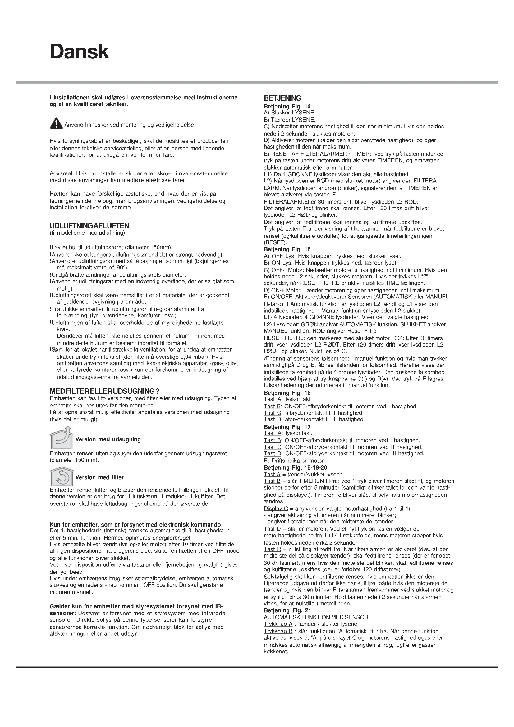 (til modellerne med udluftning) ! Lav et hul til udluftningsrøret (diameter 150mm). ! Anvend ikke et længere udluftningsrør end det er strengt nødvendigt. ! Anvend et udluftningsrør med så få bøjninger som muligt (bøjningernes må maksimalt være på 90°). ! Undgå bratte ændringer af udluftningsrørets diameter. ! Anvend et udluftningsrør med en indvendig overflade, der er så glat som muligt. ! Udluftningsrøret skal være fremstillet i et af materiale, der er godkendt af gældende lovgivning på området. ! Tilslut ikke emhætten til udluftningsrør til røg der stammer fra forbrænding (fyr, brændeovne, komfurer, osv.). ! Udluftningen af luften skal overholde de af myndighederne fastlagte krav. Derudover må luften ikke udluftes gennem et hulrum i muren, med mindre dette hulrum er bestemt indrettet til formålet. ! Sørg for at lokalet har tilstrækkelig ventilation, for at undgå at emhætten skaber undertryk i lokalet (der ikke må overstige 0,04 mbar). Hvis emhætten anvendes samtidig med ikke-elektriske apparater, (gas-, olie-, eller kulfyrede komfurer, osv.) kan der forekomme en indsugning af udstødningsgasserne fra varmekilden. MED FILTER ELLER UDSUGNING ? Emhætten kan fås i to versioner, med filter eller med udsugning. Typen af emhætte skal besluttes før den monteres. Få at opnå størst mulig effektivitet anbefales versionen med udsugning (hvis det er muligt). Version med udsugning Emhætten renser luften og suger den udenfor gennem udsugningsrøret (diameter 150 mm). Version med filter Emhætten renser luften og blæser den rensende luft tilbage i lokalet. Til denne version er der brug for: 1 luftskærm, 1 reduktor, 1 kulfilter. Det øverste rør skal have luftudsugningshullerne på den øverste del. Kun for emhætter, som er forsynet med elektronisk kommando: Det 4. hastighedstrin (intensiv) sænkes automatiske til 3. hastighedstrin efter 5 min. funktion. Hermed optimeres energiforbruget. Hvis emhætte bliver tændt (lys og/eller motor) efter 10 timer ved tilfælde af ingen dispositioner fra brugerens side, skifter emhætten til en OFF mode og alle funktioner bliver slukket. Ved hver disposition udførte via tastatur eller fjernebetjening (valgfri) gives der lyd ”beep” Hvis under emhættens brug sker strømafbrydelse, emhætten automatisk slukkes og enhedens knap kommer i OFF position. Du skal genstarte motoren manuelt. Gælder kun for emhætter med styresystemet forsynet med IR- sensorer: Udstyret er forsynet med et styresystem med infrarøde sensorer. Direkte sollys på denne type sensorer kan forstyrre sensorernes korrekte funktion. Om nødvendigt blok for sollys med afskærmninger eller andet udstyr. BETJENING Betjening Fig. 14 A) Slukker LYSENE. B) Tænder LYSENE. C) Nedsætter motorens hastighed til den når minimum. Hvis den holdes nede i 2 sekunder, slukkes motoren. D) Aktiverer motoren (kalder den sidst benyttede hastighed), og øger hastigheden til den når maksimum. E) RESET AF FILTERALARMER / TIMER: ved tryk på tasten under ed tryk på tasten under motorens drift aktiveres TIMEREN, og emhætten slukker automatisk efter 5 minutter. L1) De 4 GRØNNE lysdioder viser den aktuelle hastighed. L2) Når lysdioden er RØD (med slukket motor) angiver den FILTERA- LARM. Når lysdioden er grøn (blinker), signalerer den, at TIMEREN er blevet aktiveret via tasten E. FILTERALARM:Efter 30 timers drift bliver lysdioden L2 RØD. Det angiver, at fedfiltrene skal renses. Efter 120 times drift bliver lysdioden L2 RØD og blinker. Det angiver, at fedtfiltrene skal renses og kulfiltrene udskiftes. Tryk på tasten E under visning af filteralarmen når fedtfiltrene er blevet renset (og/kulfiltrene udskiftet) fot at igangsætte timetællingen igen (RESET). Betjening Fig. 15 A) OFF Lys: Hvis knappen trykkes ned, slukker lyset. B) ON Lys: Hvis knappen trykkes ned, tænder lyset. C) OFF/- Motor: Nedsætter motorens hastighed indtil minimum. Hvis den holdes nede i 2 sekunder, slukkes motoren. Hvis der trykkes i “2” sekunder, når RESET FILTRE er aktiv, nulstilles TIME-tællingen. D) ON/+ Motor: Tænder motoren og øger hastigheden indtil maksimum. E) ON/OFF: Aktiverer/deaktiverer Sensoren (AUTOMATISK eller MANUEL tilstand). I Automatisk funktion er lysdioden L2 tændt og L1 viser den indstillede hastighed. I Manuel funktion er lysdioden L2 slukket L1) 4 lysdioder: 4 GRØNNE lysdioder. Viser den valgte hastighed. L2) Lysdioder: GRØN angiver AUTOMATISK funktion. SLUKKET angiver MANUEL funktion. RØD angiver Reset Filtre RESET FILTRE: den markeres med slukket motor i 30”: Efter 30 timers drift lyser lysdioden L2 RØDT. Efter 120 timers drift lyser lysdioden L2 RØDT og blinker. Nulstilles på C. Ændring af sensorens følsomhed: I manuel funktion og hvis man trykker samtidigt på D og E, åbnes tilstanden for følsomhed. Herefter vises den indstillede følsomhed på de 4 grønne lysdioder. Den ønskede følsomhed indstilles ved hjælp af trykknapperne C(-) og D(+). Ved tryk på E lagres følsomheden og der returneres til manuel funktion. Betjening Fig. 16 Tast A: lyskontakt. Tast B: ON/OFF-afbryderkontakt til motoren ved I hastighed. Tast C: afbryderkontakt til II hastighed. Tast D: afbryderkontakt til III hastighed. Betjening Fig. 17 Tast A: lyskontakt. Tast B: ON/OFF-afbryderkontakt til motoren ved I hastighed. Tast C: ON/OFF-afbryderkontakt til motoren ved II hastighed. Tast D: ON/OFF-afbryderkontakt til motoren ved III hastighed. E: Driftsindikator motor. Betjening Fig. 18-19-20 Tast A = tænder/slukker lysene. Tast B = slår TIMEREN til/fra: ved 1 tryk bliver timeren slået til, og motoren stopper derfor efter 5 minutter (samtidigt blinker tallet for den valgte hasti- ghed på displayet). Timeren forbliver slået til selv hvis motorhastigheden ændres. Display C = angiver den valgte motorhastighed (fra 1 til 4); - angiver aktivering af timeren når nummeret blinker; - angiver filteralarmen når den midterste del tænder Tast D = starter motoren; Ved et nyt t