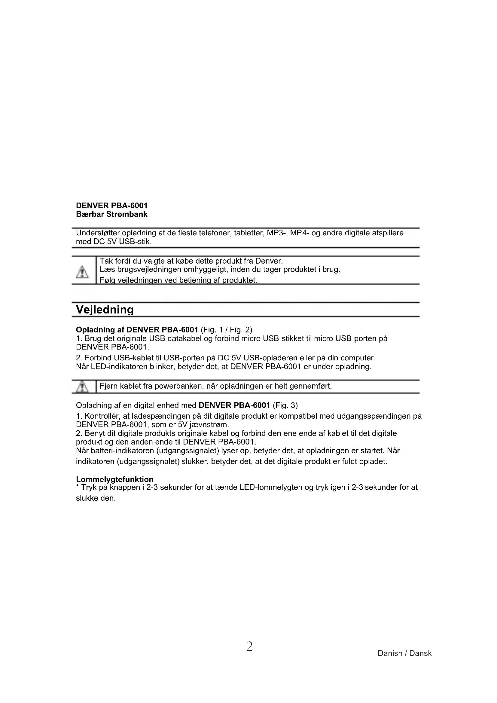 - Kontroller, at ladespaendingen på dit digitale produit er kompatibel med udgangsspaendingen på DENVER PBA-6001, som er 5V jævnstrøm.