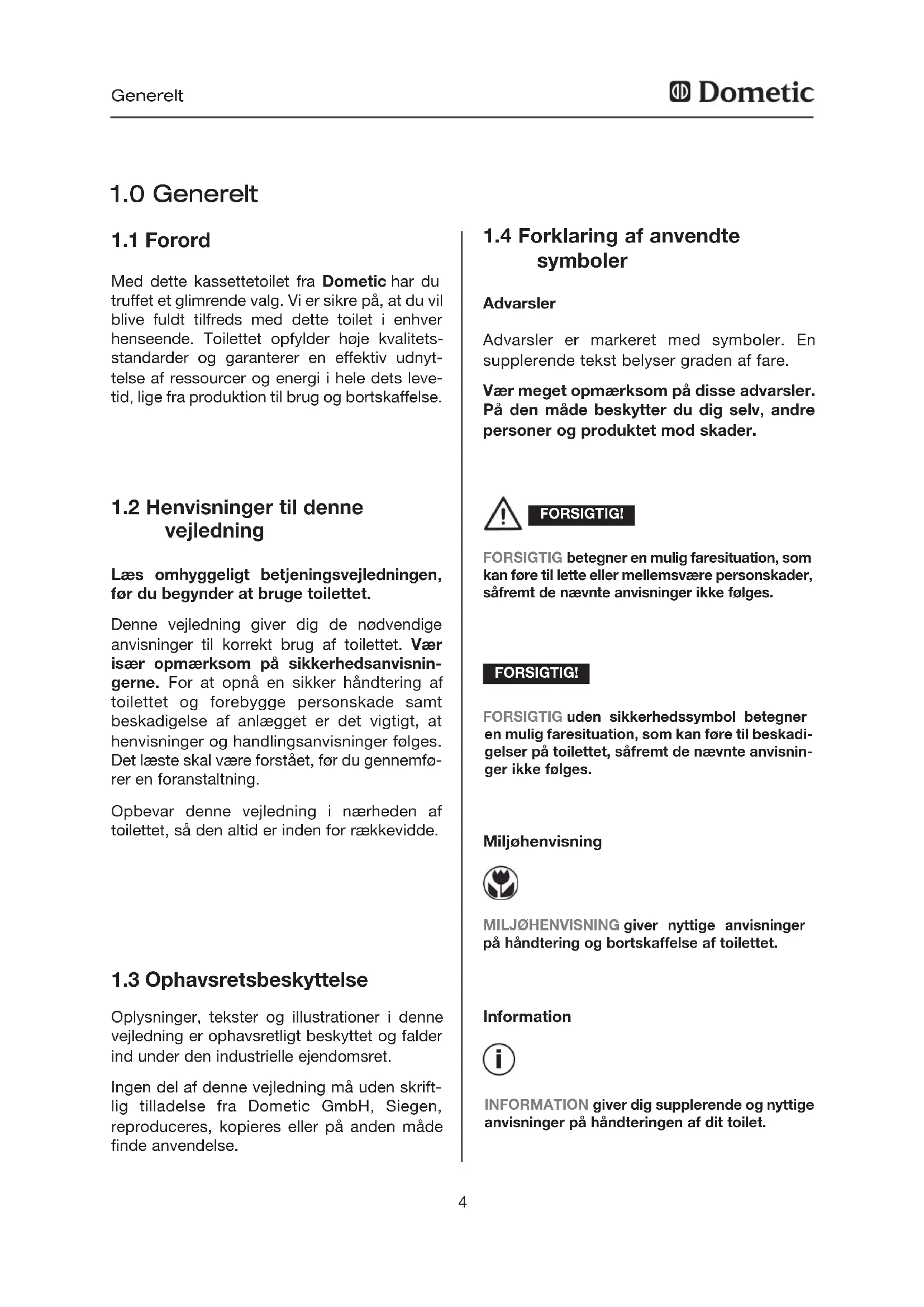 Med dette kassettetoilet fra Dometic har du truffet et glimrende valg. Vi er sikre på, at du vil blive fuldt tilfreds med dette toilet i enhver henseende. Toilettet opfylder høje kvalitets- standarder og garanterer en effektiv udnyt- telse af ressourcer og energi i hele dets leve- tid, lige fra produktion til brug og bortskaffelse.