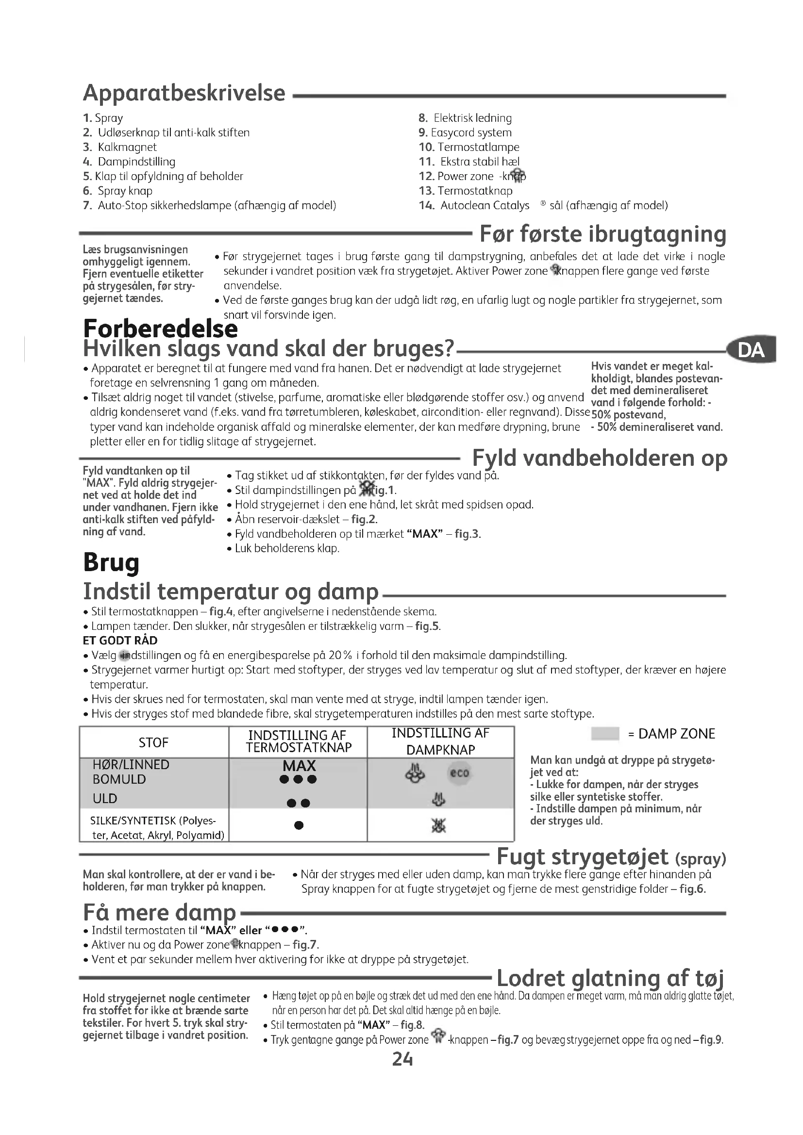 - Tryk gentagne gange på Power zone -knappen – fig.7 og bevæg strygejernet oppe fra og ned – fig.9. Læs brugsanvisningenomhyggeligt igennem.Fjern eventuelle etiketterpå strygesålen, før stry-gejernet tændes.Fyld vandtanken op til"MAX". Fyld aldrig strygejer-net ved at holde det indunder vandhanen. Fjern ikkeanti-kalk stiften ved påfyld-ning af vand.Hvis vandet er meget kal-kholdigt, blandes postevan-det med demineraliseretvand i følgende forhold: -50% postevand,- 50% demineraliseret vand.= DAMP ZONEMan kan undgå at dryppe på strygetø-jet ved at:- Lukke for dampen, når der strygessilke eller syntetiske stoffer.- Indstille dampen på minimum, nårder stryges uld. STOF