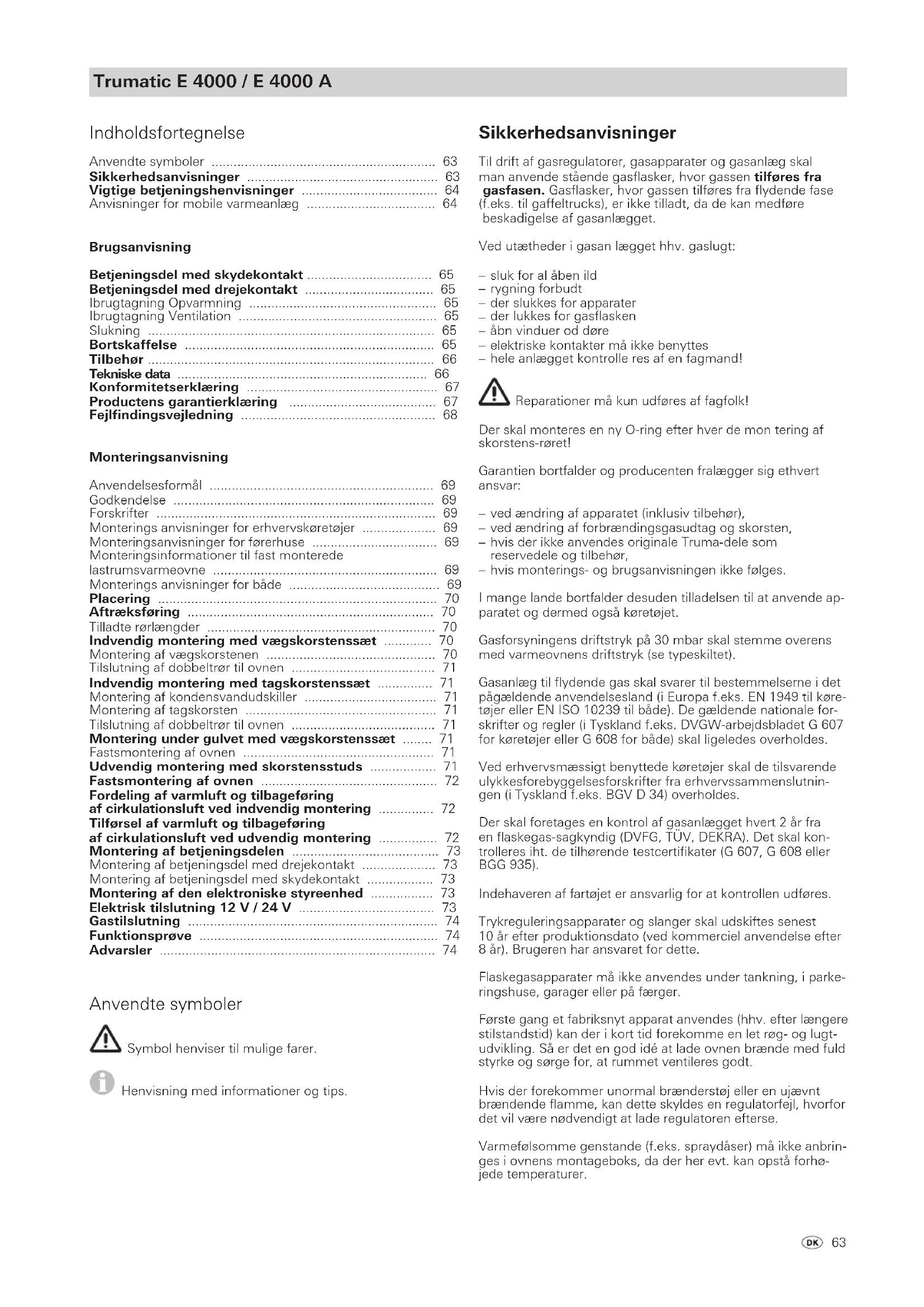 Anvendte symboler Symbol henviser til mulige farer. Henvisning med informationer og tips.64 Til gasanlægget må der iht. EN 12864 (i køretøjer) eller EN ISO 10239 (for både) kun anvendes trykreguleringer med et fast udgangstryk på 30 mbar. Trykreguleringens flow skal min. svare til det samlede maks. forbrug for de af anlægspro- ducenten installerede apparater. Til køretøjer anbefaler vi gastryksreguleringsanlæg Truma SecuMotion / MonoControl CS samt gastryksreguleringsan- læg Truma DuoComfort / DuoControl CS til toflaske-gasanlæg. Ved temperaturer omkring 0 °C og derunder bør gastrykregu- latoren eller skifteventilen anvendes sammen med regulator- opvarmningen EisEx. Til regulatoren må der kun anvendes tilslutningsslanger, der overholder anvendelseslandets krav. Slangerne skal jævnligt undersøges for lækage. Der bør anvendes specialslanger til drift om vinteren. Ifald trykregulatoren udsættes for vind og vejr – især på last- biler – skal regulatoren altid beskyttes ved hjælp af en Truma- beskyttelseskappe. (Standardtilbehør i monteringssættet til lastbiler). Vigtige betjeningshenvisninger Hvis kaminen placeres i nærheden eller direkte under et vindue, der kan åbnes, skal apparatet være udstyret med en automatisk slukkeanordning for at forhindre drift ved åbent vindue. Det dobbelte aftræksrør skal regelmæssigt, især efter længere ture, kontrolleres med henblik på, om der er sket beskadigel- ser, og om tilslutningen stadig er i orden. Endvidere skal appa- ratets og skorstenens fastgørelse kontrolleres. Efter en hurtig forbrænding (fejltænding) skal aftrækslednin- gen kontrolleres af en fagmand! På ovne, som er monteret uden for køretøjet, skal de fleksible luftrør regelmæssigt kontrolleres for beskadigelser. Et beska- diget rør kan eventuelt være årsagen til, at røggas trænger ind i køretøjet. Skorstenen for aftræksledning og tilførsel af forbrændingsluft skal altid holdes fri for forurening (slud, løv etc.) Den indbyggede temperaturbegrænser lukker for gastilførslen, hvis apparatet bliver for varmt. Varmluftud gangene og åbnin- gen for tilbageføring af cirkulationsluft må derfor ikke lukkes. Hvis det elektroniske styreprint er defekt, returneres det i velemballeret (polstret) stand. Bliver dette ikke overholdt, bortfalder ethvert krav i henhold til garantien. Som reservedel anvendes udelukkende det originale styreprint! Til opvarmning under kørsel skal der iht. direktiv 2004/78/EF i motorcampingvogne anvendes en sikkerhedsspærreanordning. Gastryksreguleringsanlæg Truma SecuMotion / MonoControl CS opfylder dette krav. Hvis der ikke er installeret en sikkerhedsafspærringsan- ordning (fx gastryksreguleringsanlæg Truma SecuMotion / MonoControl CS), skal gasflasken være lukket under kørslen og der skal anbringes informationsskilte i flaskeskabet og i nærheden af betjeningsdelen. Til opvarmning under kørsel i campingvogne an- befaler vi af sikkerhedsmæssige årsager ligeledes sikkerhedspærreanordningen. Ved aftræksledning under bunden skal køretøjets bund være tæt. Desuden skal mindst tre af siderne under køretø jets bund være frie for at sikre, at røggassen uhindret kan passere (sne, skørt etc.). Anvisninger for mobile varmeanlæg De mobile lastrumsovne fra Truma er godkendt af branche- foreningen. Det drejer sig om komplette ovnanlæg, som efter behof kan løftes op på ladet sammen med det øvrige trans- portgods. Ovnene er fuldstyændig uafhængige og behøver ingen form for exsterne tilslutninger. Godkendelsen gælder udelukkende de originale af Truma fremstillede mobilelastrumsovne. Eventuelle modifikationer udført af trejdepart er ikke godkendte! Enhver garanti for sik- kerhed og funktion verdrørende modificerede lastrumsovne bortfalder for Trumas vedkommende. Må ikke benyttes i køretøj til transport af farligt gods.65 Læs altid brugsanvisningen og »Vigtige betjeningshen- visninger«, før apparatet tages i brug! Ejeren af køretøjet er ansvarlig for, at apparatet kan betjenes på den korrekte måde! Den gule mærkat med advarselshenvisninger, som følger med apparatet, skal af montøren eller køretøjets indehaver placeres på et for brugeren let synligt sted i køretøjet (f.eks. på klæde- skabsdøren)! Hvis mærkaten mangler, kan den rekvireres hos Truma. Betjeningsdel med skydekontakt
