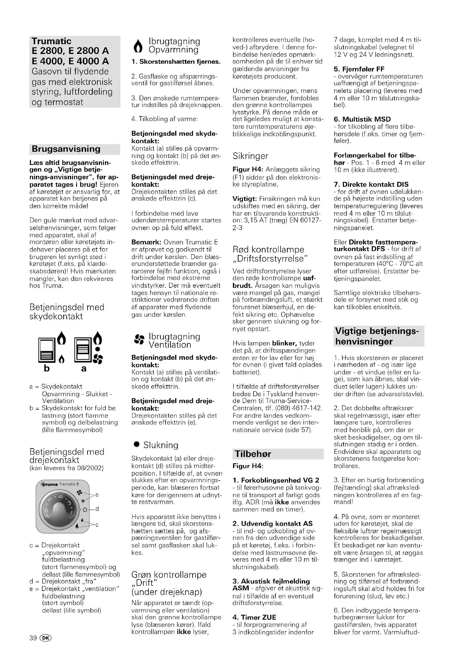 Betjeningsdel med skyde- kontakt: Kontakt (a) stilles på opvarm- ning og kontakt (b) på det øn- skede effekttrin. Betjeningsdel med dreje- kontakt: Drejekontakten stilles på det ønskede effekttrin (c). I forbindelse med lave udendørstemperaturer startes ovnen op på fuld effekt. Bemærk: Ovnen Trumatic E er afprøvet og godkendt til drift under kørslen. Den blæs- erunderstøttede brænder ga- ranterer fejlfri funktion, også i forbindelse med ekstreme vindstyrker. Der må eventuelt tages hensyn til nationale re- striktioner vedrørende driften af apparater med flydende gas under kørslen. Ibrugtagning Ventilation Betjeningsdel med skyde- kontakt: Kontakt (a) stilles på ventilati- on og kontakt (b) på det øn- skede effekttrin. Betjeningsdel med dreje- kontakt: Drejekontakten stilles på det ønskede effekttrin (e). Slukning Skydekontakt (a) eller dreje- kontakt (d) stilles på midter- position. I tilfælde af, at ovnen slukkes efter en opvarmnings- periode, kan blæseren fortsat køre for derigennem at udnyt- te restvarmen. Hvis apparatet ikke benyttes i længere tid, skal skorstens- hætten sættes på, og afs- pærringsventilen for gastilfør- sel samt gasflasken skal luk- kes. Grøn kontrollampe „Drift” (under drejeknap) Når apparatet er tændt (op- varmning eller ventilation) skal den grønne kontrollampe lyse (blæseren kører). Ifald kontrollampen ikke lyser, kontrolleres eventuelle (ho- ved-) afbrydere. I denne for- bindelse henledes opmærk- somheden på de til enhver tid gældende anvisninger fra køretøjets producent. Under opvarmningen, mens flammen brænder, fordobles den grønne kontrollampes lysstyrke. På denne måde er det ligeledes muligt at konsta- tere rumtemperaturens øje- blikkelige indkoblingspunkt. Sikringer Figur H4: Anlæggets sikring (F1) sidder på den elektronis- ke styreplatine. Vigtigt: Finsikringen må kun udskiftes med en sikring, der har en tilsvarende konstrukti- on: 3,15 AT (træg) EN 60127- 2-3 Rød kontrollampe „Driftsforstyrrelse” Ved driftsforstyrrelse lyser den røde kontrollampe uaf- brudt. Årsagen kan muligvis være mangel på gas, mangel på forbrændingsluft, et stærkt forurenet blæserhjul, en de- fekt sikring etc. Ophævelse sker gennem slukning og for- nyet opstart. Hvis lampen blinker, tyder det på, at driftsspændingen enten er for lav eller for høj for ovnen (i givet fald oplades batteriet). I tilfælde af driftsforstyrrelser bedes De i Tyskland henven- de Dem til Truma-Service- Centralen, tlf. (089) 4617-142. For andre landes vedkom- mende venligst se den inter- nationale service (side 57). Tilbehør Figur H4: