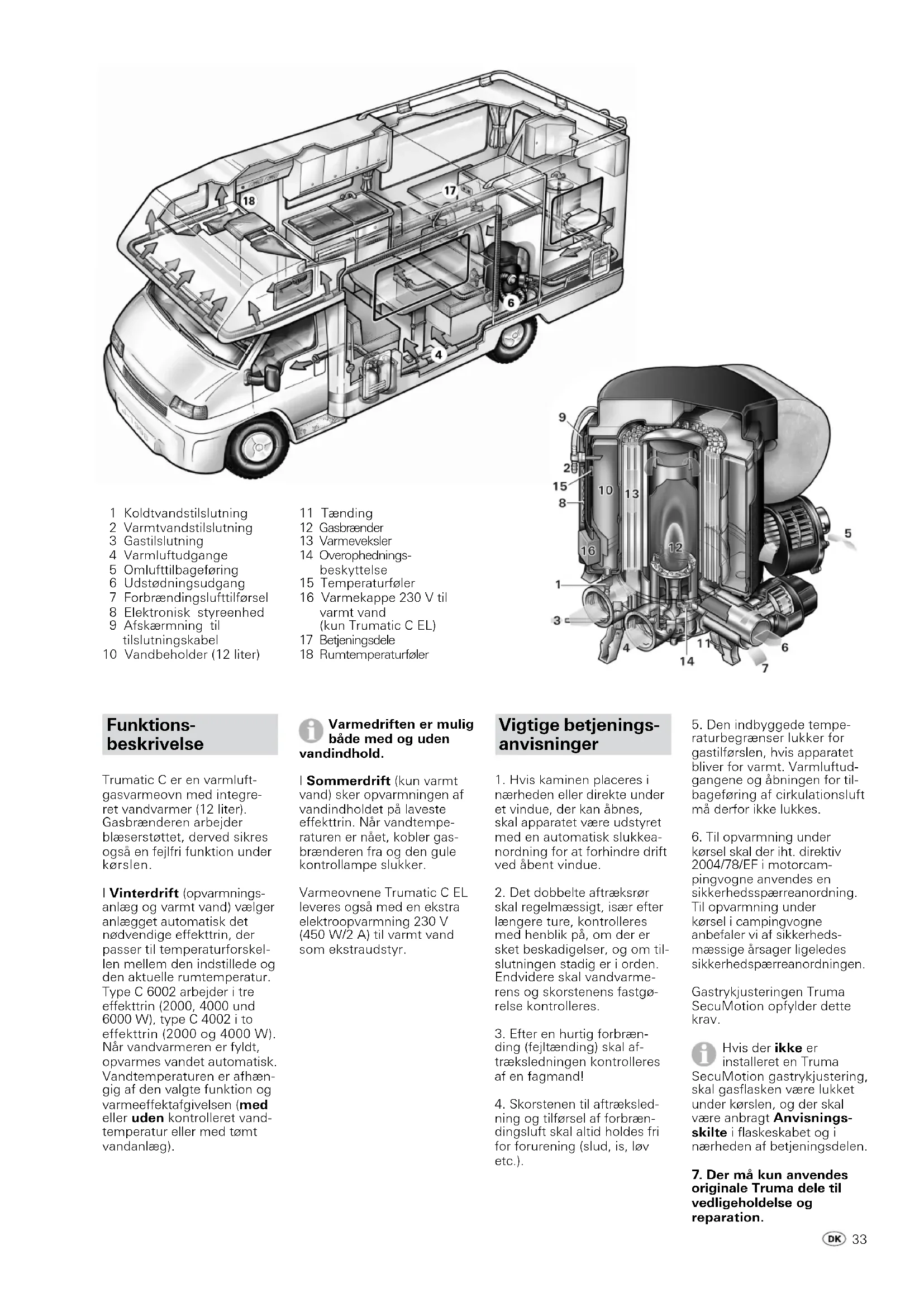Der må kun anvendes originale Truma dele til vedligeholdelse og reparation. 33Brugsanvisning Læs altid brugsanvisnin- gen og „Vigtige betje- ningsanvisninger”, før ap- paratet tages i brug! Ejeren af køretøjet er ansvarlig for, at apparatet kan betjenes på den korrekte måde. Den gule mærkat med ad- varselshenvisninger, som følger med apparatet, skal af montøren eller køretøjets indehaver placeres på et for brugeren let synligt sted (f.eks. på klædeskabsdøren)! Hvis mærkaten mangler, kan den rekvireres hos Truma. Før ibrugtagning skal den samlede vand- forsyning skylles grundigt igennem med opvarmet, rent vand. Hvis ovnen ikke er i drift, skal den tømmes for vand, ifald der er risiko for frost! Der ydes ingen garanti ved frostskader! Ovnen skal ligeledes tømmes for vand, inden der foretages reparationer eller vedlige- holdelsesarbejde (på værk- sted!), idet den elektriske sikkerheds-/aftapingsventil automatisk vil åbne, såfremt apparatet er uden strøm! Elektrisk sikkerheds-/ aftapningsventil m = Betje ningsko ntak t „lukket“ n = Betjeningskontakt „tømning“ Aftapningsventilen holdes lukket vha. en elektrisk spole. For ikke at belaste batteriet mere end nødvendigt anbefales det at åbne aftapningsventilen, hvis apparatet ikke er i brug i længere tid! Ved temperaturer under 4°C ved sikkerheds-/aftapnings- ventilen kan vandet i vand- varmeren løbe ud af sig selv, hvis apparatet ikke er i drift (også under driftsforstyr- relse)! For at undgå vandtab tilkobles anlægget (som- mer- eller vinterdrift) og sik- kerheds-/aftapningsventilen på aktiveringsknappen lukkes igen ved at trække den op (position m). Hvis ikke apparatet benyt- tes til opvarmning, kan sik- kerheds-/aftapningsventilen først lukkes igen ved tempe- raturer over 8°C! Tømningsstudsen på den elektriske sikkerheds-/aftap- ningsventil skal altid holdes fri for forurening (slud, is, løv etc.)! Der ydes ingen garanti ved frostskader! Fyldning af vandvarmeren