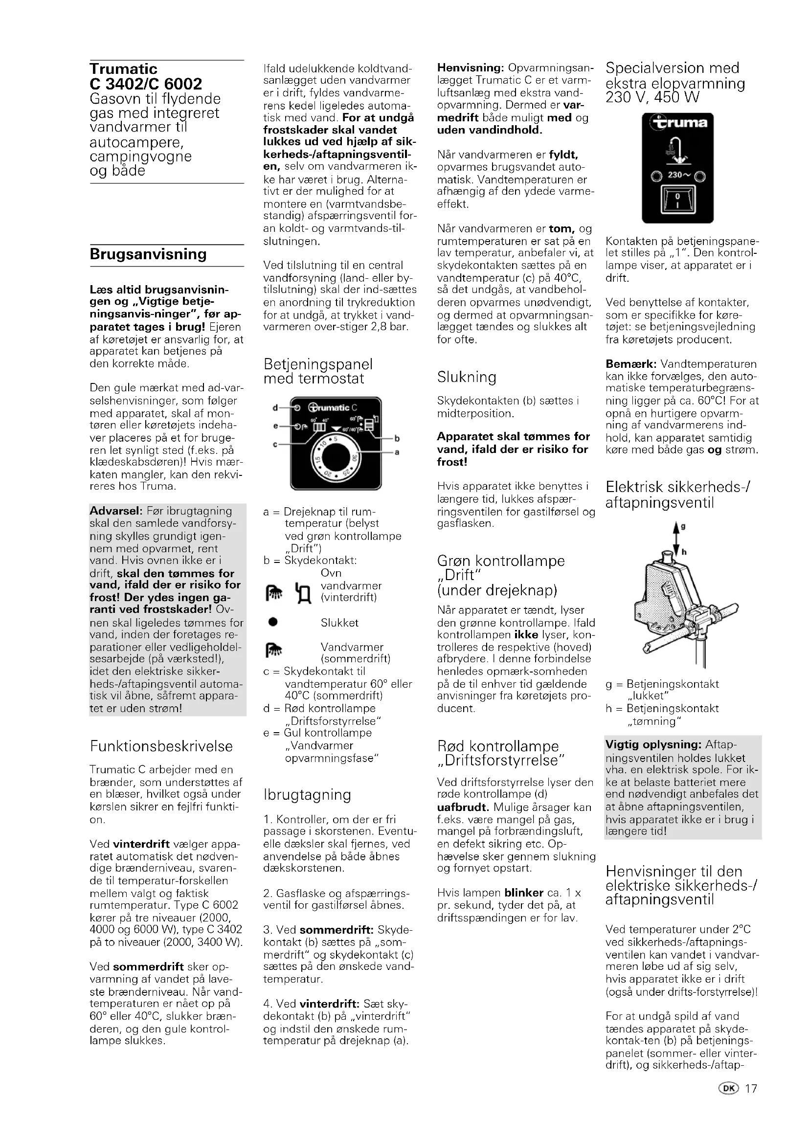 garantieclaim Het adres van de fabrikant luidt: Truma Gerätetechnik GmbH & Co. KG, Wernher- von-Braun-Straße 12, 85640 Putzbrunn. In principe moet in Duitsland altijd de service- afdeling van Truma worden ingelicht. In het buitenland staan hiervoor de verschillen- de servicepartners (zie adres- senlijst) ter beschikking van de klant. Klachten dienen na- der te worden toegelicht. Bo- vendien dient de garantie- oorkonde correct ingevuld te worden overhandigd of moe- ten zowel het serienummer van het apparaat als de koop- datum ervan worden opgege- ven. Om de fabrikant in staat te stellen, te controleren of er sprake is van een geval dat onder de garantie valt, moet de consument het toestel voor zijn risico naar de fabri- kant brengen of naar deze op- sturen. Bij schade aan ver- warmingselementen (warm- tewisselaars) moet ook de gasdrukregelaar worden mee- gestuurd. Bij opsturen naar de fabriek dient het toestel als vracht- goed verzonden te worden. Indien het geval onder de ga- rantie valt, draagt de fabriek de transportkosten resp. kos- ten van opsturen en terugstu- ren. Als niet op garantie aan- spraak kan worden gemaakt, informeert de fabrikant de klant hierover en geeft aan welke kosten niet voor reke- ning van de fabrikant zijn. Bo- vendien zijn in dit geval de verzendkosten voor rekening van de klant.Læs altid brugsanvisnin- gen og „Vigtige betje- ningsanvis-ninger”, før ap- paratet tages i brug! Ejeren af køretøjet er ansvarlig for, at apparatet kan betjenes på den korrekte måde. Den gule mærkat med ad-var- selshenvisninger, som følger med apparatet, skal af mon- tøren eller køretøjets indeha- ver placeres på et for bruge- ren let synligt sted (f.eks. på klædeskabsdøren)! Hvis mær- katen mangler, kan den rekvi- reres hos Truma. Advarsel: Før ibrugtagning skal den samlede vandforsy- ning skylles grundigt igen- nem med opvarmet, rent vand. Hvis ovnen ikke er i drift, skal den tømmes for vand, ifald der er risiko for frost! Der ydes ingen ga- ranti ved frostskader! Ov- nen skal ligeledes tømmes for vand, inden der foretages re- parationer eller vedligeholdel- sesarbejde (på værksted!), idet den elektriske sikker- heds-/aftapingsventil automa- tisk vil åbne, såfremt appara- tet er uden strøm! Funktionsbeskrivelse Trumatic C arbejder med en brænder, som understøttes af en blæser, hvilket også under kørslen sikrer en fejlfri funkti- on. Ved vinterdrift vælger appa- ratet automatisk det nødven- dige brænderniveau, svaren- de til temperatur-forskellen mellem valgt og faktisk rumtemperatur. Type C 6002 kører på tre niveauer (2000, 4000 og 6000 W), type C 3402 på to niveauer (2000, 3400 W). Ved sommerdrift sker op- varmning af vandet på lave- ste brænderniveau. Når vand- temperaturen er nået op på 60° eller 40°C, slukker bræn- deren, og den gule kontrol- lampe slukkes. Specialversion med ekstra elopvarmning 230 V, 450 W Kontakten på betjeningspane- let stilles på „1“. Den kontrol- lampe viser, at apparatet er i drift. Ved benyttelse af kontakter, som er specifikke for køre- tøjet: se betjeningsvejledning fra køretøjets producent. Bemærk: Vandtemperaturen kan ikke forvælges, den auto- matiske temperaturbegræns- ning ligger på ca. 60°C! For at opnå en hurtigere opvarm- ning af vandvarmerens ind- hold, kan apparatet samtidig køre med både gas og strøm. Elektrisk sikkerheds-/ aftapningsventil g = Betjeningskontakt „lukket“ h = Betjeningskontakt „tømning“ Vigtig oplysning: Aftap- ningsventilen holdes lukket vha. en elektrisk spole. For ik- ke at belaste batteriet mere end nødvendigt anbefales det at åbne aftapningsventilen, hvis apparatet ikke er i brug i længere tid! Henvisninger til den elektriske sikkerheds-/ aftapningsventil Ved temperaturer under 2°C ved sikkerheds-/aftapnings- ventilen kan vandet i vandvar- meren løbe ud af sig selv, hvis apparatet ikke er i drift (også under drifts-forstyrrelse)! For at undgå spild af vand tændes apparatet på skyde- kontak-ten (b) på betjenings- panelet (sommer- eller vinter- drift), og sikkerheds-/aftap- Henvisning: Opvarmningsan- lægget Trumatic C er et varm- luftsanlæg med ekstra vand- opvarmning. Dermed er var- medrift både muligt med og uden vandindhold. Når vandvarmeren er fyldt, opvarmes brugsvandet auto- matisk. Vandtemperaturen er afhængig af den ydede varme- effekt. Når vandvarmeren er tom, og rumtemperaturen er sat på en lav temperatur, anbefaler vi, at skydekontakten sættes på en vandtemperatur (c) på 40°C, så det undgås, at vandbehol- deren opvarmes unødvendigt, og dermed at opvarmningsan- lægget tændes og slukkes alt for ofte. Slukning Skydekontakten (b) sættes i midterposition. Apparatet skal tømmes for vand, ifald der er risiko for frost! Hvis apparatet ikke benyttes i længere tid, lukkes afspær- ringsventilen for gastilførsel og gasflasken. Grøn kontrollampe „Drift“ (under drejeknap) Når apparatet er tændt, lyser den grønne kontrollampe. Ifald kontrollampen ikke lyser, kon- trolleres de respektive (hoved) afbrydere. I denne forbindelse henledes opmærk-somheden på de til enhver tid gældende anvisninger fra køretøjets pro- ducent. Rød kontrollampe „Driftsforstyrrelse” Ved driftsforstyrrelse lyser den røde kontrollampe (d) uafbrudt. Mulige årsager kan f.eks. være mangel på gas, mangel på forbrændingsluft, en defekt sikring etc. Op- hævelse sker gennem slukning og fornyet opstart. Hvis lampen blinker ca. 1 x pr. sekund, tyder det på, at driftsspændingen er for lav. Ifald udelukkende koldtvand- sanlægget uden vandvarmer er i drift, fyldes vandvarme- rens kedel ligeledes automa- tisk med vand. For at undgå frostskader skal vandet lukkes ud ved hjælp af sik- kerheds-/aftapningsventil- en, selv om vandvarmeren ik- ke har været i brug. Alterna- tivt er der mulighed for at montere en (varmtvandsbe- standig) afspærringsventil for- an koldt- og varmtvands-til- slutningen. Ved tilslutning til en central vandforsynin