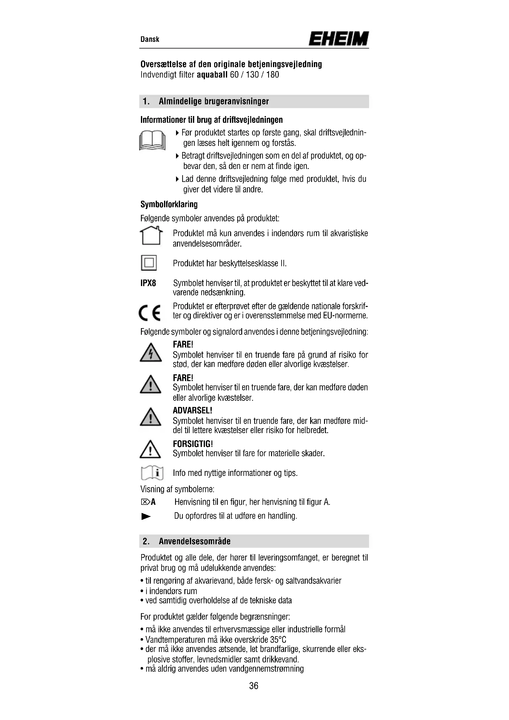 Informationer til brug af driftsvejledningen 4 Før produktet startes op første gang, skal driftsvejlednin- gen læses helt igennem og forstås. 4 Betragt driftsvejledningen som en del af produktet, og op- bevar den, så den er nem at finde igen. 4 Lad denne driftsvejledning følge med produktet, hvis du giver det videre til andre. Symbolforklaring Følgende symboler anvendes på produktet: Produktet må kun anvendes i indendørs rum til akvaristiske anvendelsesområder. Produktet har beskyttelsesklasse II. IPX8 Symbolet henviser til, at produktet er beskyttet til at klare ved- varende nedsænkning. Produktet er efterprøvet efter de gældende nationale forskrif- ter og direktiver og er i overensstemmelse med EU-normerne. Følgende symboler og signalord anvendes i denne betjeningsvejledning: FARE! Symbolet henviser til en truende fare på grund af risiko for stød, der kan medføre døden eller alvorlige kvæstelser. FARE! Symbolet henviser til en truende fare, der kan medføre døden eller alvorlige kvæstelser. ADVARSEL! Symbolet henviser til en truende fare, der kan medføre mid- del til lettere kvæstelser eller risiko for helbredet. FORSIGTIG! Symbolet henviser til fare for materielle skader. Info med nyttige informationer og tips. Visning af symbolerne: ⌦A Henvisning til en figur, her henvisning til figur A.
