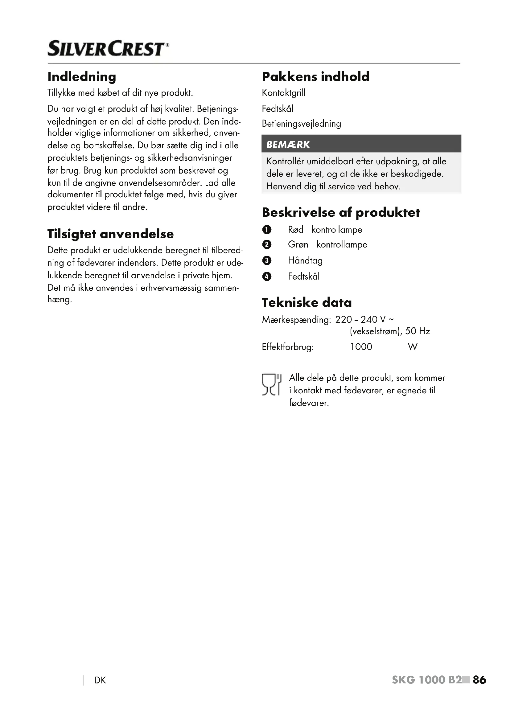 DK Indledning Tillykke med købet af dit nye produkt. Du har valgt et produkt af høj kvalitet. Betjenings- vejledningen er en del af dette produkt. Den inde- holder vigtige informationer om sikkerhed, anven- delse og bortskaffelse. Du bør sætte dig ind i alle produktets betjenings- og sikkerhedsanvisninger før brug. Brug kun produktet som beskrevet og kun til de angivne anvendelsesområder. Lad alle dokumenter til produktet følge med, hvis du giver produktet videre til andre. Tilsigtet anvendelse Dette produkt er udelukkende beregnet til tilbered- ning af fødevarer indendørs. Dette produkt er ude- lukkende beregnet til anvendelse i private hjem. Det må ikke anvendes i erhvervsmæssig sammen- hæng. Pakkens indhold Kontaktgrill Fedtskål Betjeningsvejledning BEMÆRK Kontrollér umiddelbart efter udpakning, at alle dele er leveret, og at de ikke er beskadigede. Henvend dig til service ved behov. Beskrivelse af produktet 1 Rød kontrollampe 2 Grøn kontrollampe 3 Håndtag 4 Fedtskål Tekniske data Mærkespænding: 220 – 240 V ∼ (vekselstrøm), 50 Hz Effektforbrug: 1000 W Alle dele på dette produkt, som kommer i kontakt med fødevarer, er egnede til fødevarer.SKG 1000 B2 DK