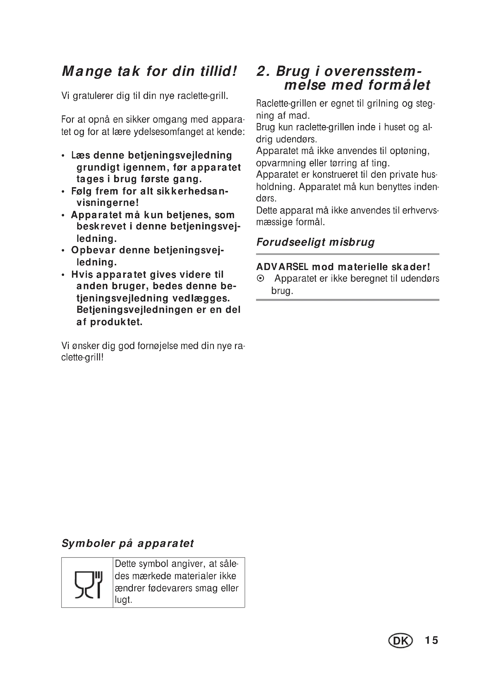 melse med formålet Raclette-grillen er egnet til grilning og steg- ning af mad. Brug kun raclette-grillen inde i huset og al- drig udendørs. Apparatet må ikke anvendes til optøning, opvarmning eller tørring af ting. Apparatet er konstrueret til den private hus- holdning. Apparatet må kun benyttes inden- dørs. Dette apparat må ikke anvendes til erhvervs- mæssige formål. Forudseeligt misbrug ADVARSEL mod materielle skader! ~ Apparatet er ikke beregnet til udendørs brug. Dette symbol angiver, at såle- des mærkede materialer ikke ændrer fødevarers smag eller lugt.16