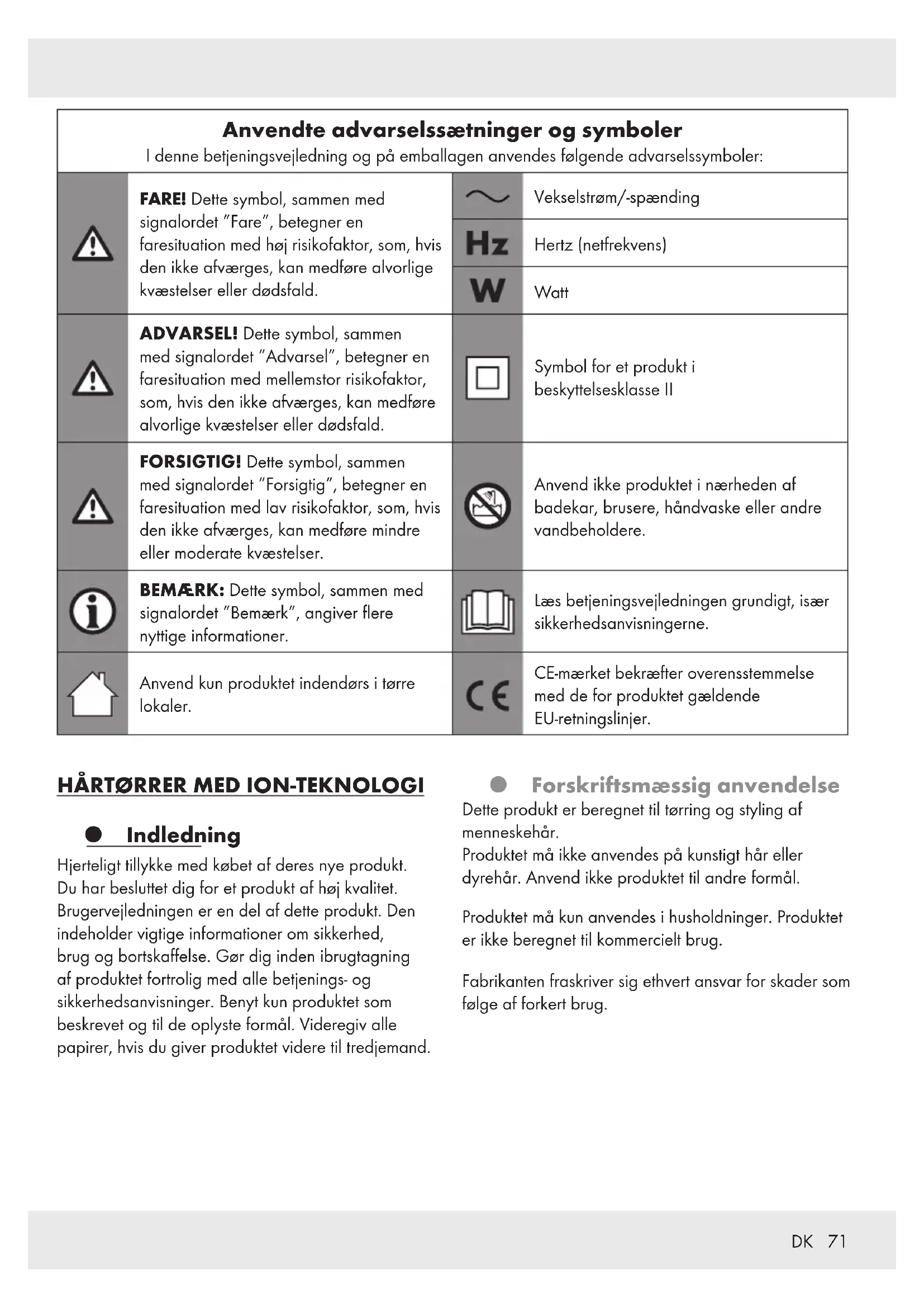 SMÅBØRN OG BØRN! Børn må ikke efterlades med emballagen uden opsyn. Emballagen udgør en kvælningsrisiko. Børn undervurderer ofte de dermed forbundne farer. Hold emballagen uden for børns rækkevidde.73DK Dette produkt kan anvendes af børn fra 8år og opefter, samt af personer med reducerede, fysiske, sensoriske eller mentale færdigheder eller mangel på erfaring og kundskaber, hvis de er under opsyn, eller hvis de er instrueret i sikker brug af produktet og indforstået med de risici, der er forbundet hermed. Børn må ikke lege med produktet. Rengøring og vedligeholdelse må ikke udføres af børn uden opsyn. Tilsigtet anvendelse m ADVARSEL! Enhver uautoriseret brug kan medføre kvæstelser. Anvend kun produktet i henhold til denne vejledning. Elektrisk sikkerhed m FARE! Fare for elektriske stød! Forsøg ikke at reparere produktet selv. Ved funktionsfejl skal reparationer udføres af kvalificerede medarbejdere. m ADVARSEL! Fare for elektriske stød! Produktet må aldrig nedsænkes i vand eller andre væsker. Hold aldrig produktet under rindende vand. m ADVARSEL! Fare for elektriske stød! Anvend aldrig et beskadiget produkt. Afbryd produktet fra netspændingen, og ret henvendelse til forhandleren, hvis det er beskadiget. Før produktet tilsluttes til netspændingen, skal det kontrolleres om spænding og netfrekvens svarer til oplysningerne på produktets typeskilt. Kontrollér jævnligt netstik og netledning for skader. Hvis produktets netledning er beskadiget, skal det udskiftes af producenten eller dennes kundeservice eller en tilsvarende kvalificeret person for at undgå farer.74 DK Beskyt netledningen mod skader. Lad den ikke hænge over skarpe kanter, og knæk eller bøj den ikke. Netledningen skal holdes væk fra varme overflader og åben ild. Som ekstra sikkerhedsforanstaltning anbefales det at montere et fejlstrømsrelæ (HFI/VFI) med en udløserstrøm på ikke over 30mA i badeværelsets sikringsgruppe. Kontakt din elinstallatør for dette. Anvendelse af forlængerledninger anbefales ikke. Hvis det er nødvendigt at anvende en forlængerledning, skal den have en kapacitet på mindst 10 A. Anbring forlængerledningen således, at ingen kan snuble over den, og at den ikke kan blive beskadiget. Betjening m ADVARSEL! Fare for elektriske stød! Anvend ikke produktet i nærheden af badekar, brusere, håndvaske eller andre fyldte vandbeholdere. Produktet må ikke være uden opsyn, så længe det er tilkoblet netspændingen. Grib ikke fat i produktet med fugtige hænder, og stå ikke på et vådt gulv, når den er i drift. Tag aldrig fat i netstikket med våde eller fugtige hænder. Træk i netstikket og ikke i netledningen for at tage netstikket ud af stikkontakten. Netledningen må ikke vikles omkring produktet. Beskyt produktet, netledningen og netstikket mod støv, direkte sol, vanddråber og -stænk. Afbryd altid for produktet før –Tilbehørsdele udskiftes, –Produktet rengøres, –Produktet afbrydes fra netspændingen. Hvis produktet anvendes i et badeværelse, skal det afbrydes fra netspændingen efter brug, idet den nære kontakt med vand udgør en fare, uanset om produktet er slukket.75DK Rengøring og opbevaring Opbevar produktet på et køligt, tørt sted, beskyttet mod fugt og uden for børns rækkevidde. Før første ibrugtagning Fjern alle emballager. Kontrollér, at alle dele er komplette. BEMÆRK: Produktet kan afgive lugte ved første anvendelse. Dette handler om produktions- og transportrester, som hurtigt forsvinder. Betjening Hårtørring (Fig.A) Tilslut netstikket[4] til en egnet stikkontakt. Indstil de ønskede lufthastigheds- og varmetrin (Fig.B): / / [5] Lufthastighed (Omskifterstilling) Produkt slukket Produkt til: lav lufthastighed Produkt til: høj lufthastighed / / [6] Varme (Omskifterstilling) Ingen varme Middel varme Høj varme Efter brug: Vælg [5], for at slukke produktet. Træk netstikket[4] ud af stikkontakten. Hårstyling Anvend smal stylingdyse Sæt den smalle stylingdyse[9] på luftudblæsningen[8]. Drej den smalle stylingdyse[9], for at ændre positionen. Tænd derefter produktet. Anvend den smalle stylingdyse[9], for at rette luftstrømmen mod et bestemt område i håret. BEMÆRK: Til hårstyling anbefaler vi at anvende en lav lufthastighed ( [5]) og et lavt varmetrin ( [6]). mFORSIGTIG! Fjern ikke den smalle stylingdyse[9], når den er varm. Anvendelse af diffuser Sæt diffuseren[] på luftudblæsningen[8]. Tænd derefter produktet. Brug diffuseren[] til at lave krøller og bløde bølger i lokker og spidser samt for at få fylde og volumen ved hårrødderne. BEMÆRK: Til langt hår: Træk diffuseren[] mod spidserne, og lav bløde bølger fra spidserne til hårrødderne. Til kort hår: Brug diffuseren[] ved hårrødderne for at skabe fylde og volumen. mFORSIGTIG! Tag ikke diffuseren[] af, mens den stadig er varm.76 DK Køling Brug kølefunktionen for at forlænge stylingens holdbarhed: [7] Kold luftstrøm Hold tasten nedtrykt Kold luftstrøm er til Slip tasten Kold luftstrøm stopper BEMÆRK: Kølefunktionen ( [7]) virker ikke med varmetrin indstillet på ”Ingen varme” ( [6]). Hvis produktet ikke virker skal det afbrydes fra netspændingen. Lad produktet afkøle. Ioniseringsfunktion Produktet afgiver kontinuerligt ioner til håret. Derved reduceres statisk elektricitet i håret og forbedrer dets evne til at blive stylet. Håret bliver blødt, glat, glansfuldt og nemmere at style. BEMÆRK: Vi anbefaler brug uden tilbehør for optimal effekt af ionerne. Rengøring og vedligeholdelse mFARE! Fare for elektriske stød! Før rengøring skal produktet altid afbrydes og netstikket[4] trækkes ud af stikkontakten. mADVARSEL! Produktets elektriske dele må aldrig nedsænkes i vand eller andre væsker. Hold aldrig produktet under rindende vand. mFORSIGTIG! Anvend ikke ætsende eller skurende rengøringsmidler eller materialer til rengøring af produktet. Rengøring af kabinet, smal stylingdyse og diffuser Fjern stylingdysen[9] eller dif