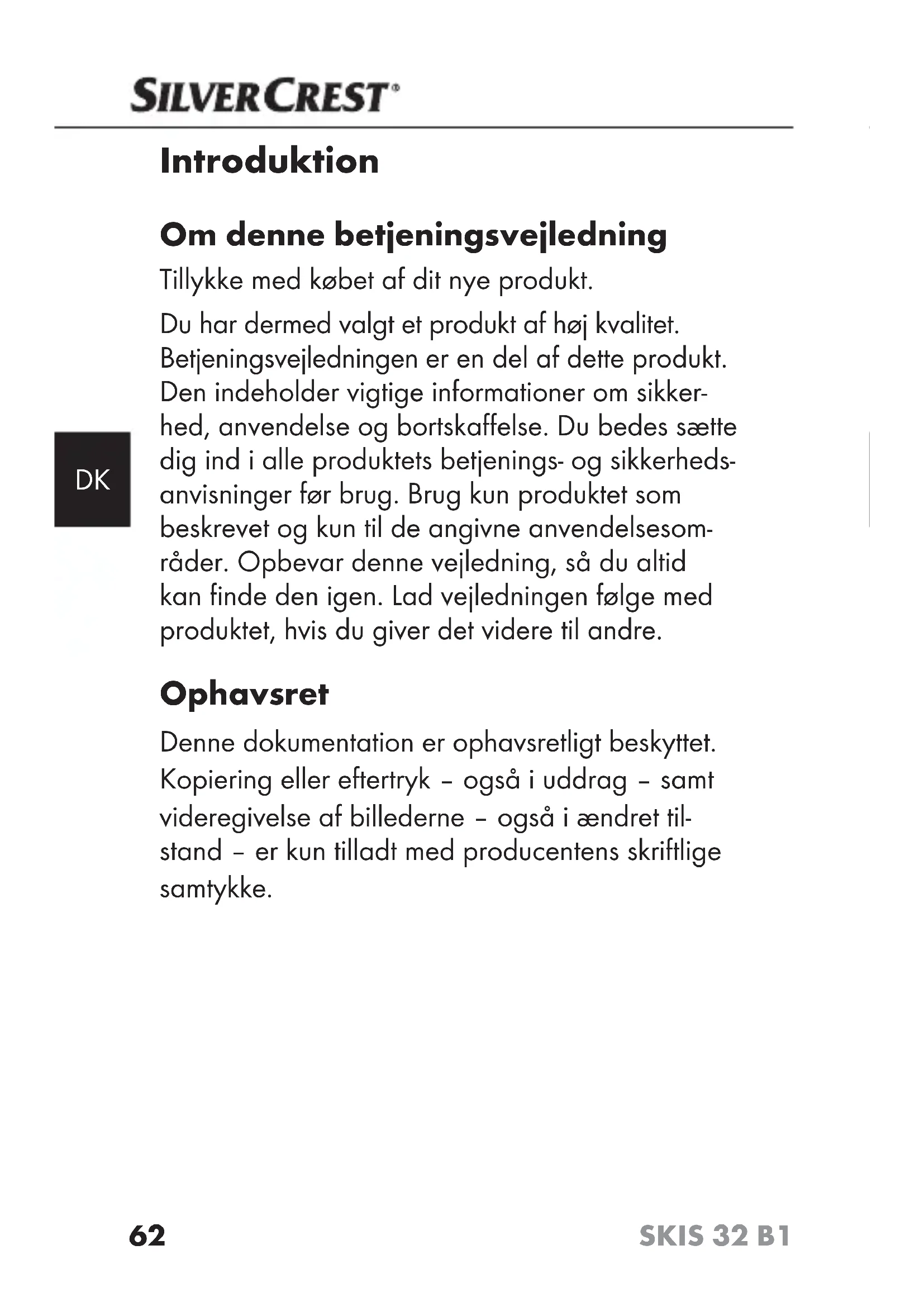 SKIS 32 B1 Introduktion Om denne betjeningsvejledning Tillykke med købet af dit nye produkt. Du har dermed valgt et produkt af høj kvalitet. Betjeningsvejledningen er en del af dette produkt. Den indeholder vigtige informationer om sikker- hed, anvendelse og bortskaffelse. Du bedes sætte dig ind i alle produktets betjenings- og sikkerheds- anvisninger før brug. Brug kun produktet som beskrevet og kun til de angivne anvendelsesom- råder. Opbevar denne vejledning, så du altid kan finde den igen. Lad vejledningen følge med produktet, hvis du giver det videre til andre. Ophavsret Denne dokumentation er ophavsretligt beskyttet. Kopiering eller eftertryk – også i uddrag – samt videregivelse af billederne – også i ændret til- stand – er kun tilladt med producentens skriftlige samtykke.63 SKIS 32 B1