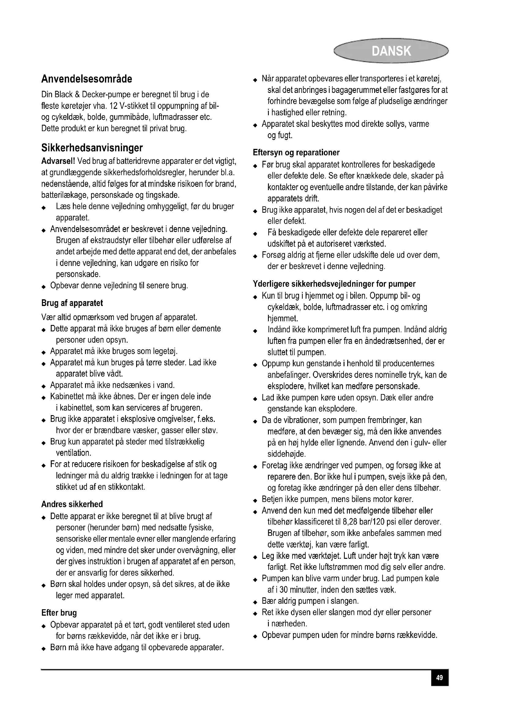 Din Black & Decker-pumper er beregnet til drug i de flete koretjoer vha. 12 V-stikket til oppumpning af bilog cykeldæk, bolde, gummibade, luftmadrasser etc. Dette produit er kun beregnet til privat drug.